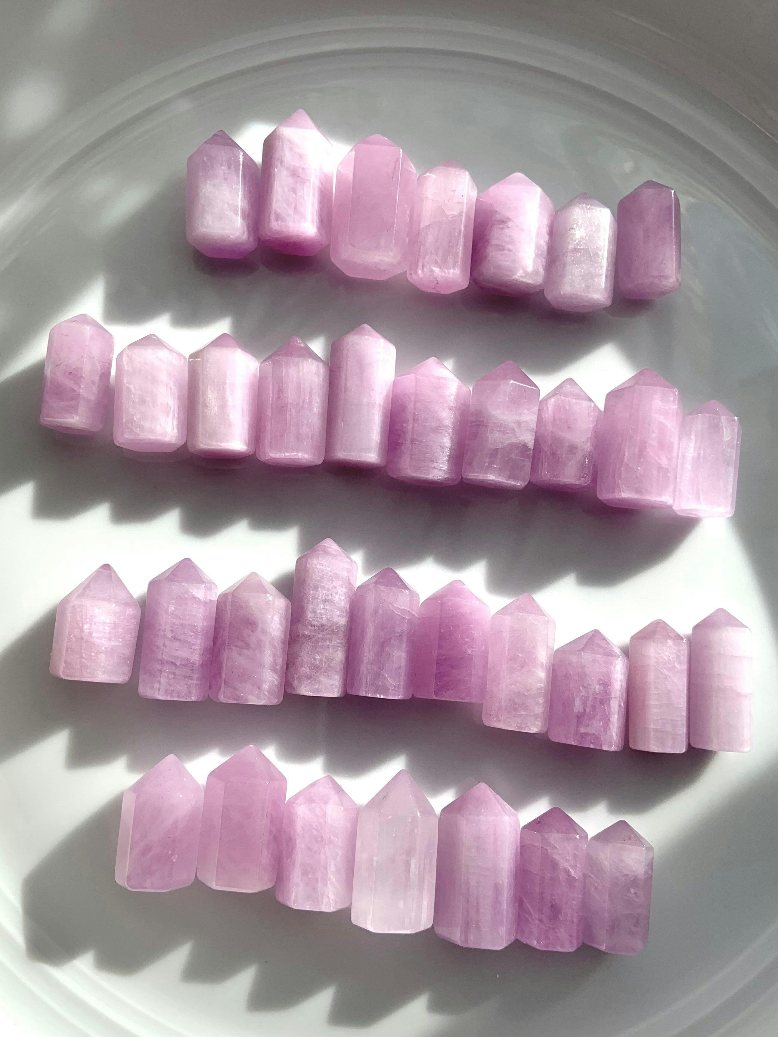 Kunzite is a Spodumene, a lithium aluminum silicate, the pink comes from the mineral manganese within the crystal. These points are from Madagascar.