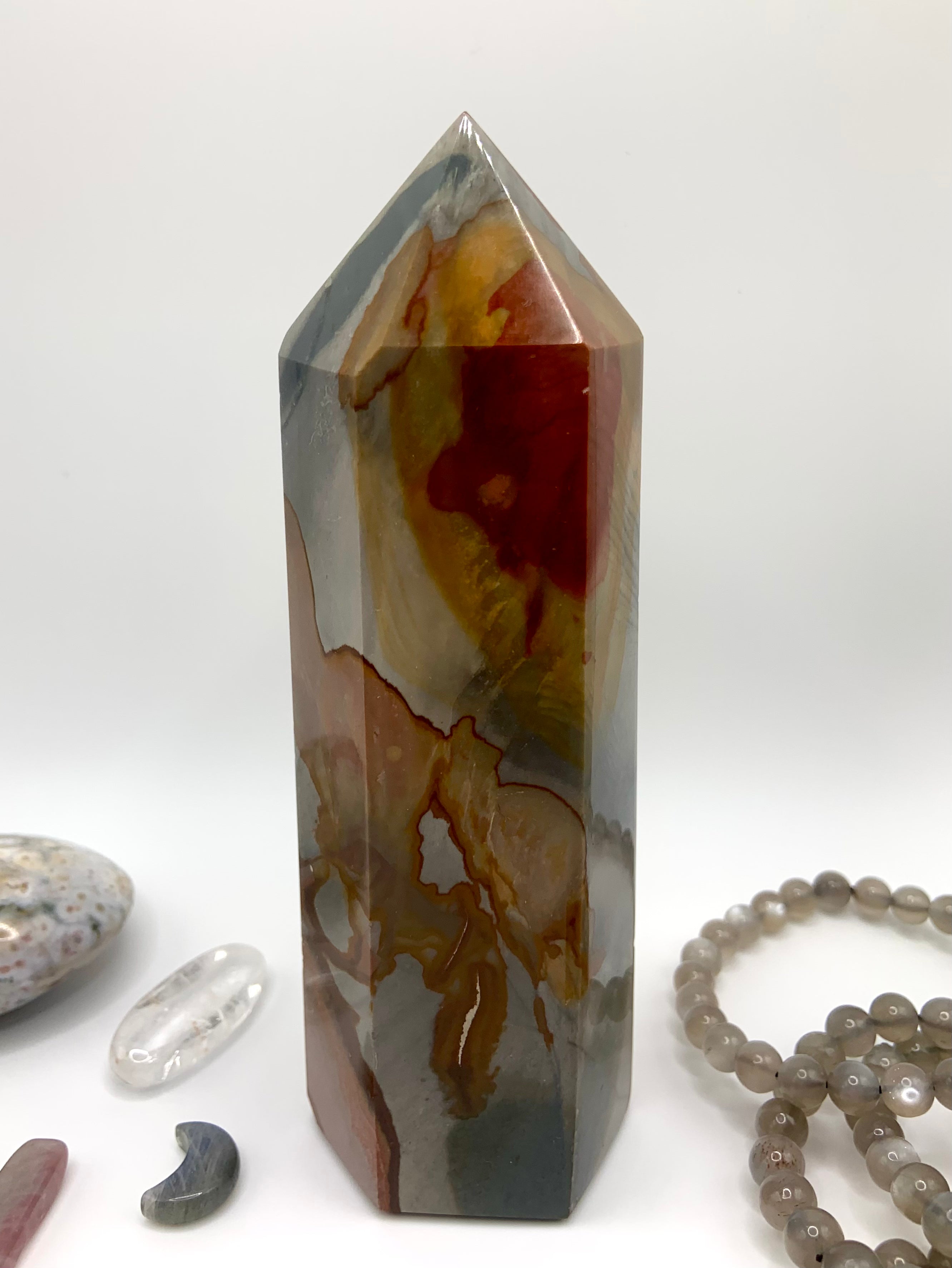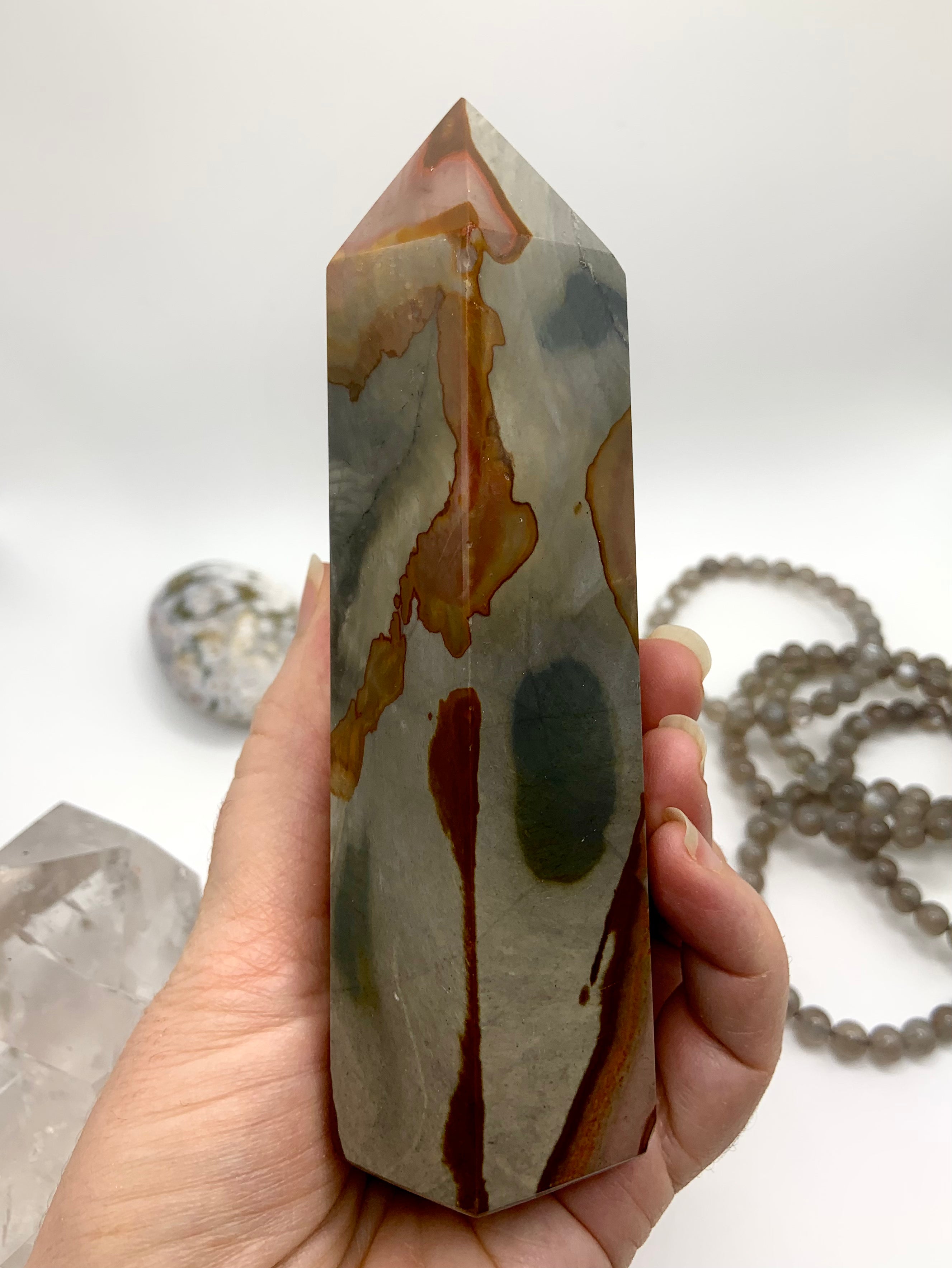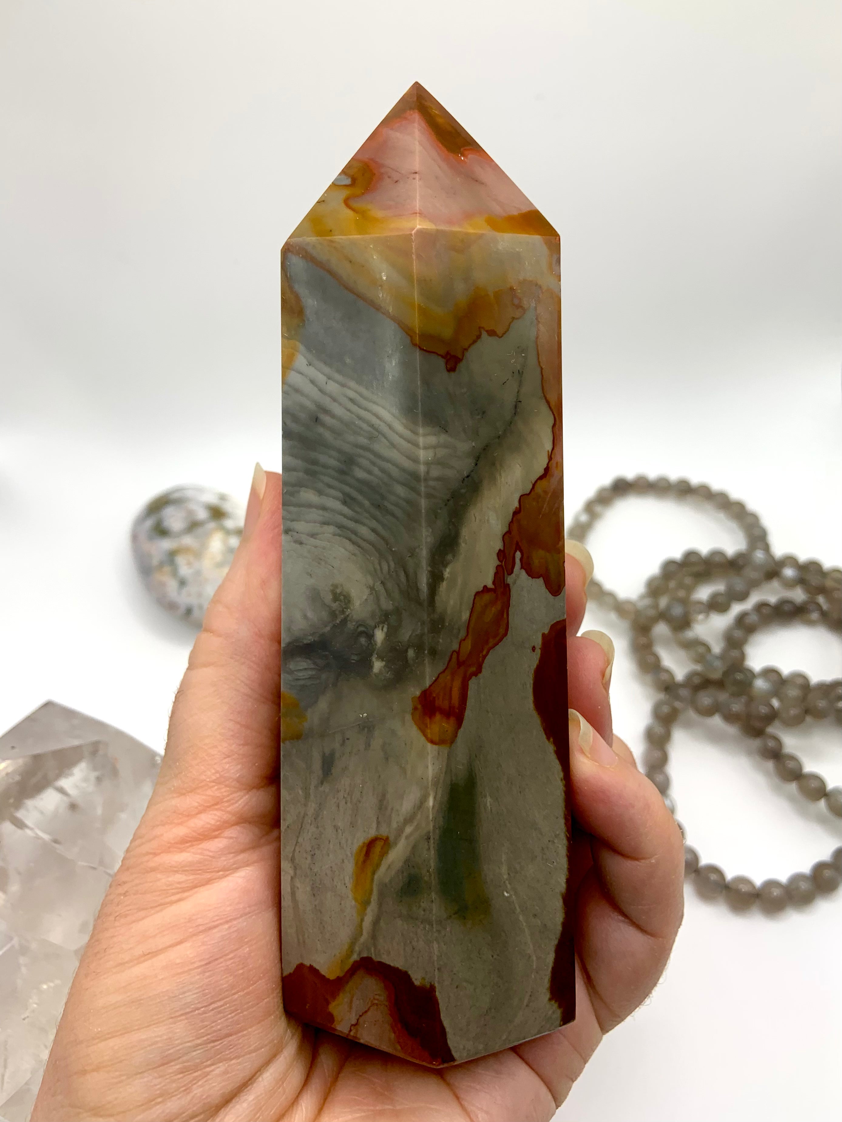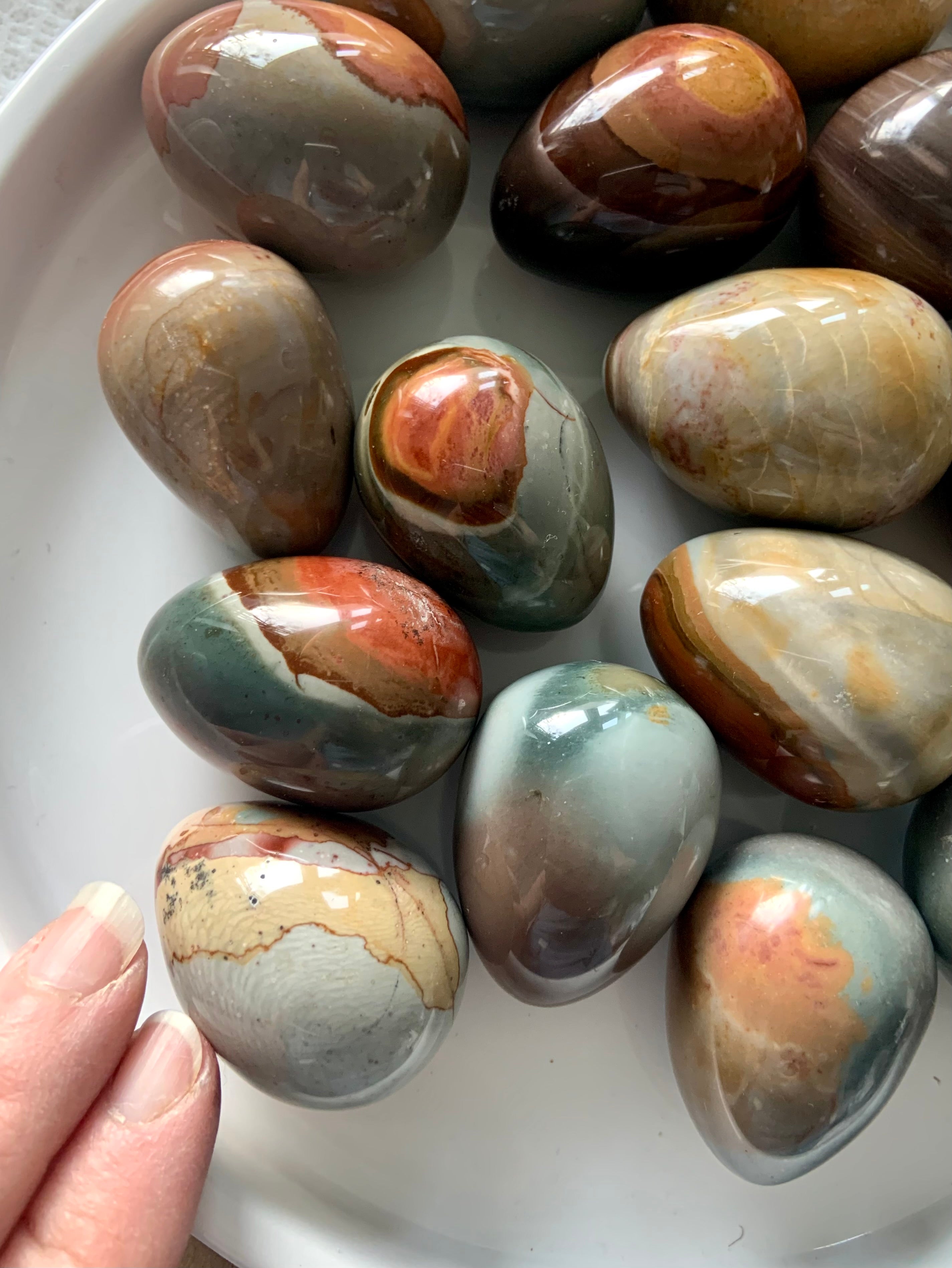 Polychrome Jasper—also known as Desert Jasper—is a richly patterned Fire Element stone that embodies the vibrant, evolving energy of the Earth. Swirled with warm, grounding tones of red, tan, pink, orange, seafoam green, slate gray, and teal, each piece tells a story through its unique, painterly layers formed by mineral inclusions.