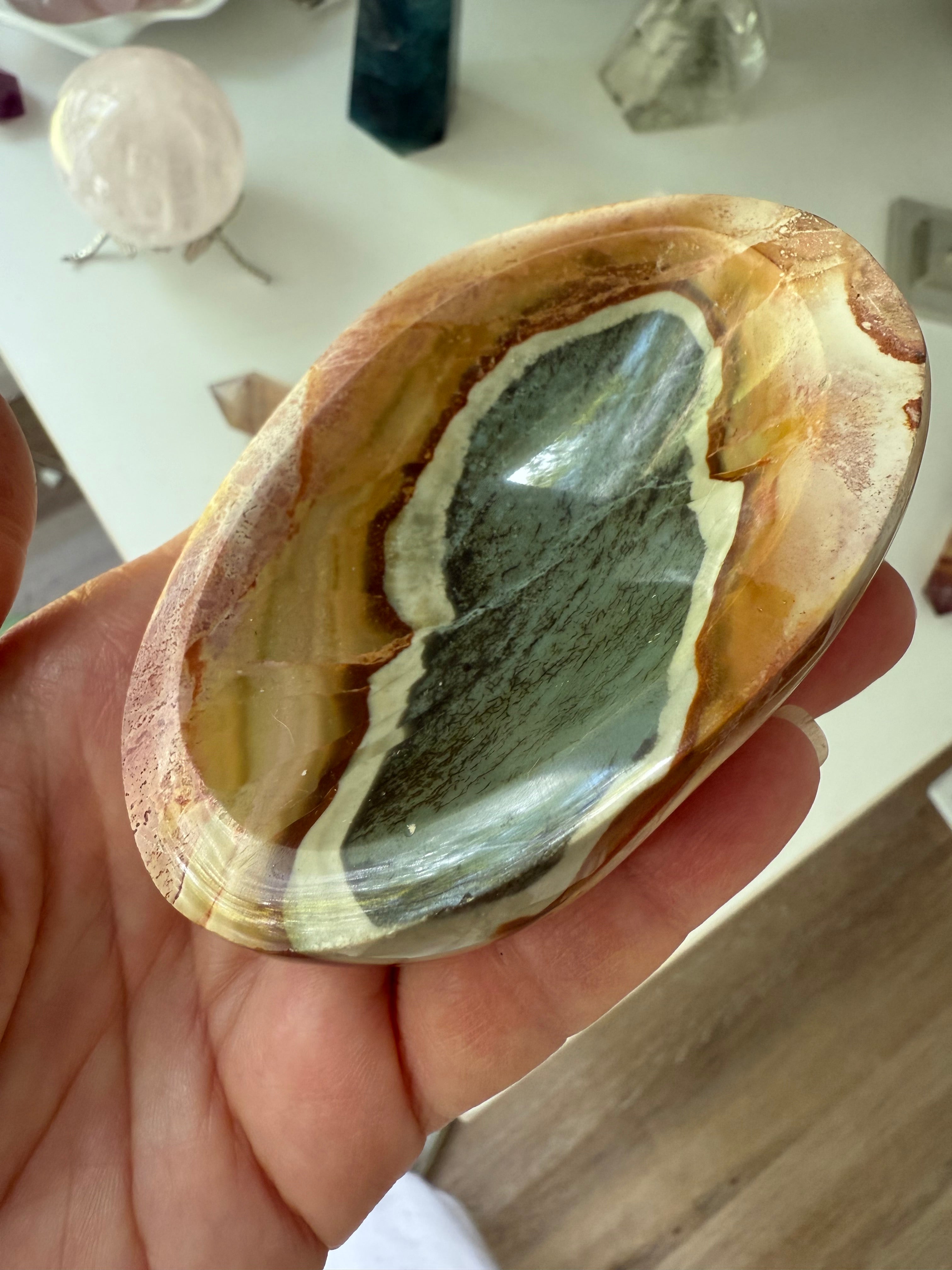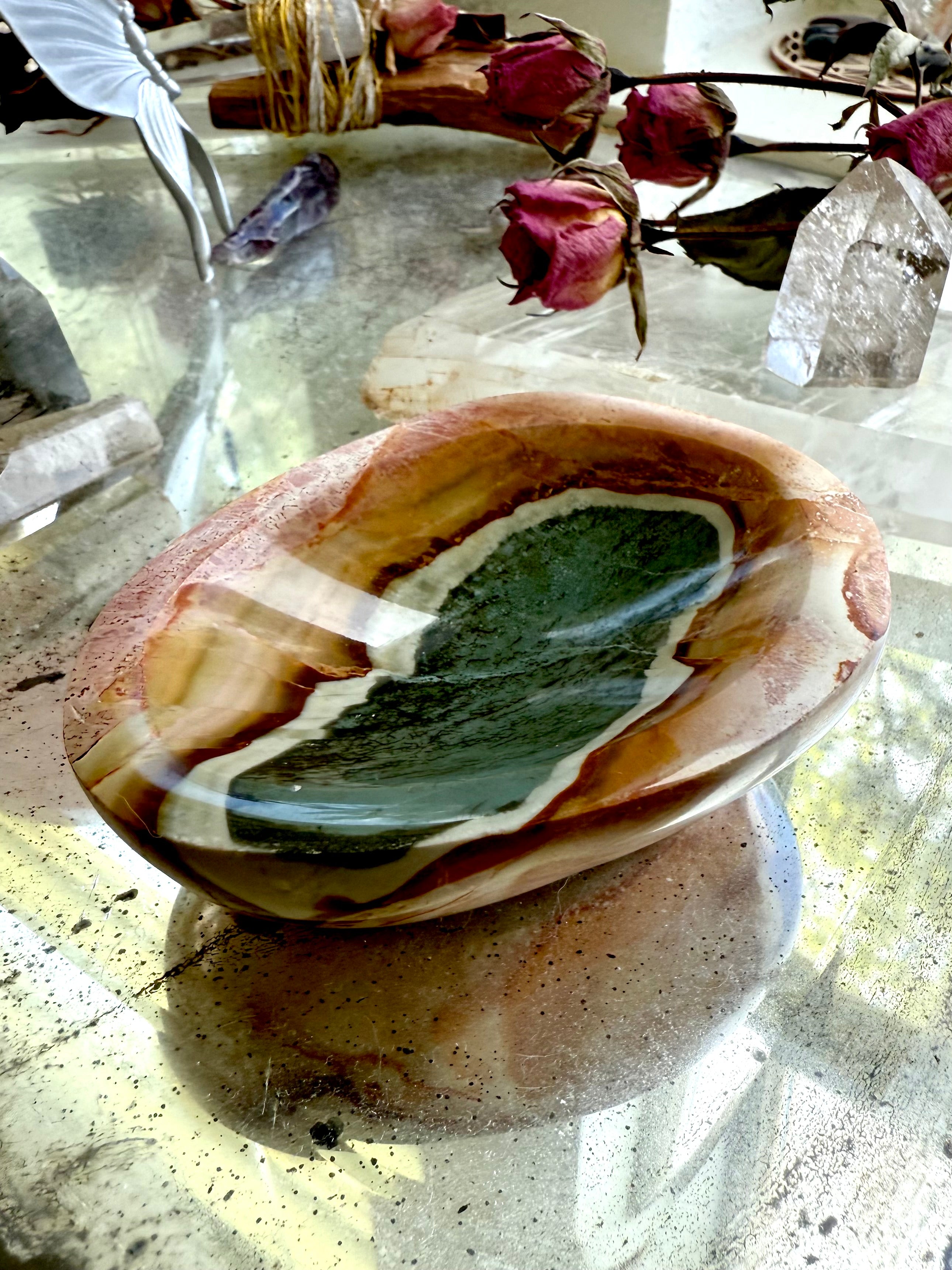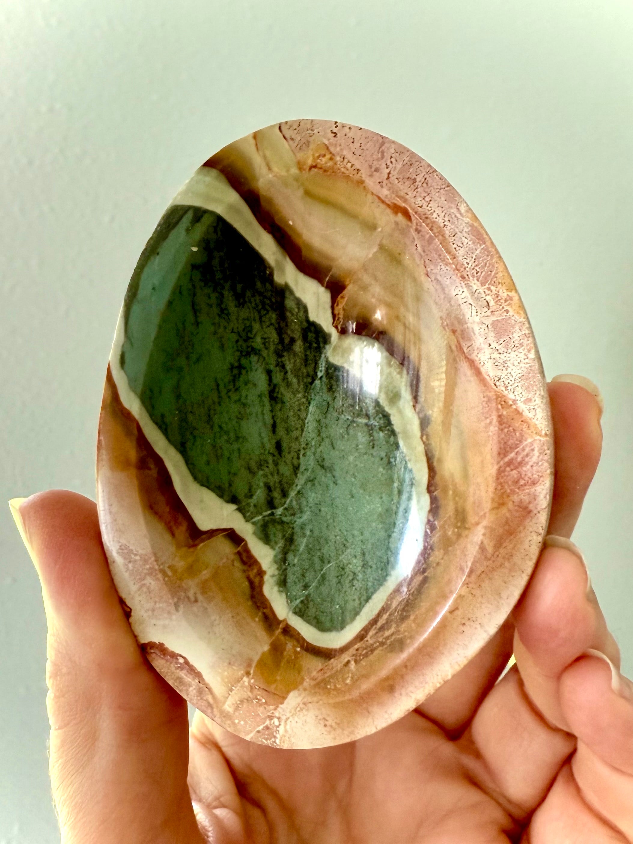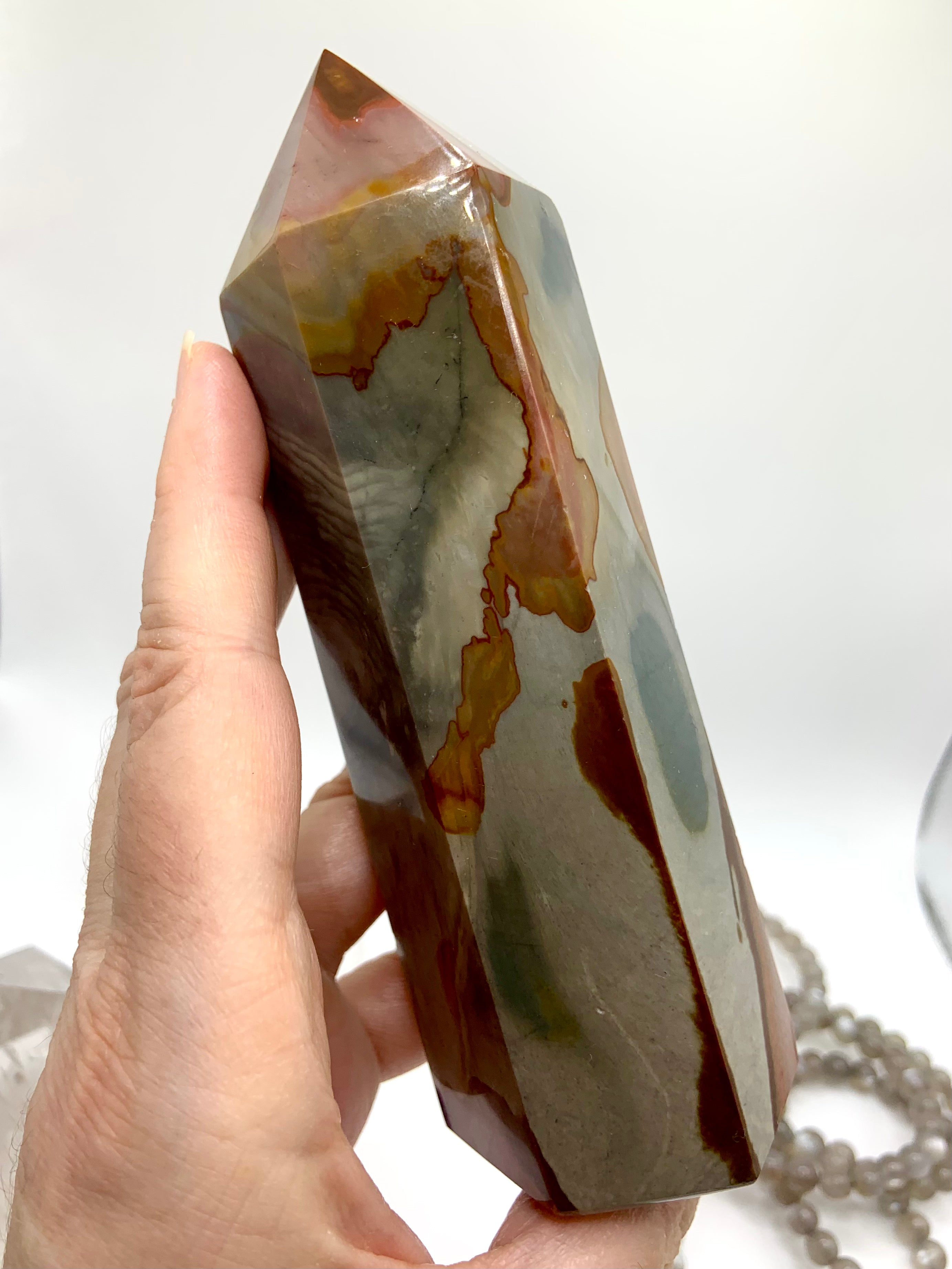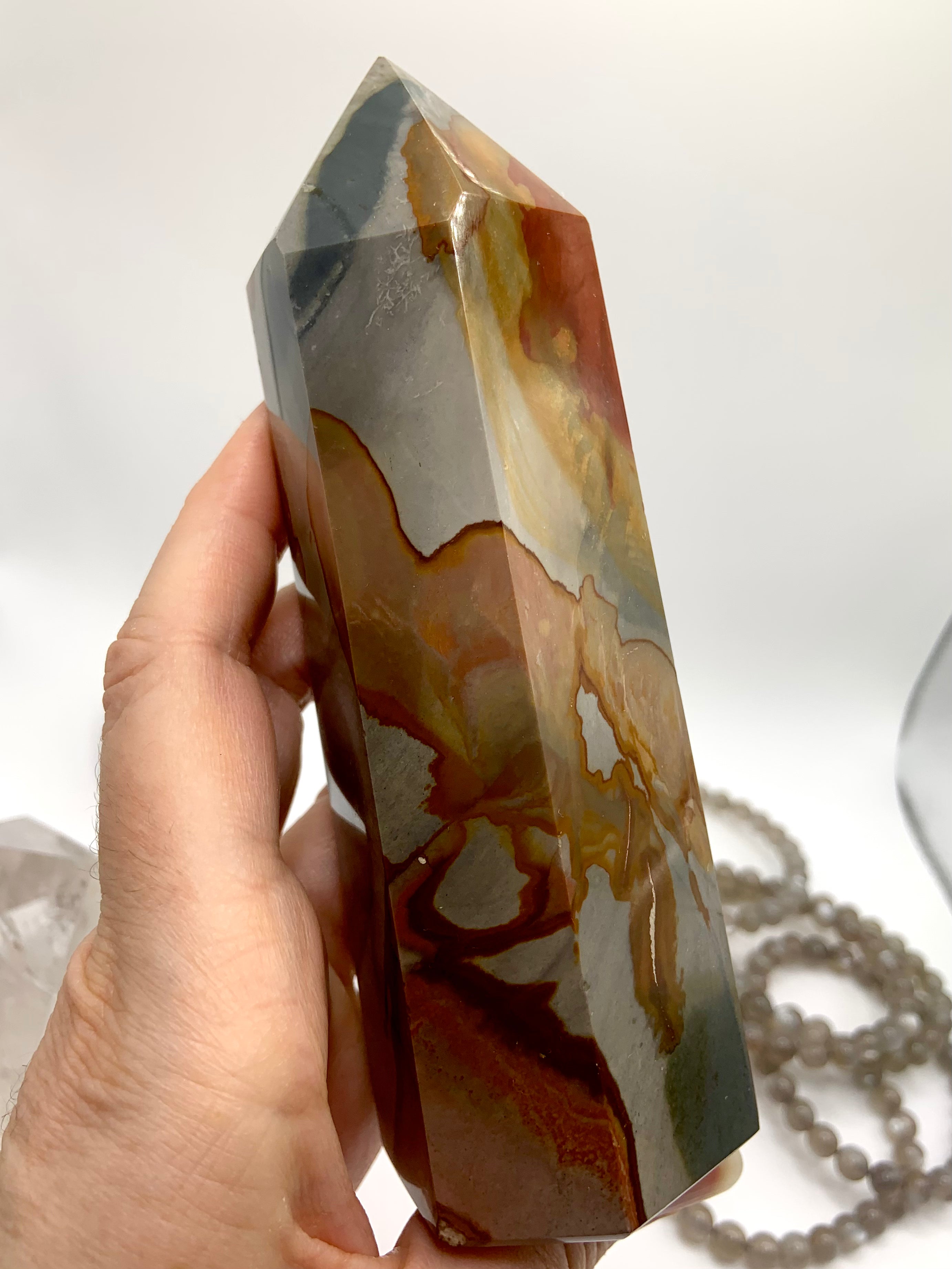 Polychrome Jasper—also known as Desert Jasper—is a richly patterned Fire Element stone that embodies the vibrant, evolving energy of the Earth. Swirled with warm, grounding tones of red, tan, pink, orange, seafoam green, slate gray, and teal, each piece tells a story through its unique, painterly layers formed by mineral inclusions.