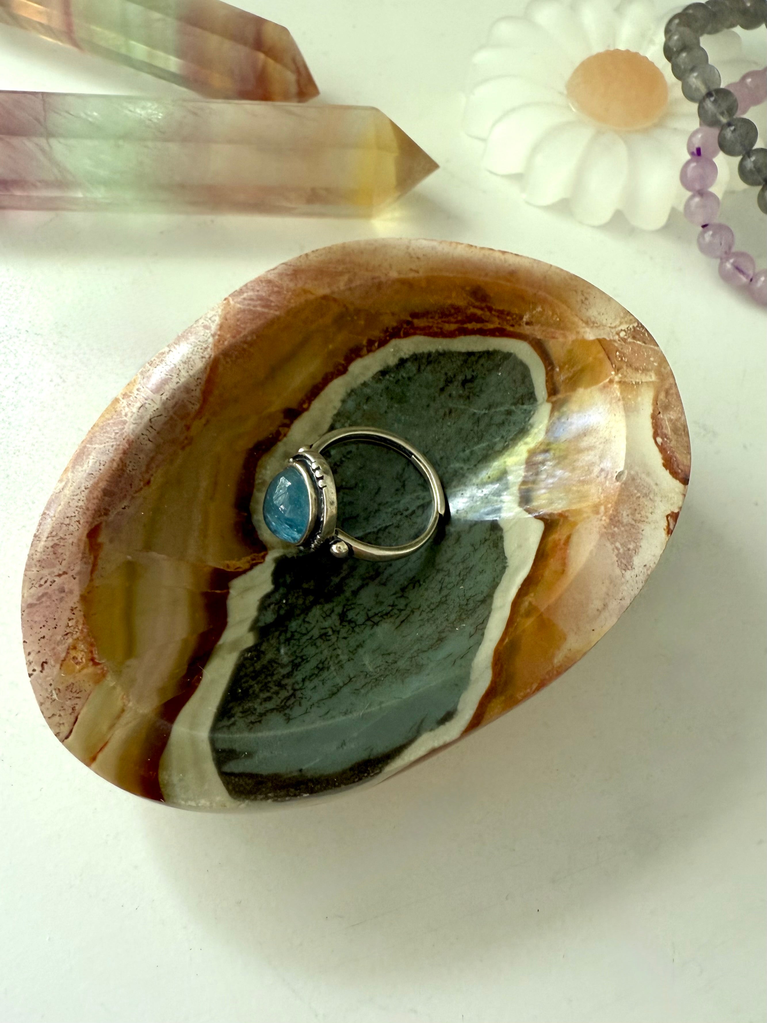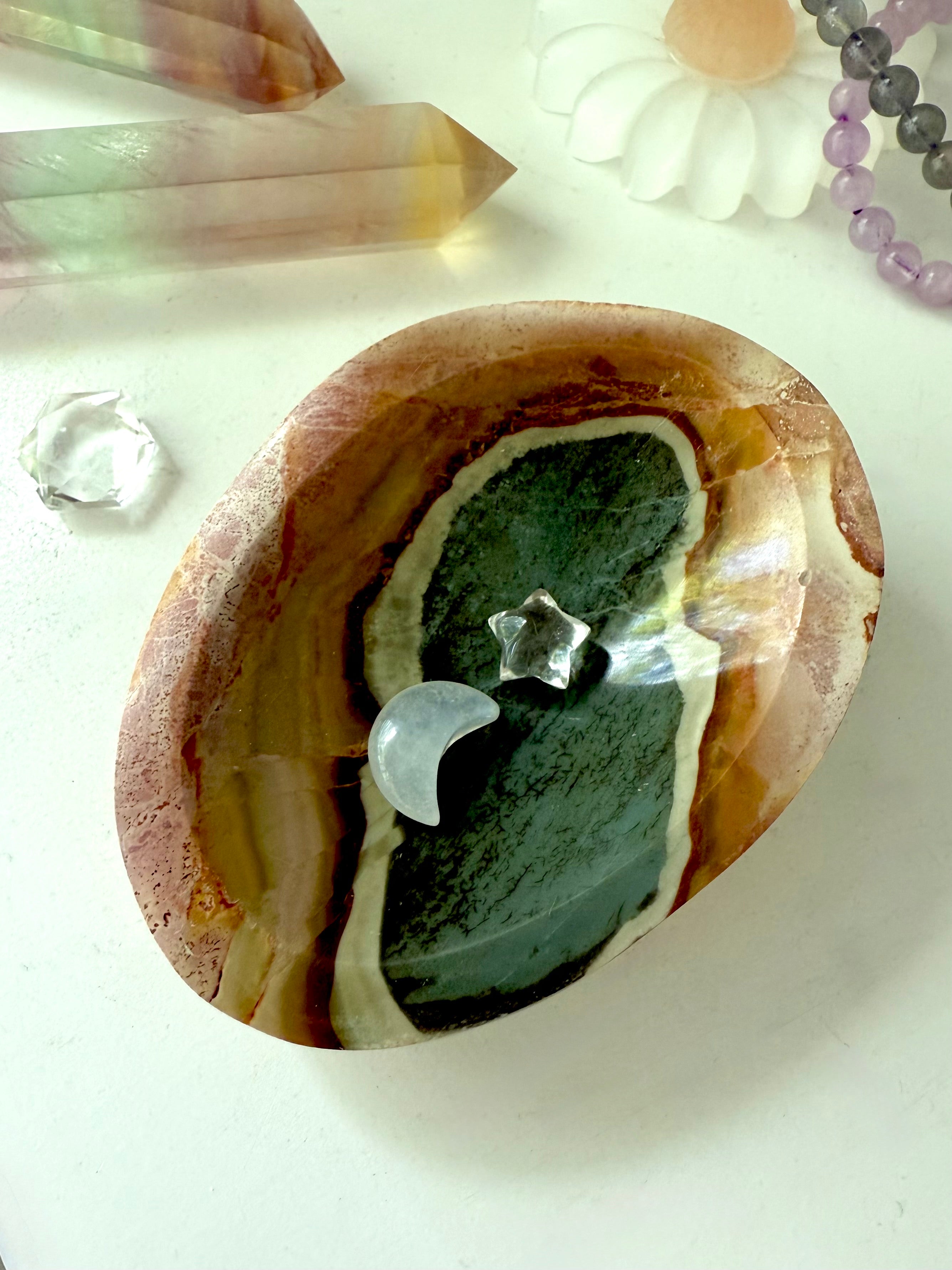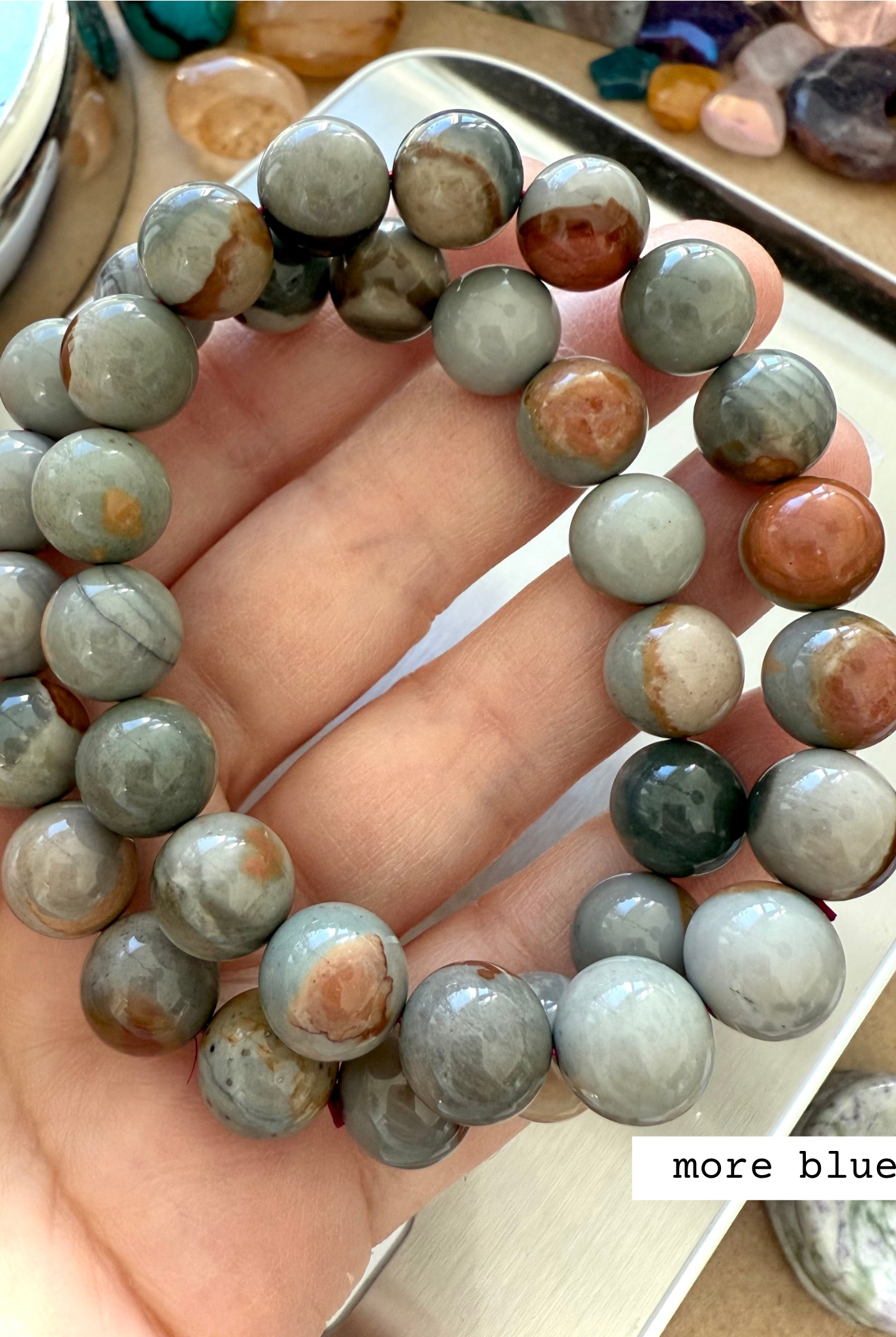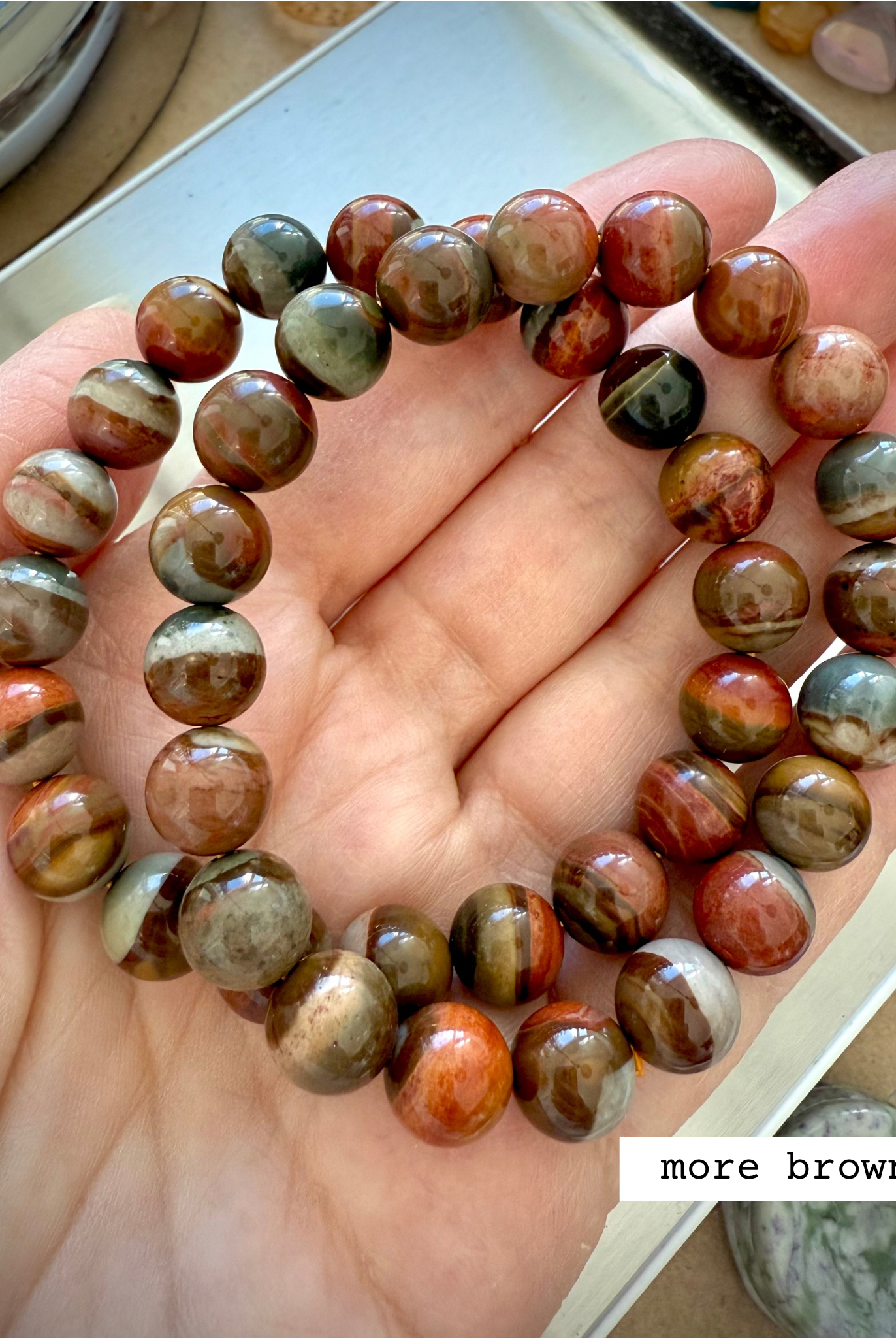 Polychrome Jasper—also known as Desert Jasper—is a richly patterned Fire Element stone that embodies the vibrant, evolving energy of the Earth. Swirled with warm, grounding tones of red, tan, pink, orange, seafoam green, slate gray, and teal, each piece tells a story through its unique, painterly layers formed by mineral inclusions.