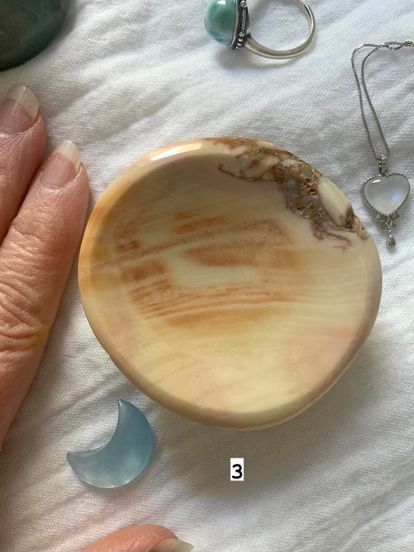 These sweet hand carved Polychrome Jasper Bowls are a work of art that will make a beautiful addition to your crystal decor. These little one of a kind natural stone bowls are perfect for holding your special things, jewelry + crystals, or for using in sacred ceremony.