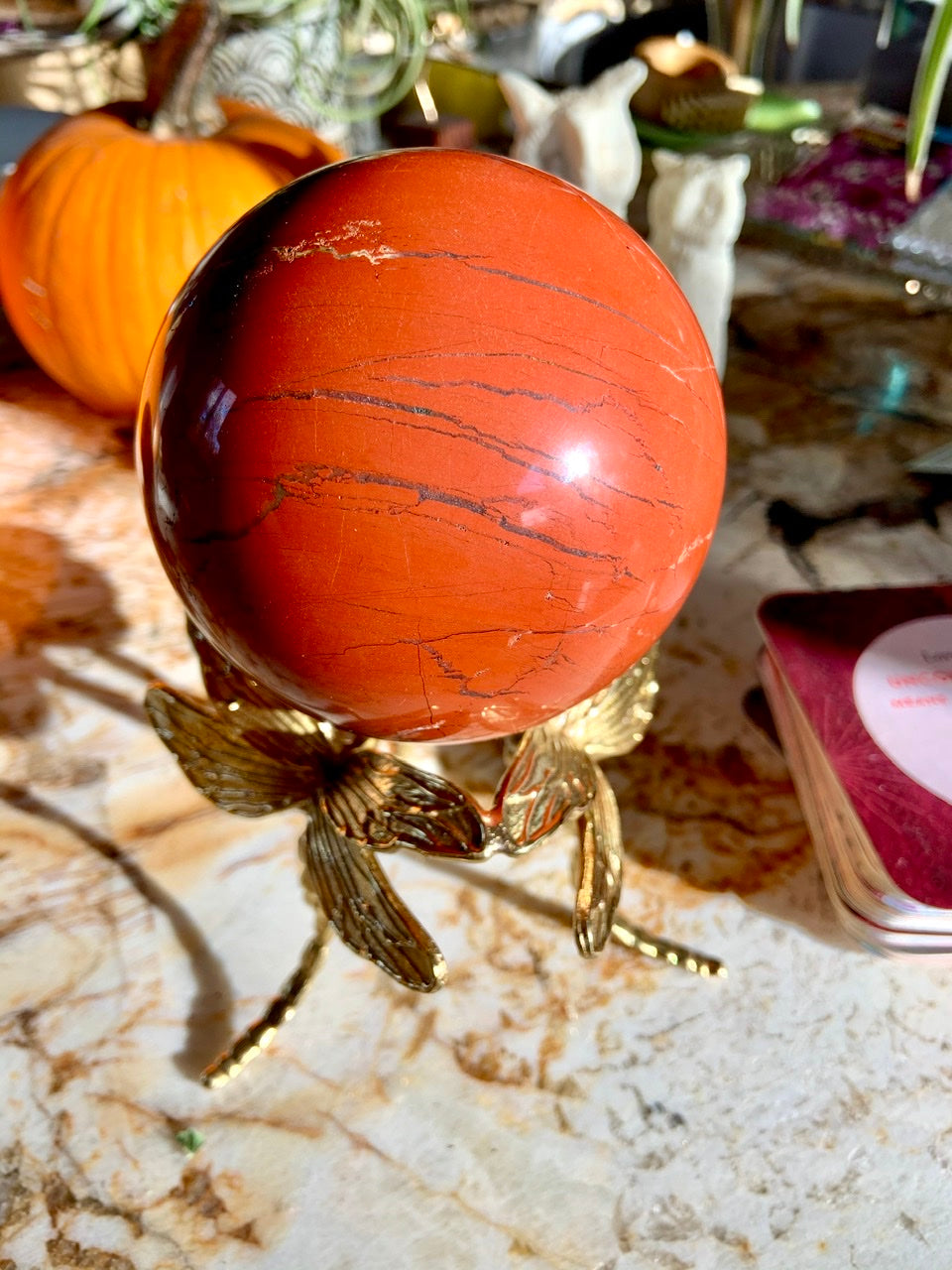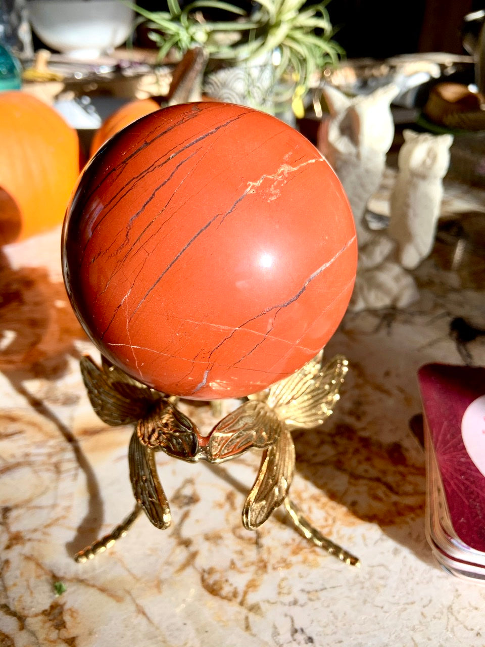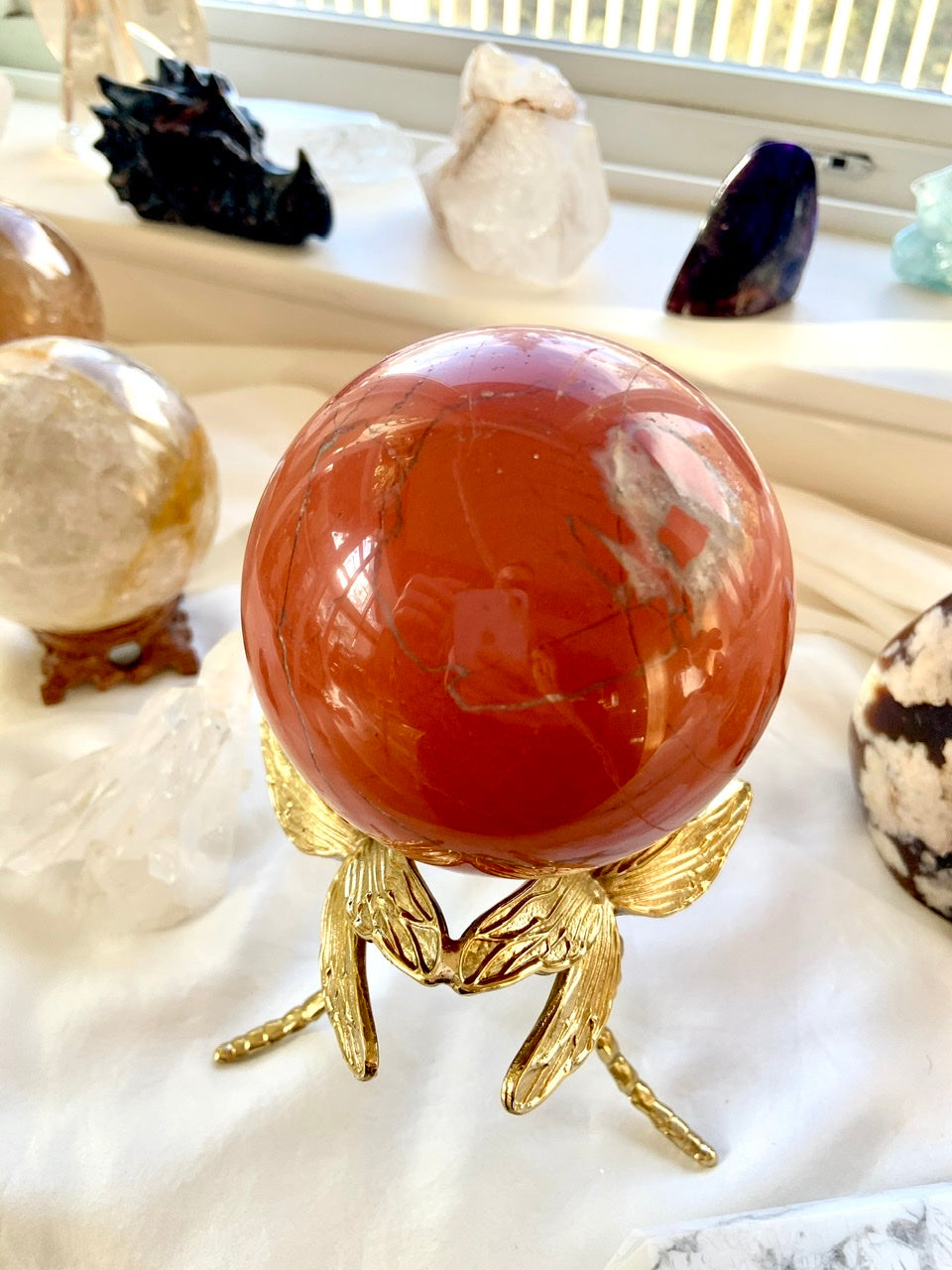 A stunning, extra large Red Jasper Sphere, at just over 2 lbs, this stately smooth-polished brilliantly colored sphere is a beautiful collector's piece to be cherished.