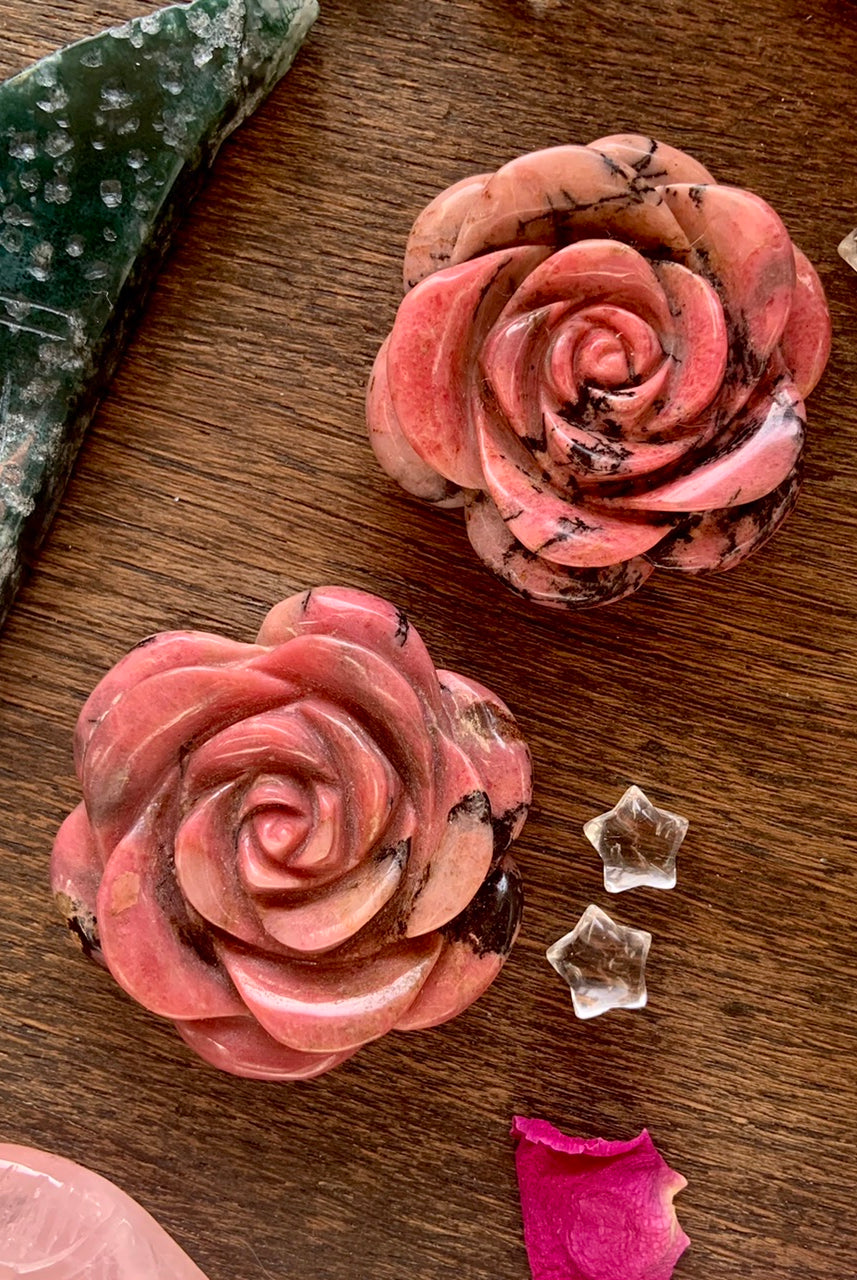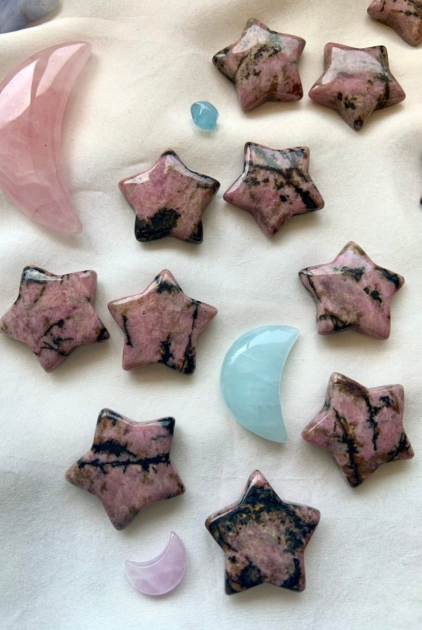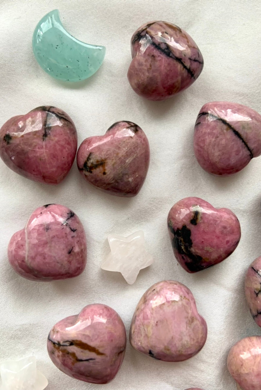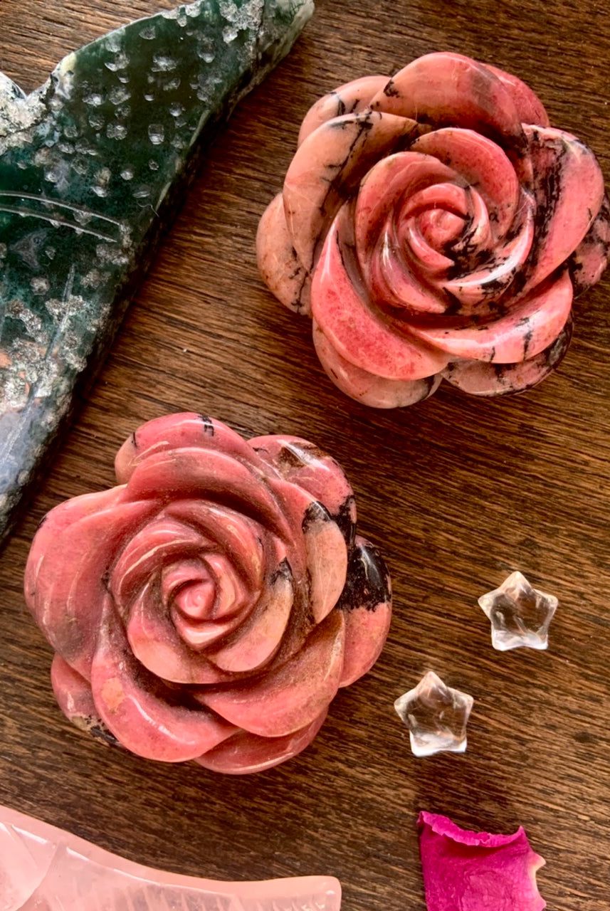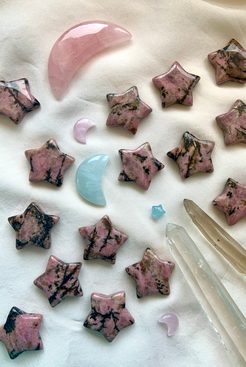 This collection currently features high-quality Rhodonite beaded bracelets, with a rotating selection of one-of-a-kind palm stones, towers, spheres, mini moons and stars, symbolic carvings, and handmade crystal jewelry—each piece chosen to support your journey toward healing, strength, and unconditional love.