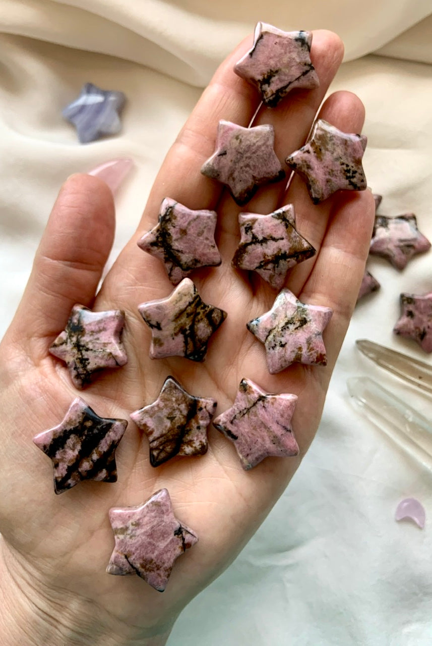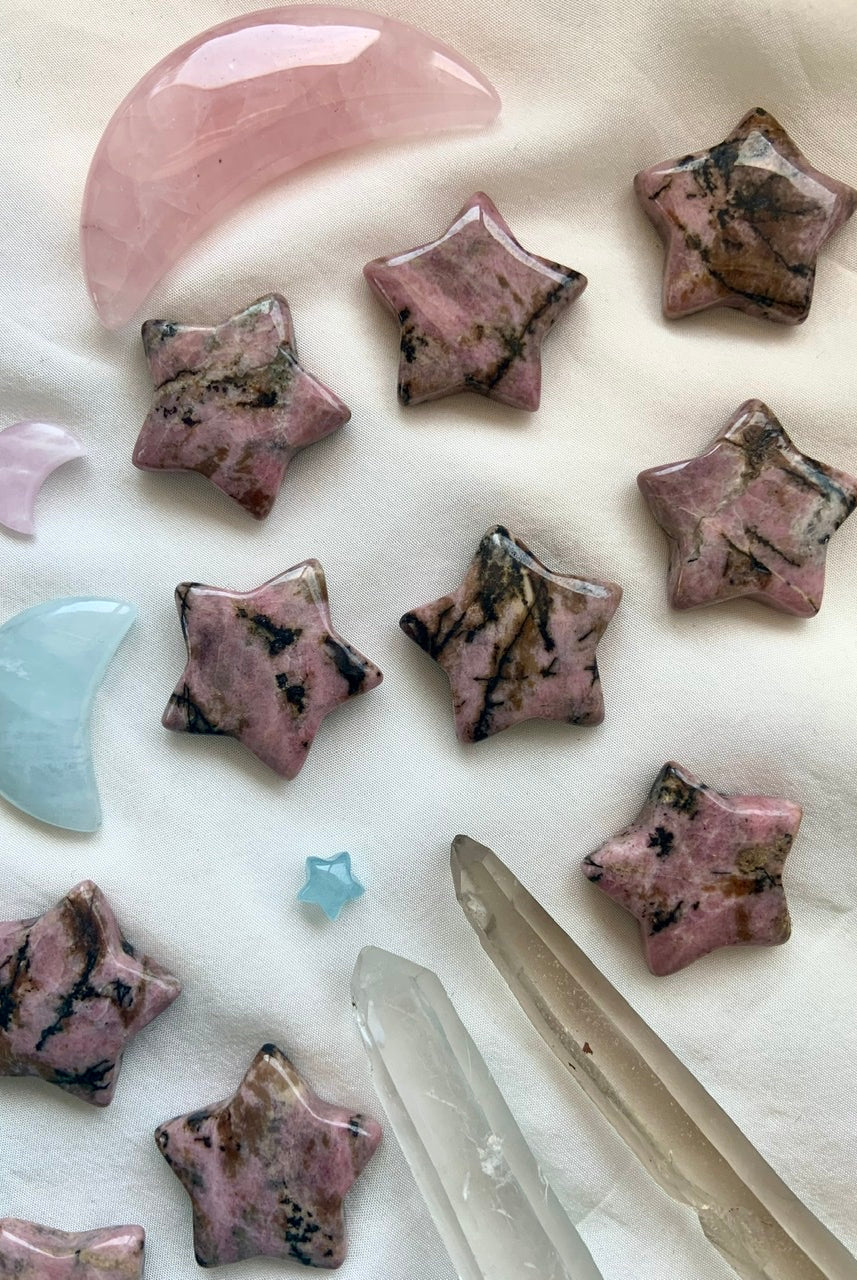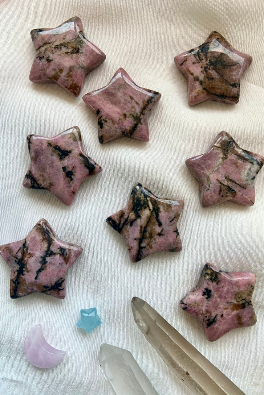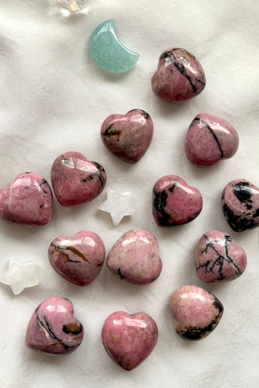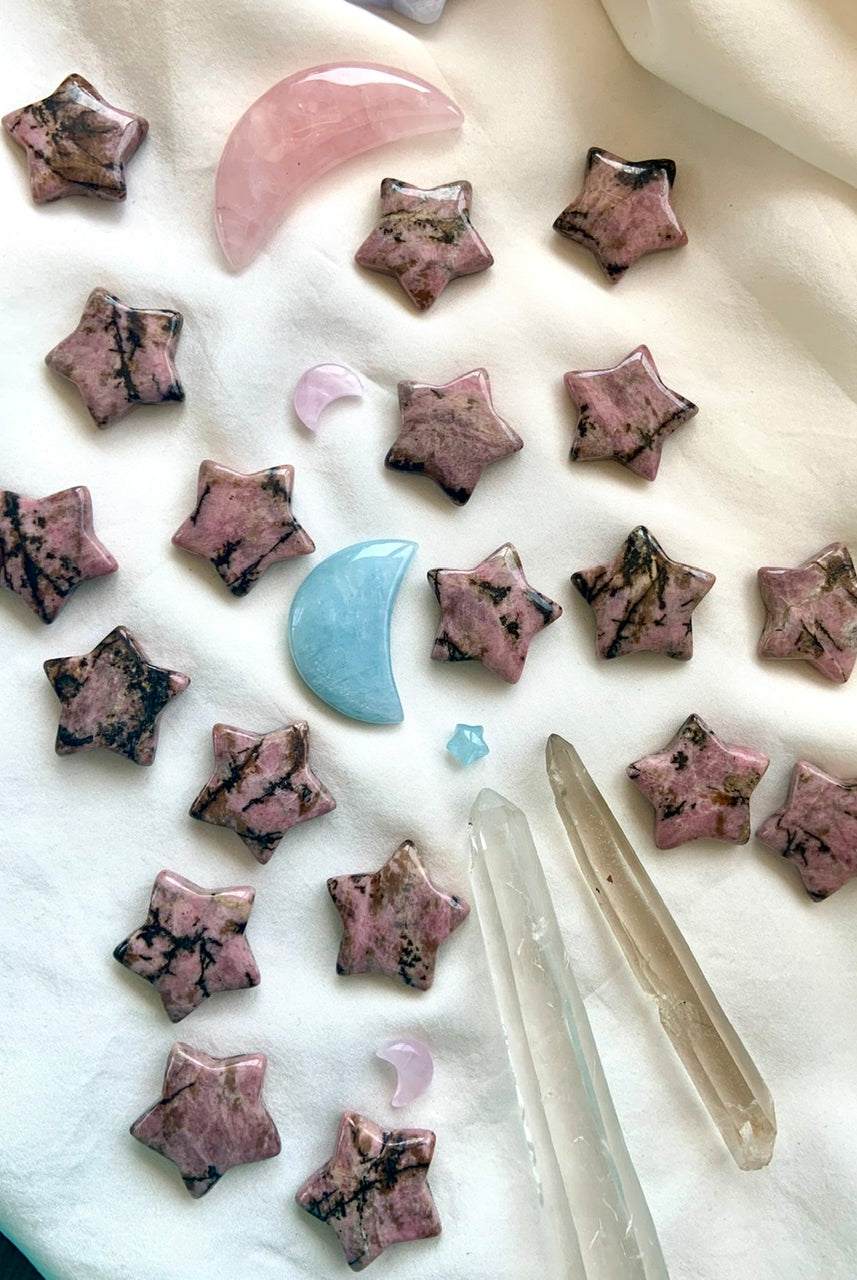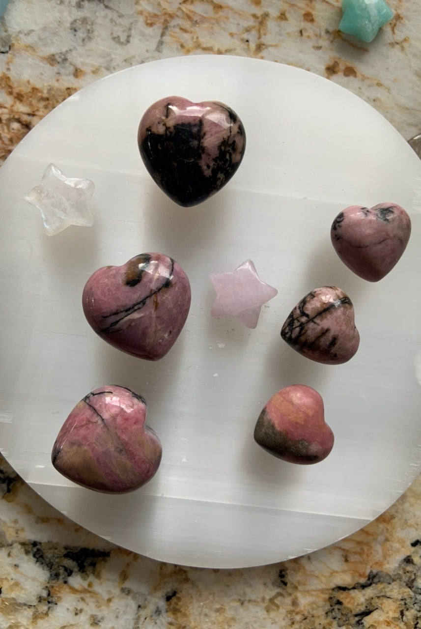 This collection currently features high-quality Rhodonite beaded bracelets, with a rotating selection of one-of-a-kind palm stones, towers, spheres, mini moons and stars, symbolic carvings, and handmade crystal jewelry—each piece chosen to support your journey toward healing, strength, and unconditional love.