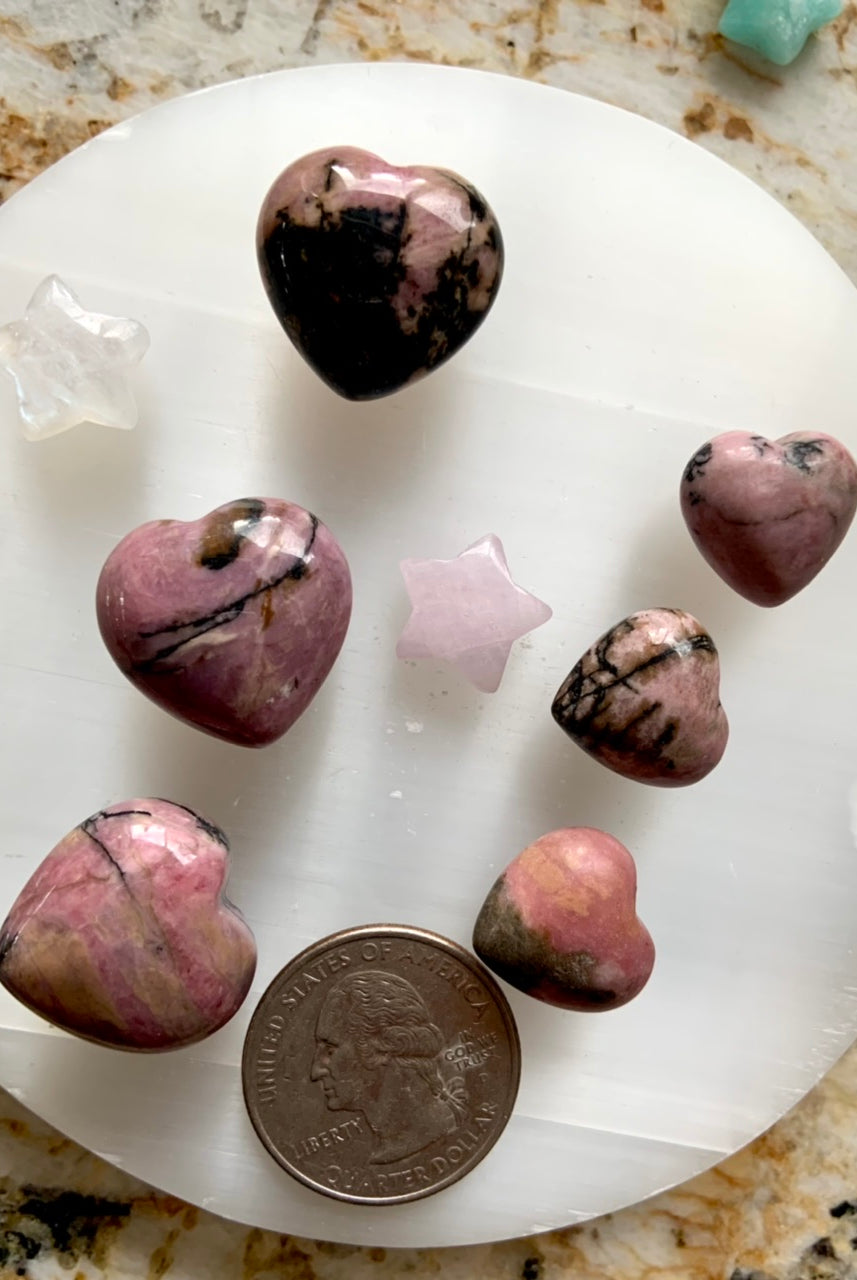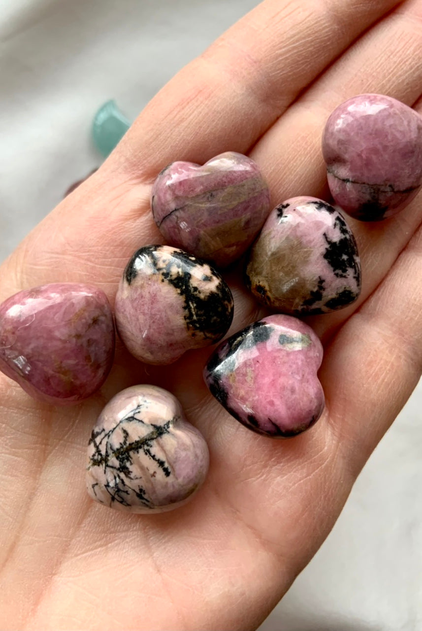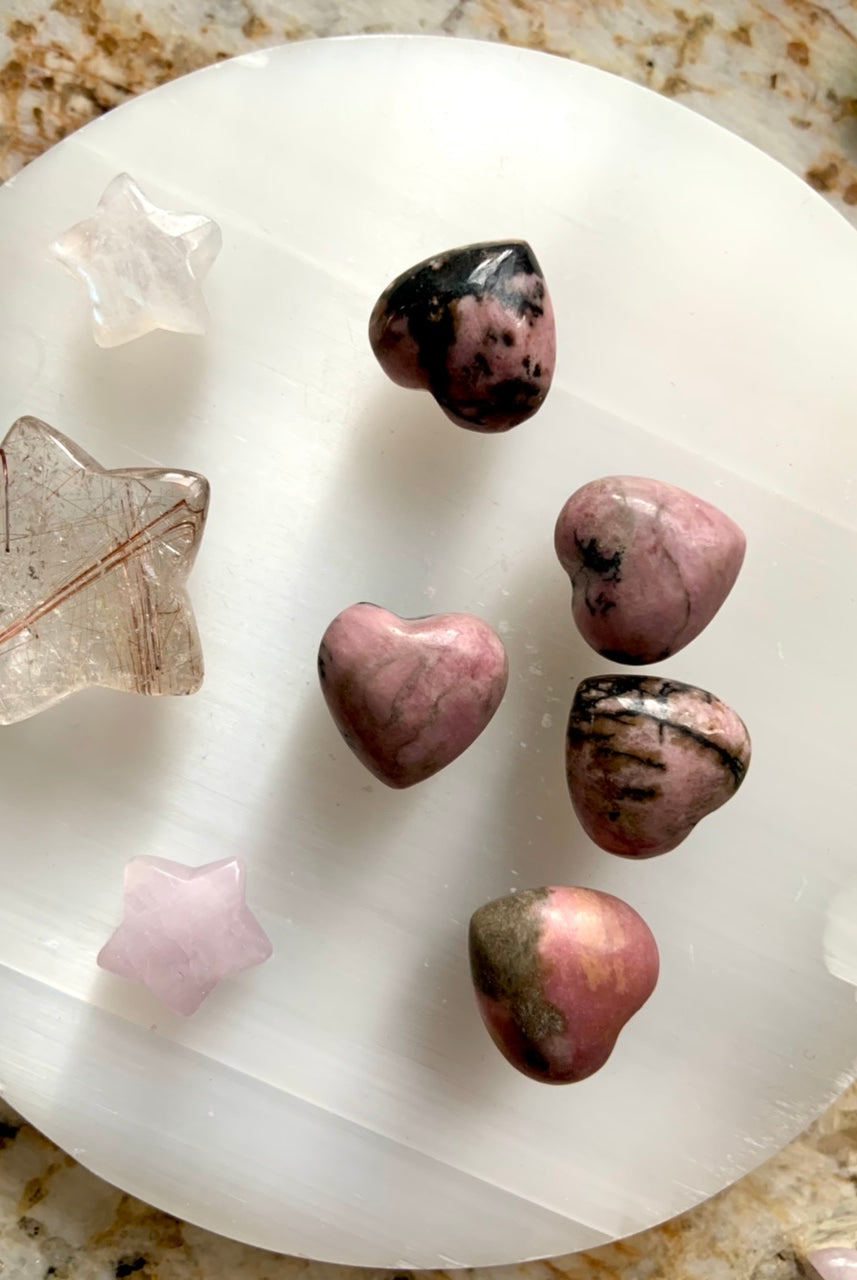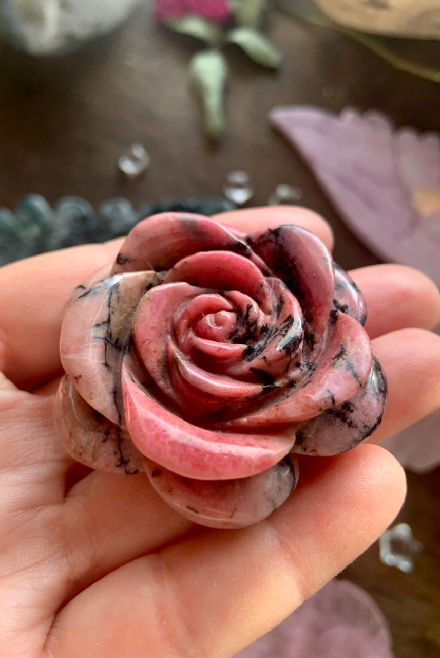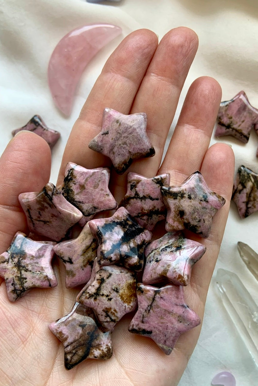 This collection currently features high-quality Rhodonite beaded bracelets, with a rotating selection of one-of-a-kind palm stones, towers, spheres, mini moons and stars, symbolic carvings, and handmade crystal jewelry—each piece chosen to support your journey toward healing, strength, and unconditional love.