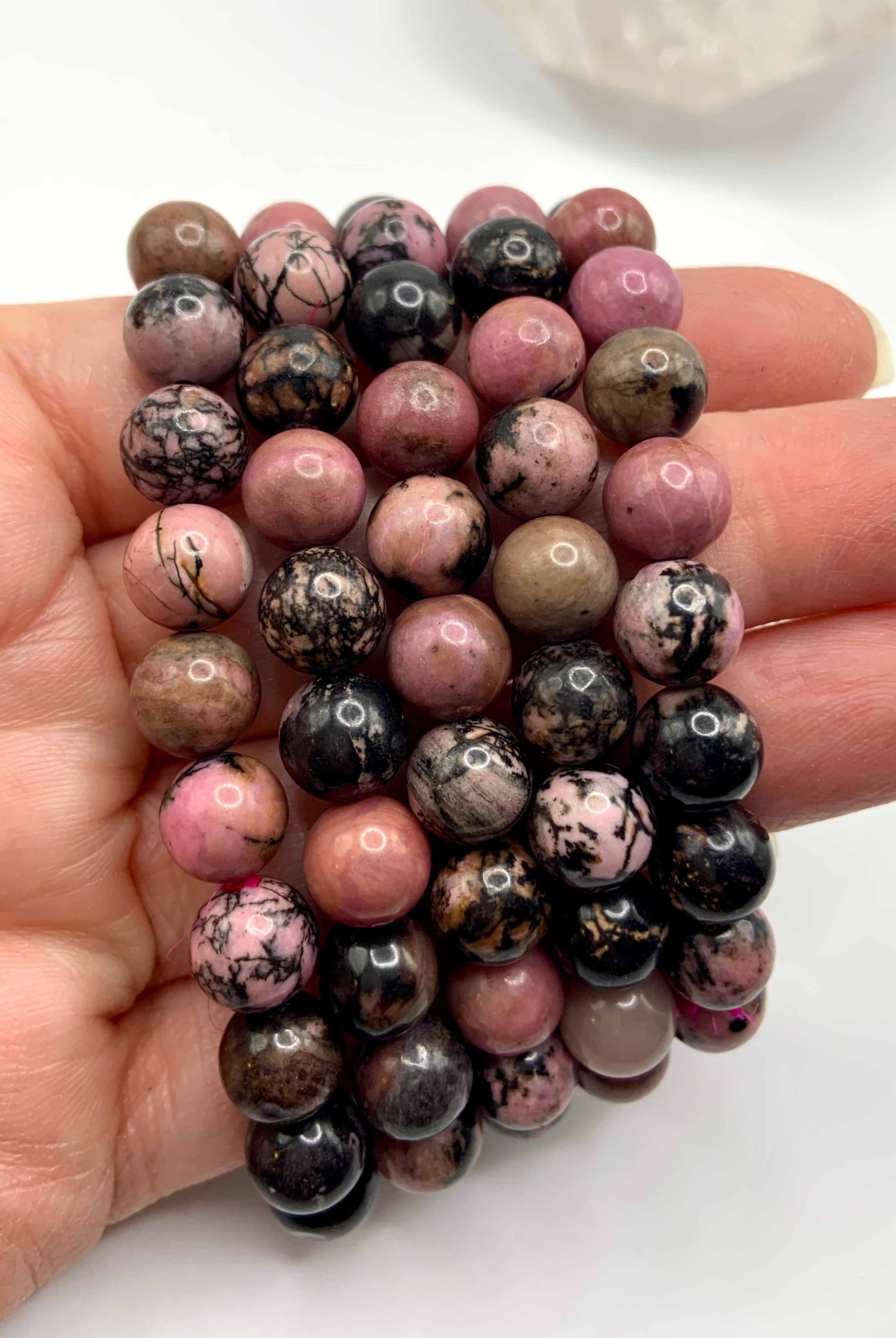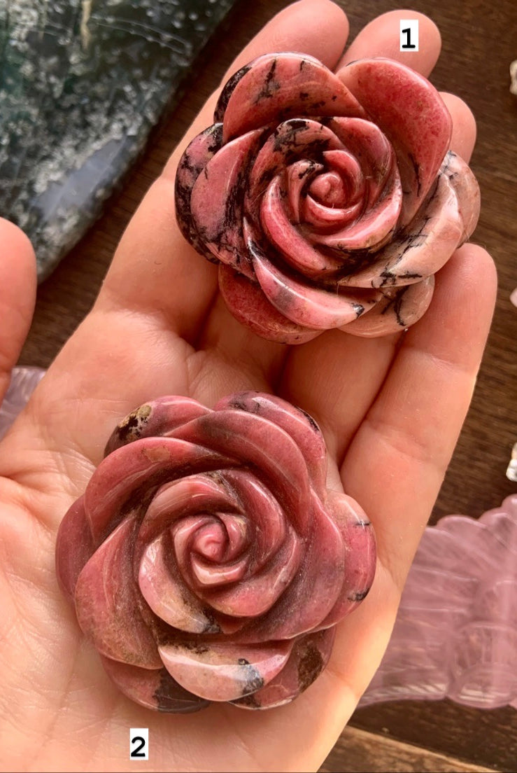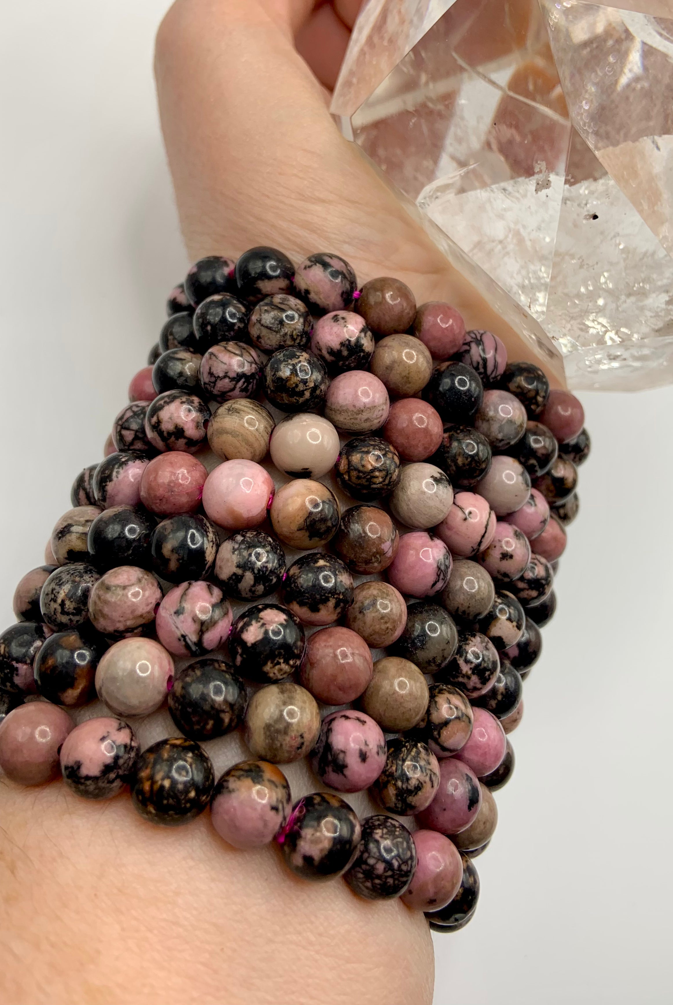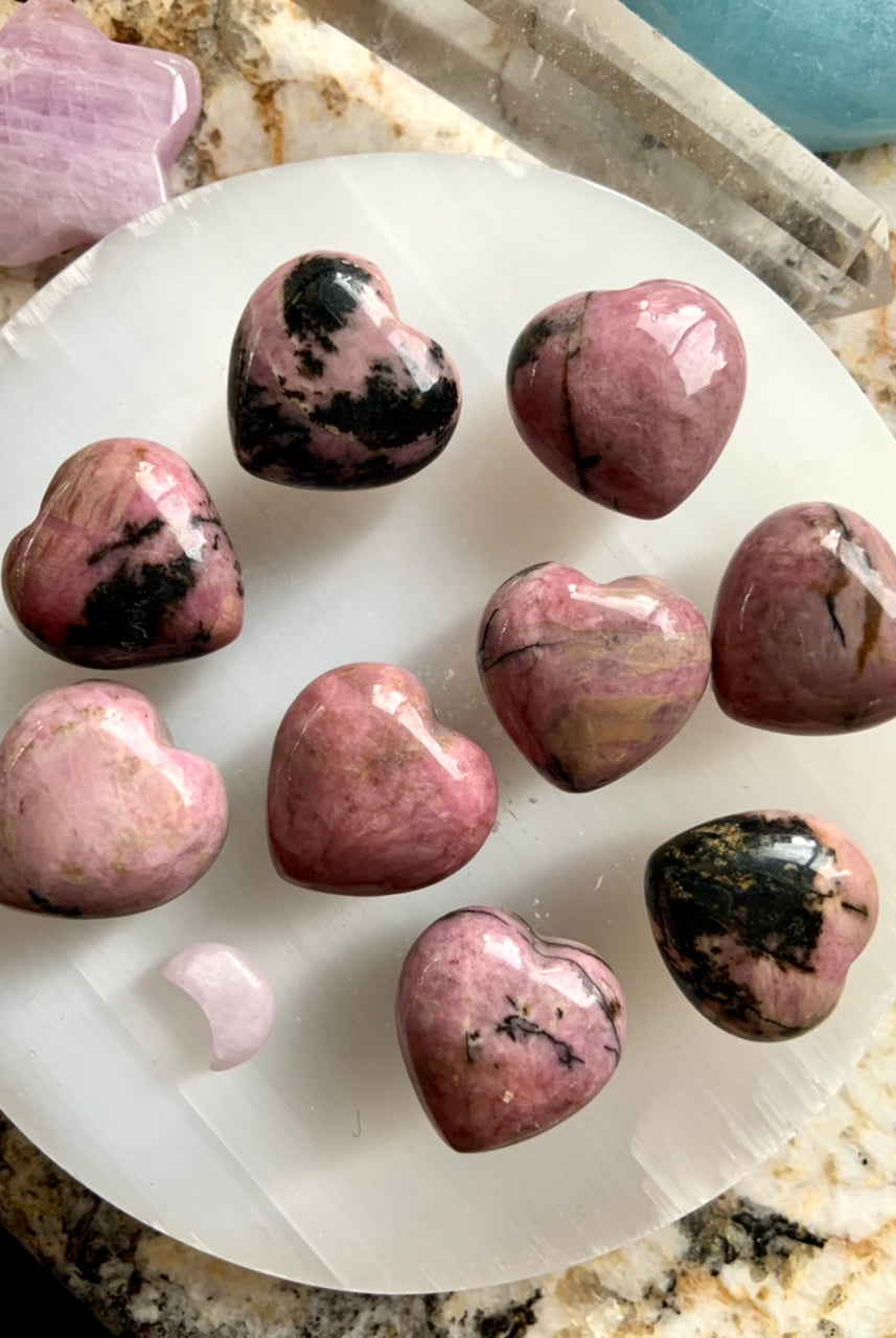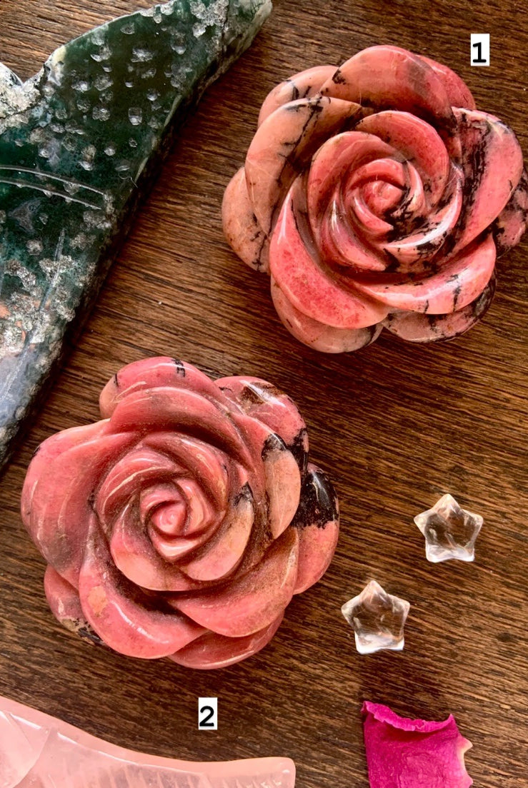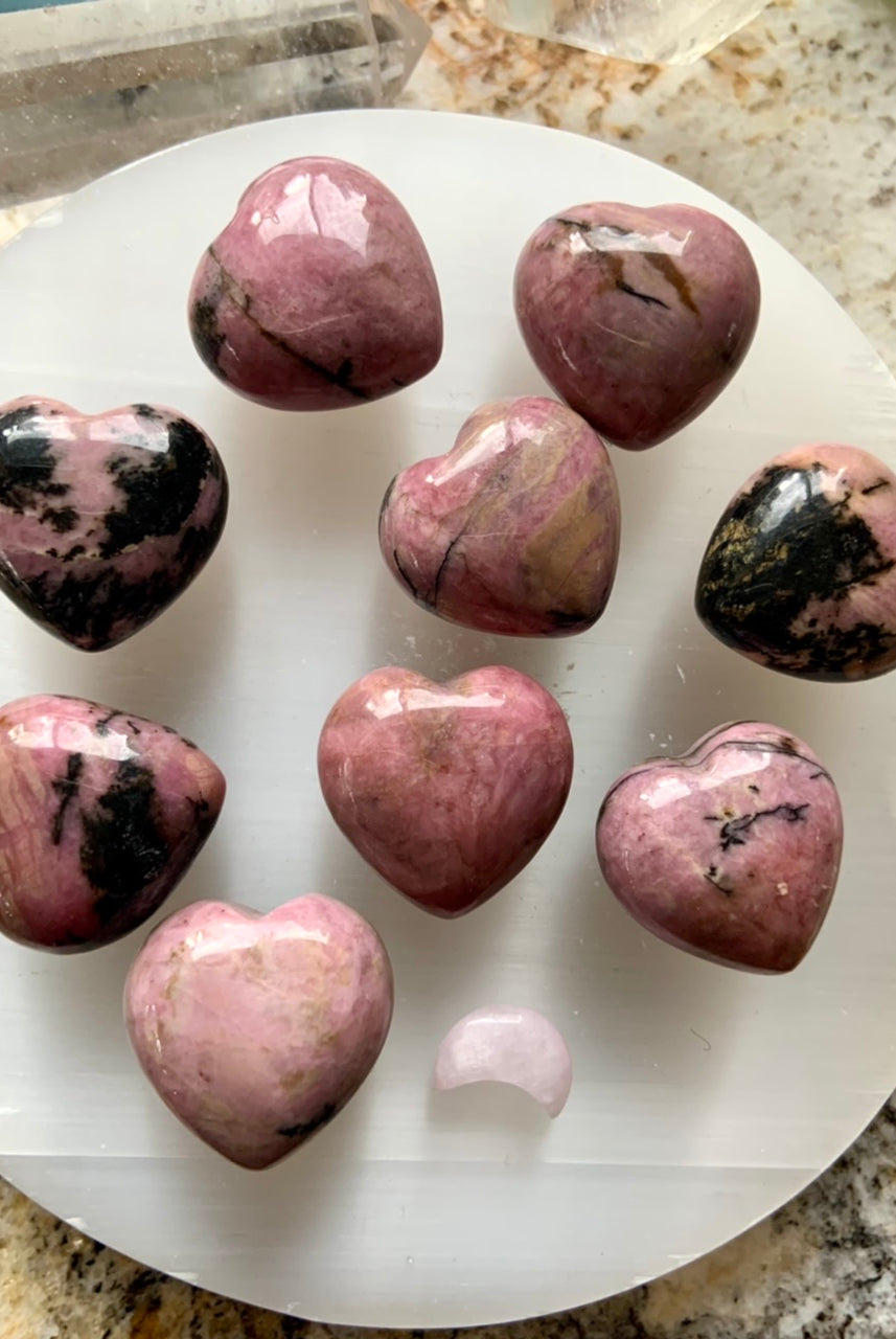 This collection currently features high-quality Rhodonite beaded bracelets, with a rotating selection of one-of-a-kind palm stones, towers, spheres, mini moons and stars, symbolic carvings, and handmade crystal jewelry—each piece chosen to support your journey toward healing, strength, and unconditional love.