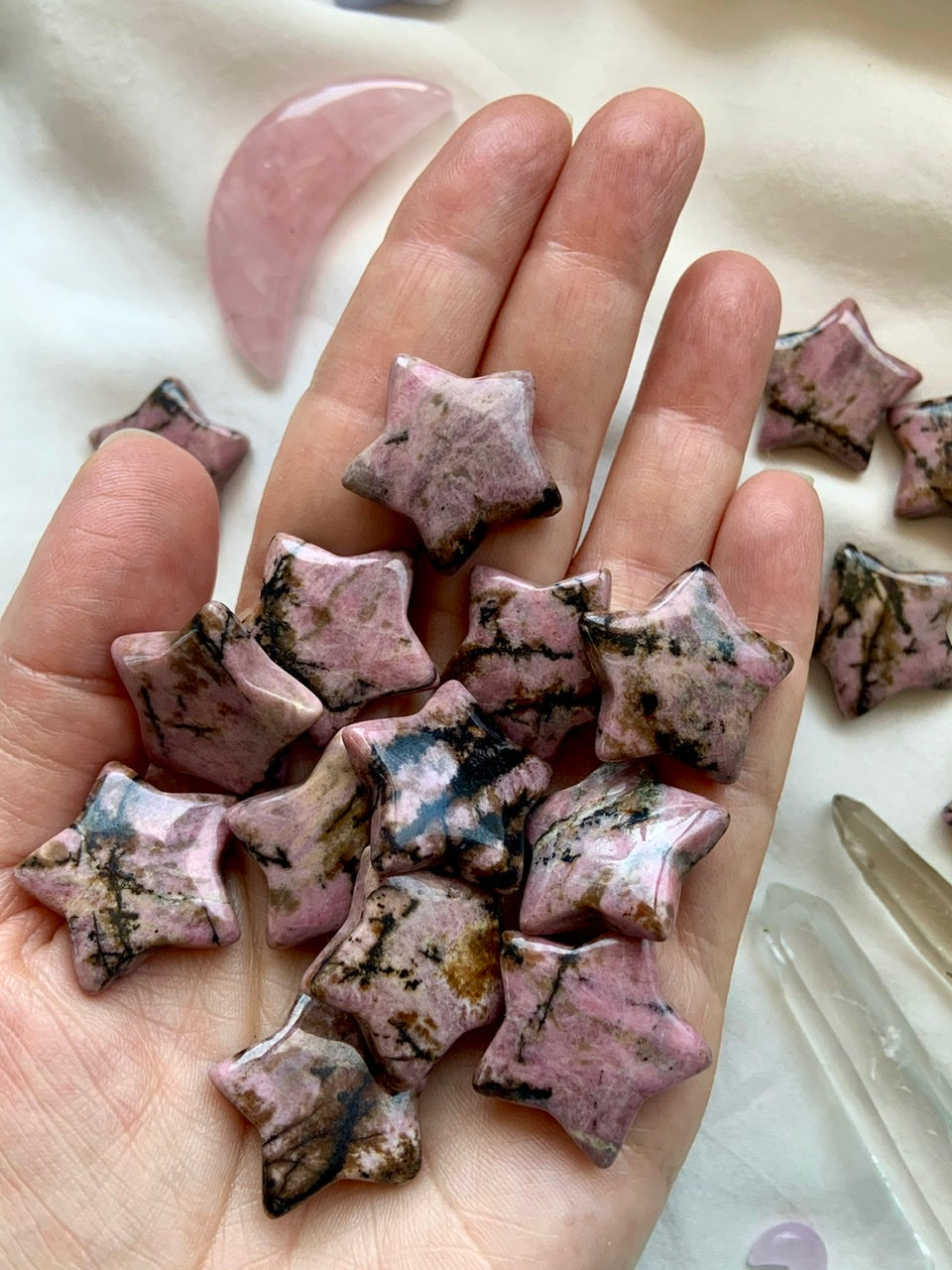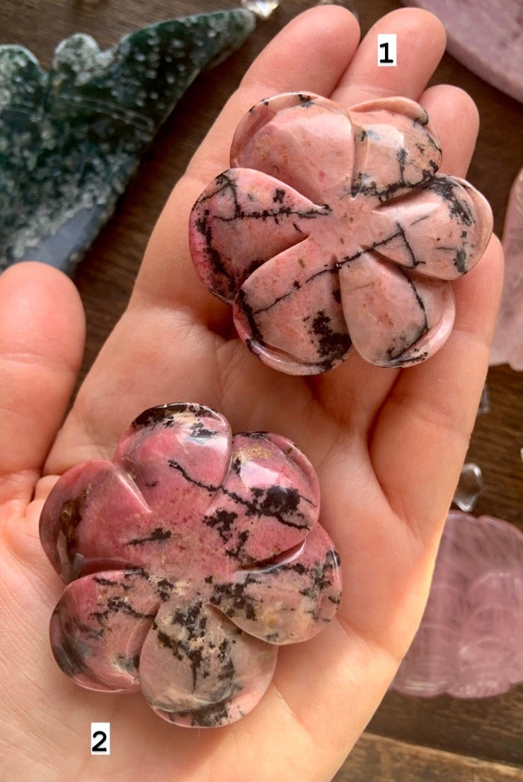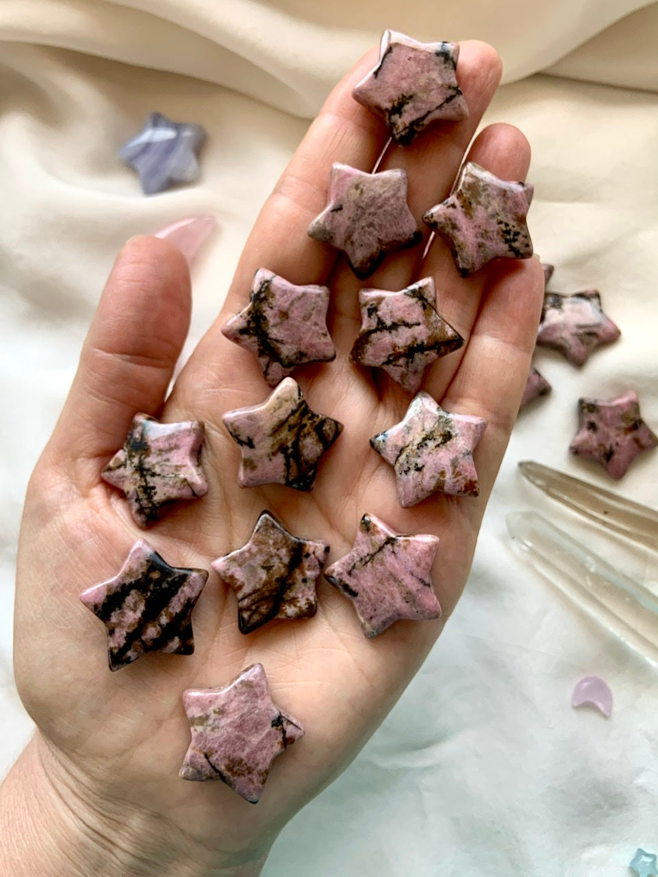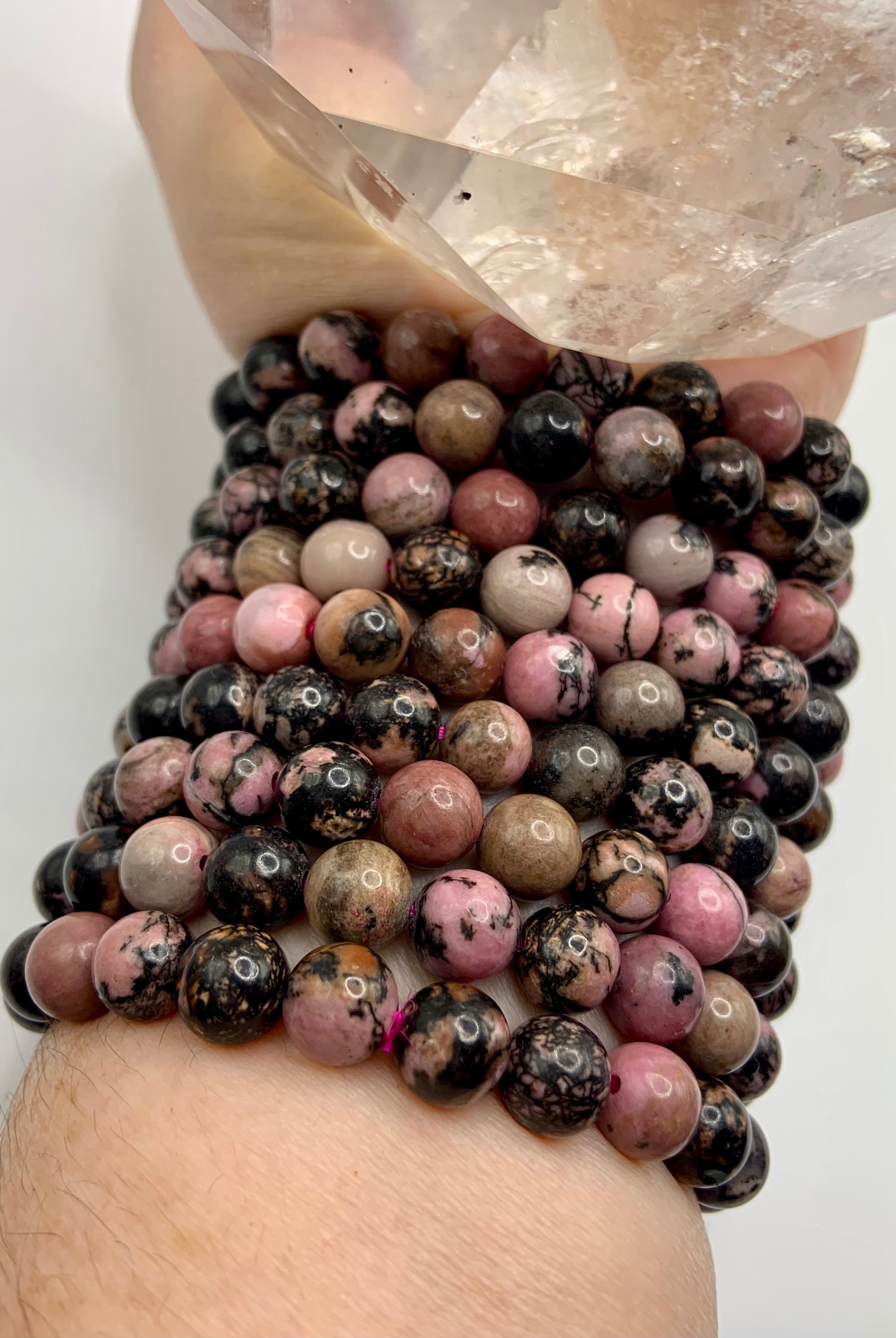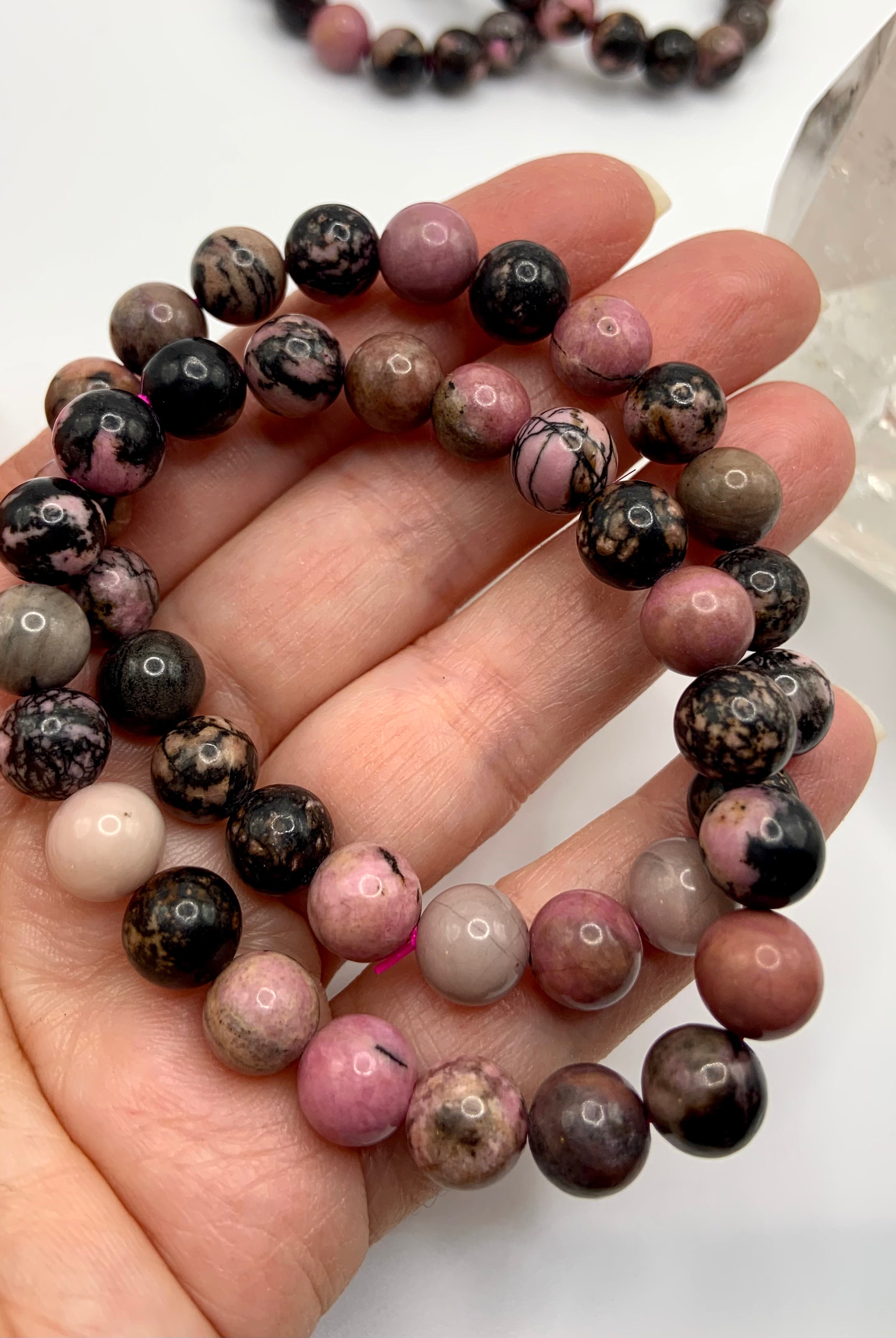 This collection currently features high-quality Rhodonite beaded bracelets, with a rotating selection of one-of-a-kind palm stones, towers, spheres, mini moons and stars, symbolic carvings, and handmade crystal jewelry—each piece chosen to support your journey toward healing, strength, and unconditional love.