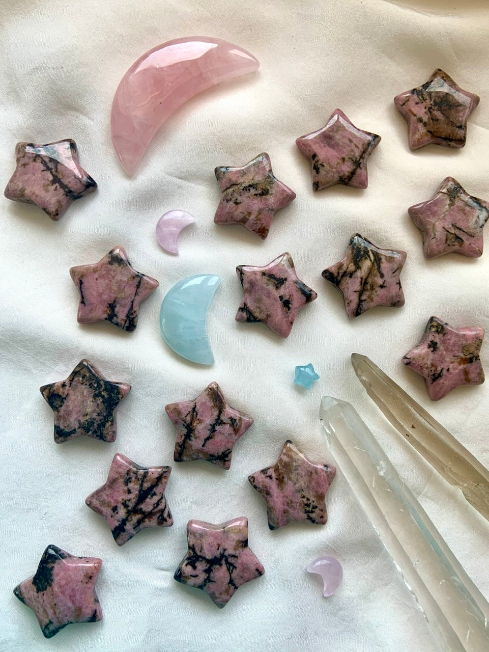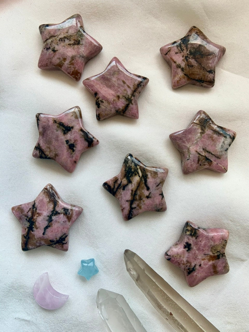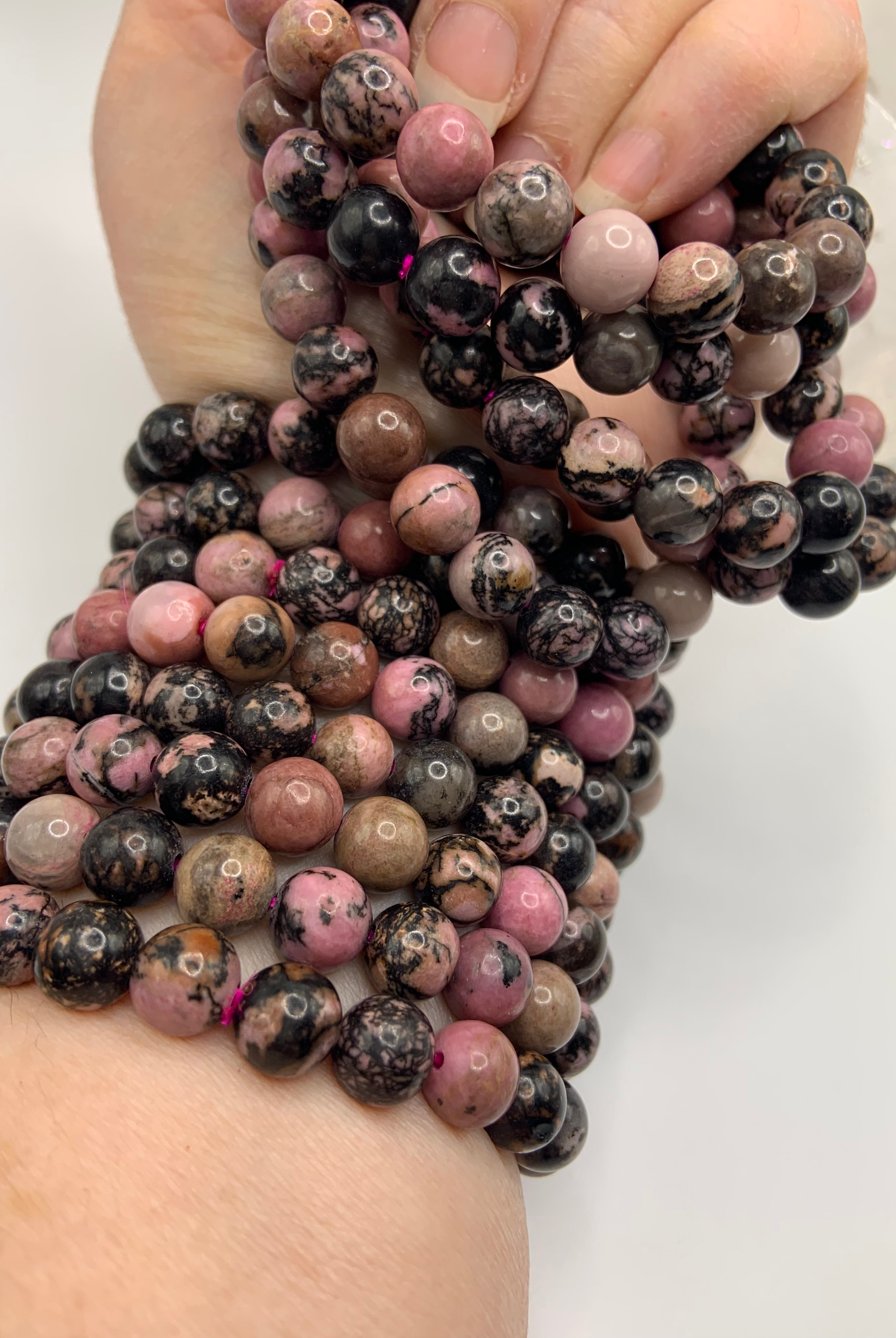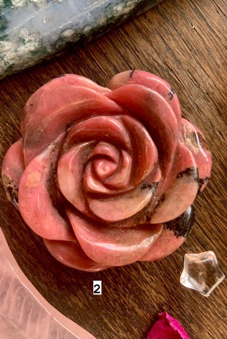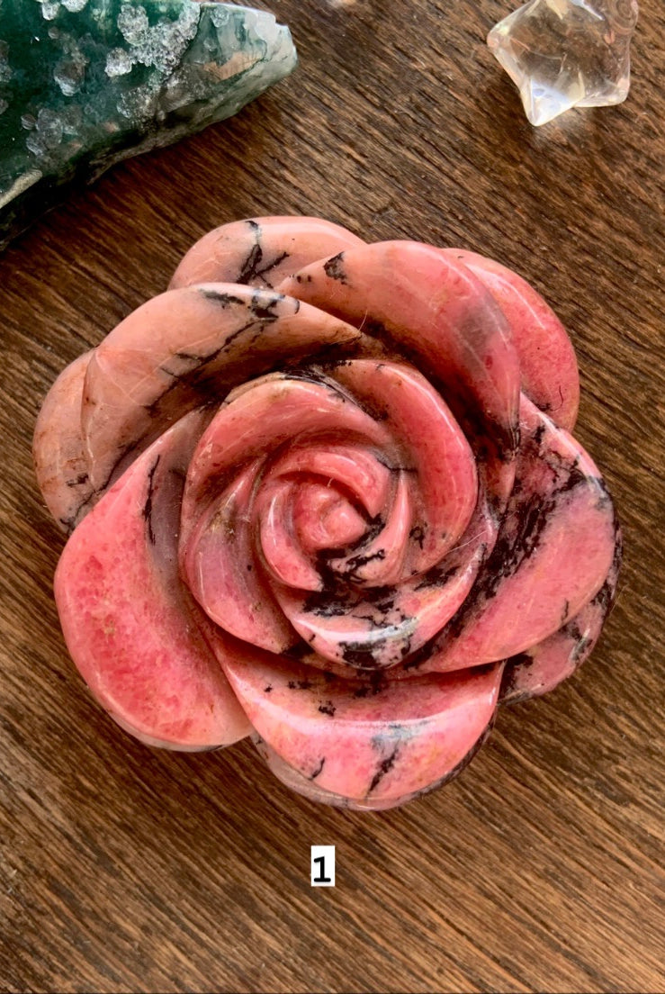 This collection currently features high-quality Rhodonite beaded bracelets, with a rotating selection of one-of-a-kind palm stones, towers, spheres, mini moons and stars, symbolic carvings, and handmade crystal jewelry—each piece chosen to support your journey toward healing, strength, and unconditional love.