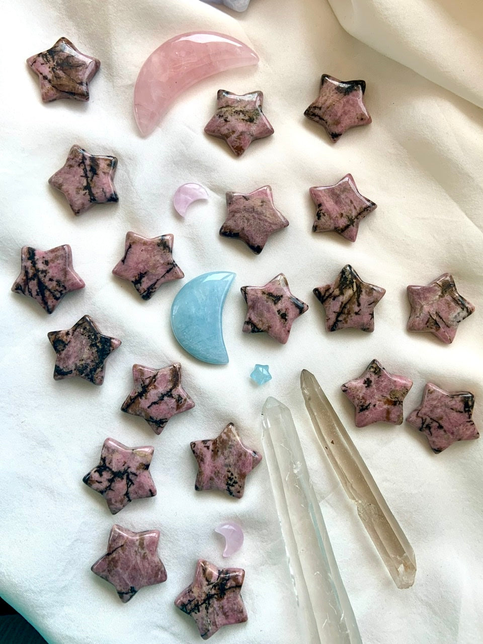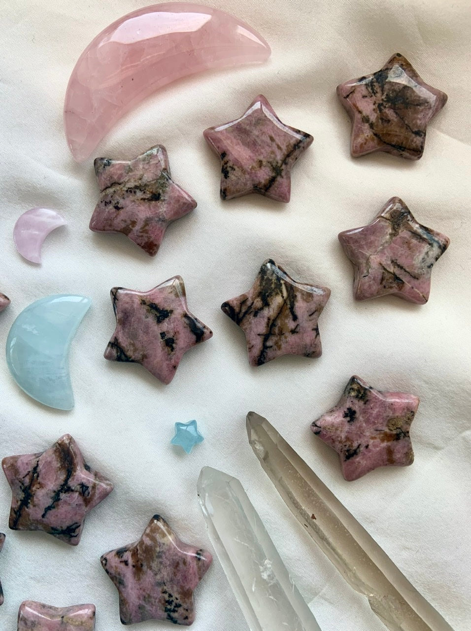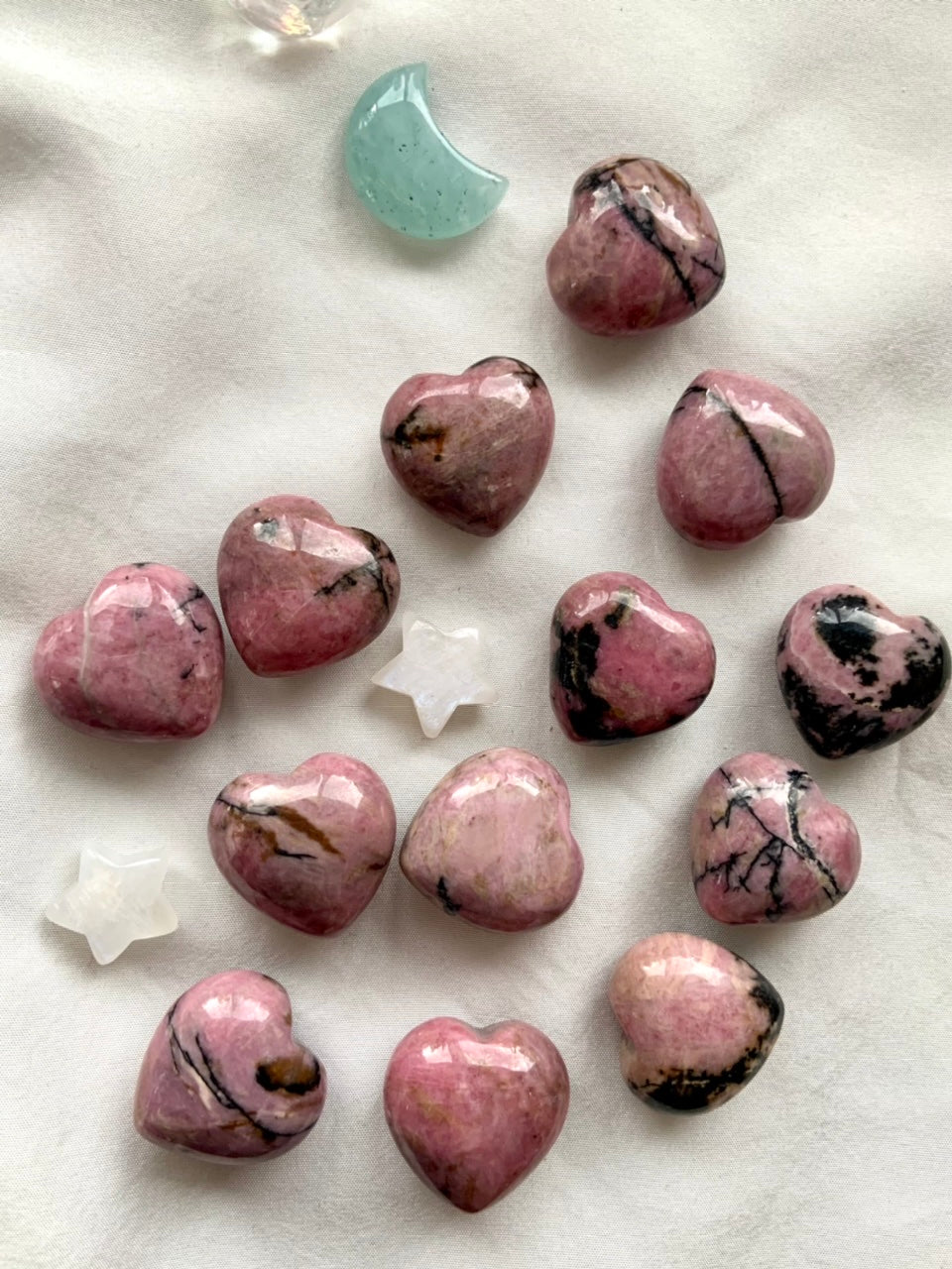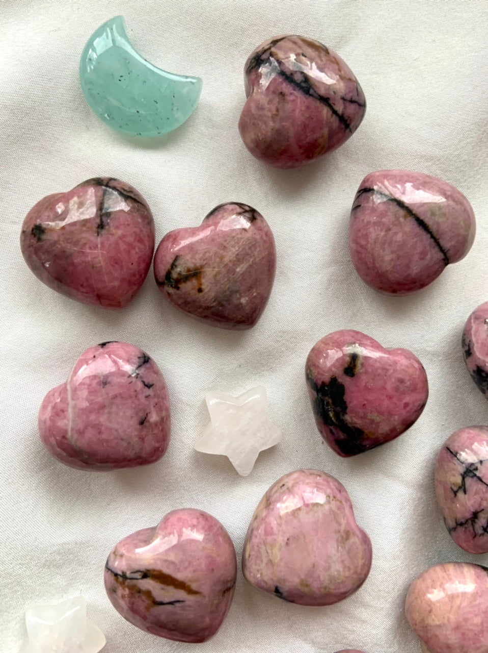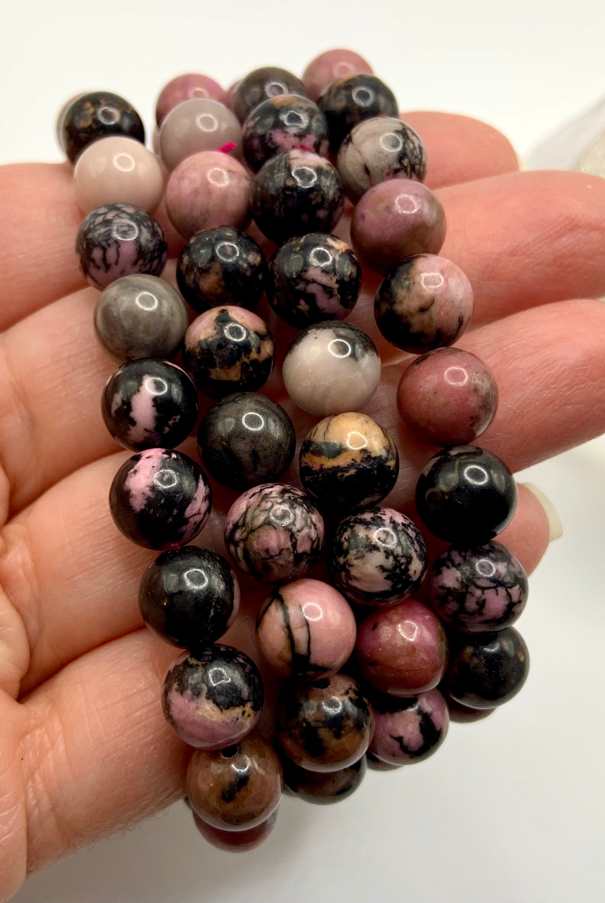 This collection currently features high-quality Rhodonite beaded bracelets, with a rotating selection of one-of-a-kind palm stones, towers, spheres, mini moons and stars, symbolic carvings, and handmade crystal jewelry—each piece chosen to support your journey toward healing, strength, and unconditional love.