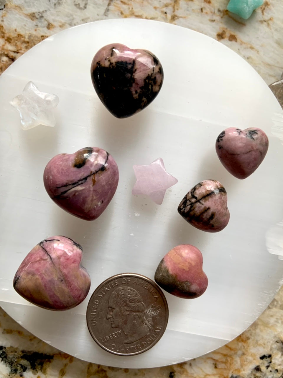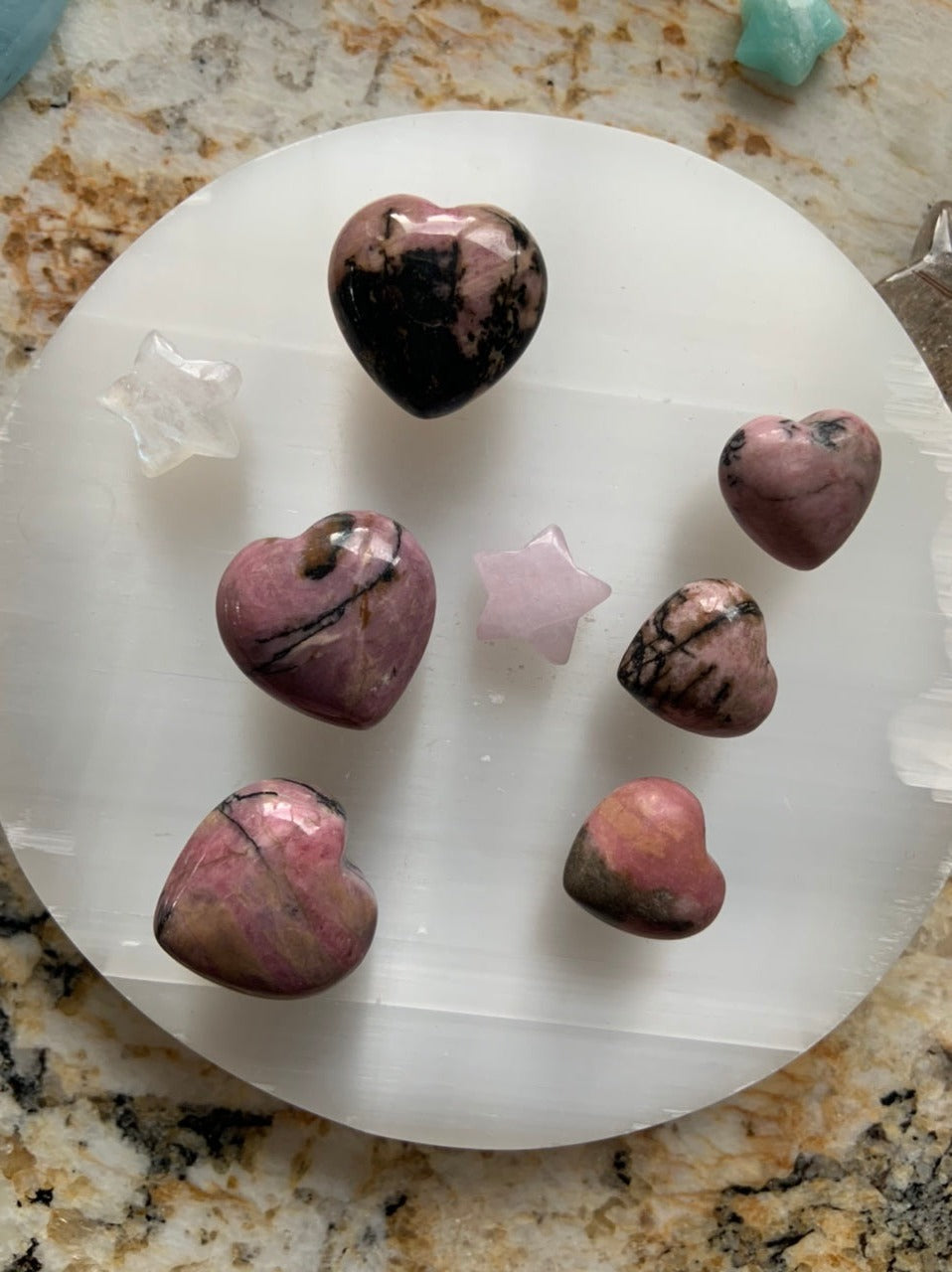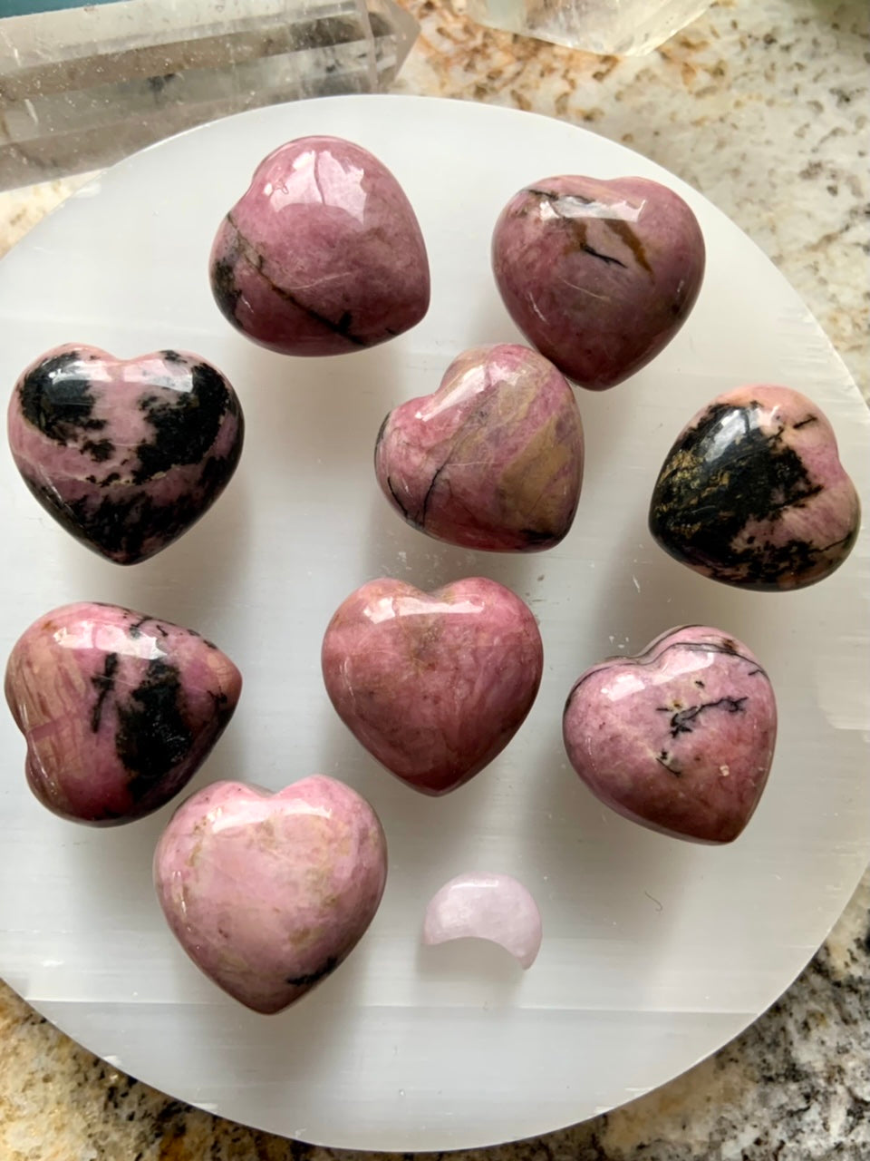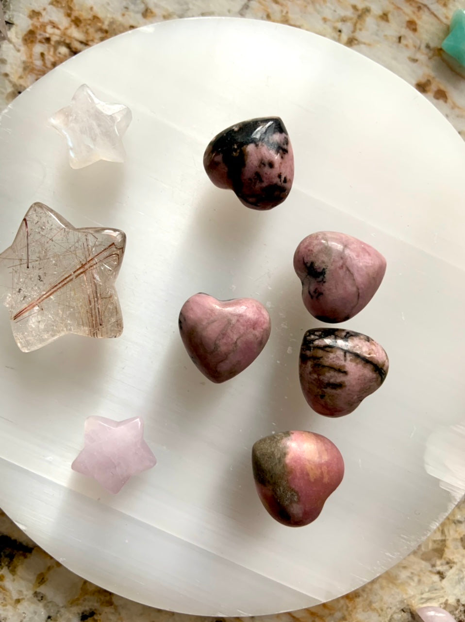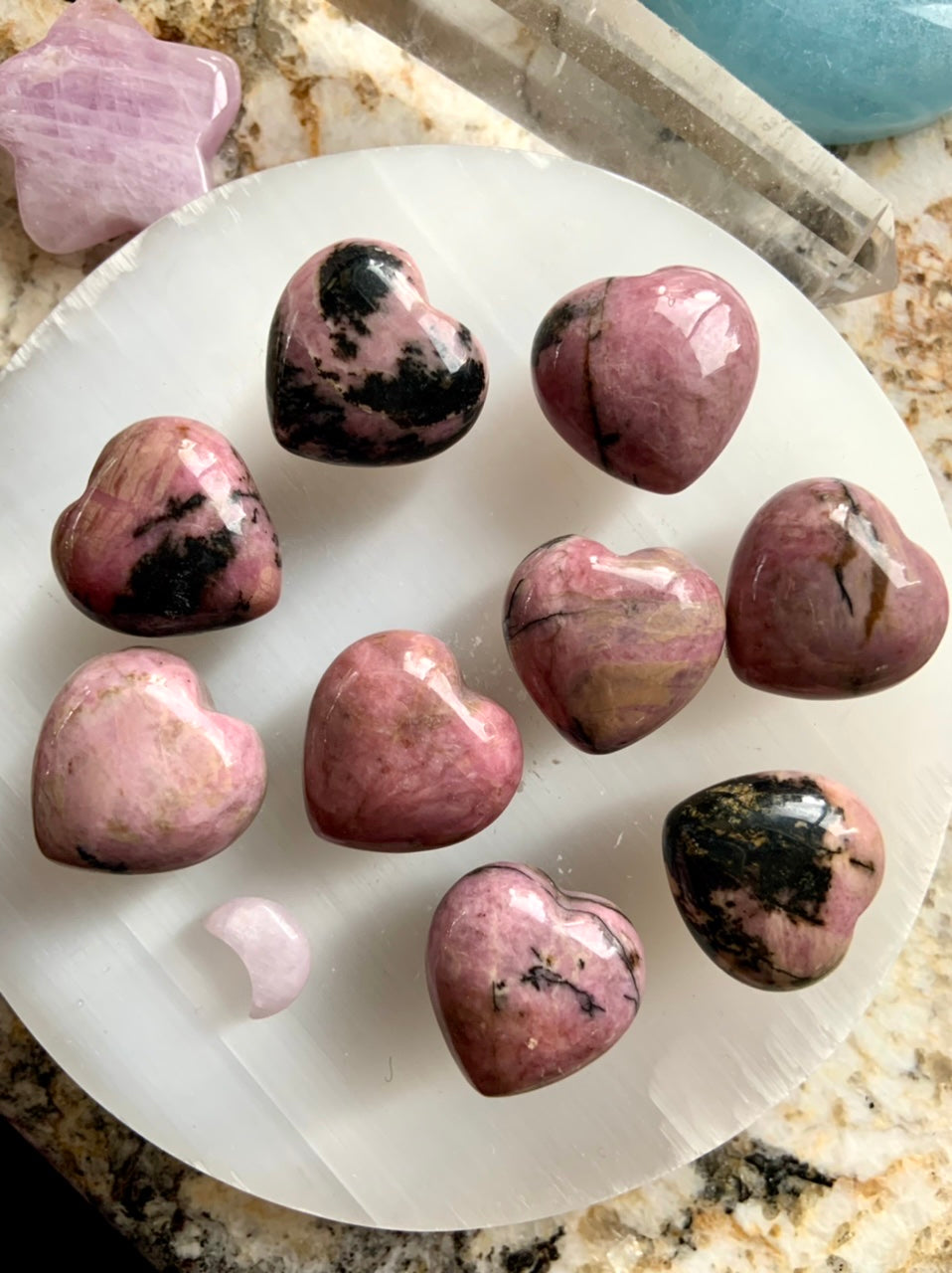 This collection currently features high-quality Rhodonite beaded bracelets, with a rotating selection of one-of-a-kind palm stones, towers, spheres, mini moons and stars, symbolic carvings, and handmade crystal jewelry—each piece chosen to support your journey toward healing, strength, and unconditional love.