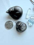 These tiny Silver Sheen Obsidian Cat Carvings are carved from natural sheen obsidian + polished to a glossy shine to highlight the silver flash. Now offered in 2 miniature sizes.