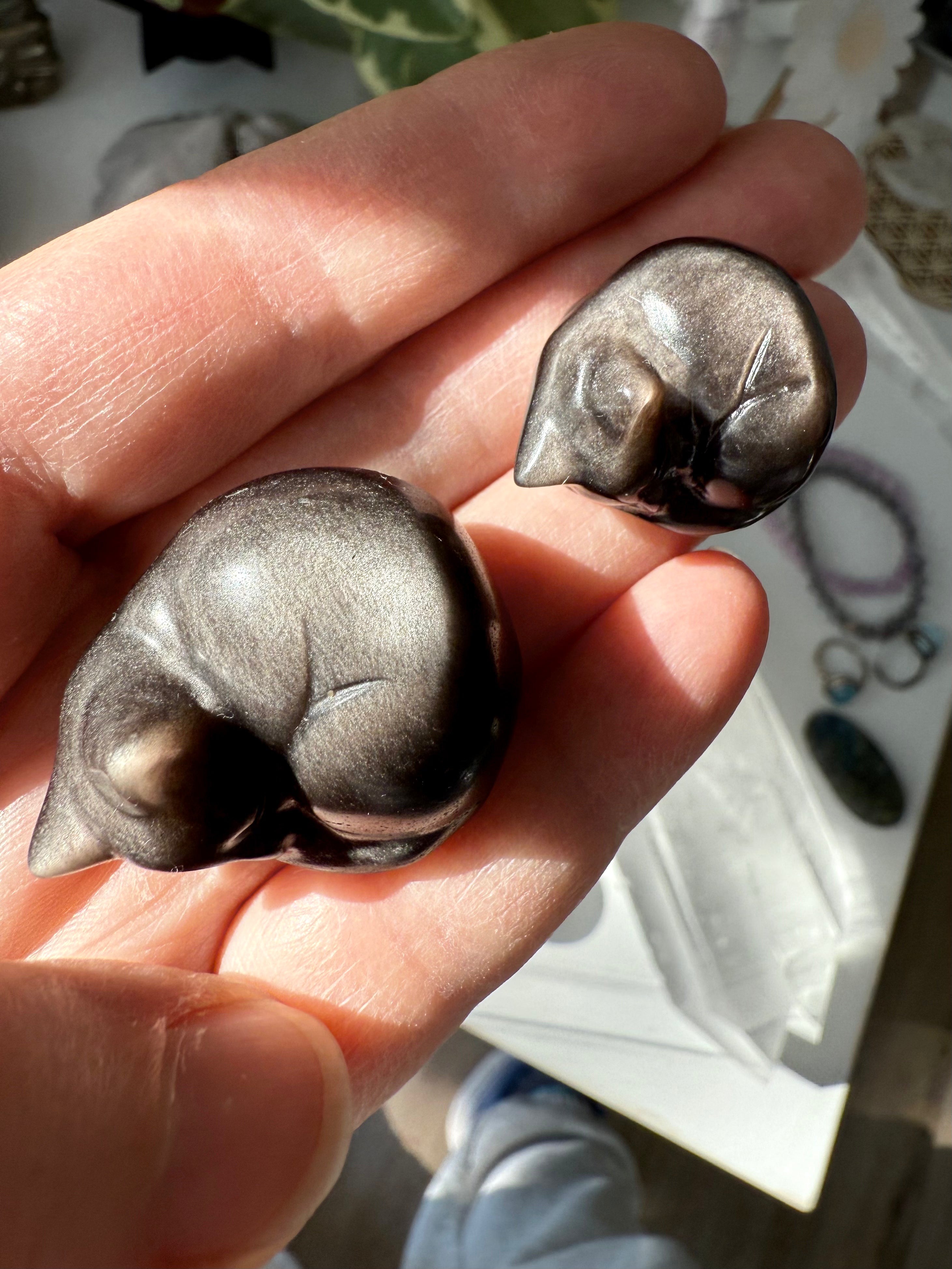 The mini cats are intuitively chosen for you, but I think the right cat will choose you! The sheen is visible in the black obsidian at various angles depending on the light. Some are darker than others as shown.