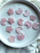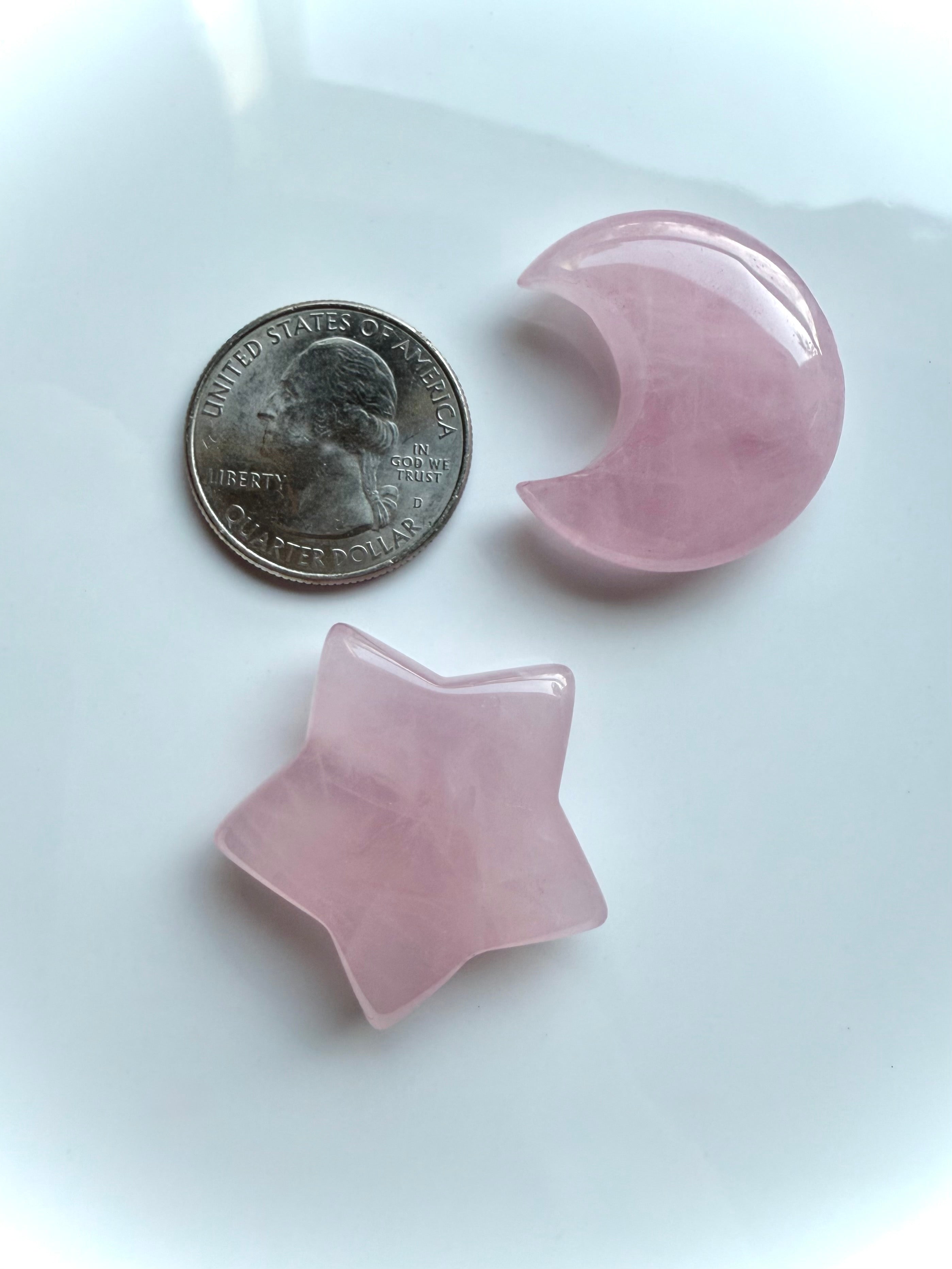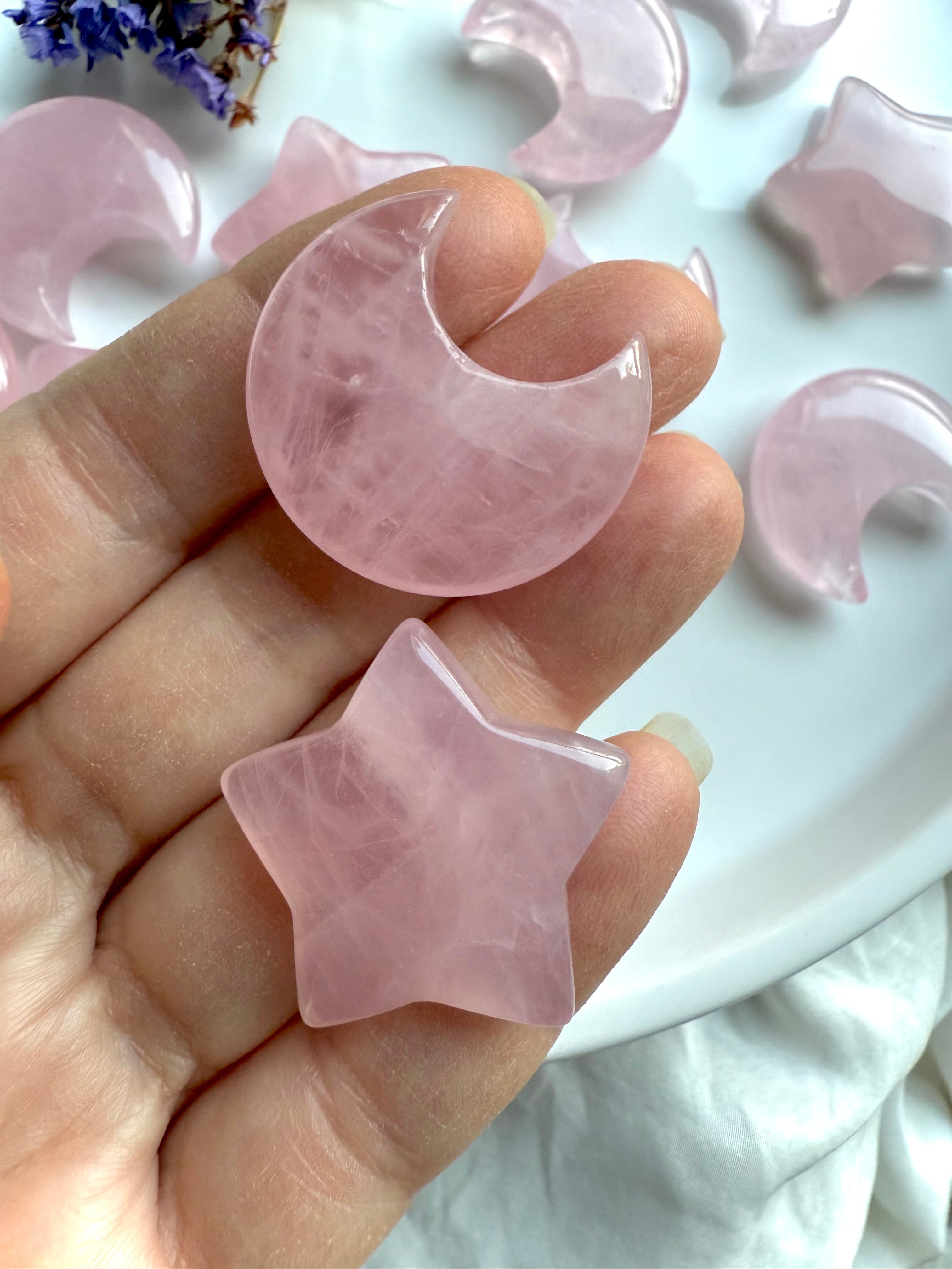 Rose Quartz Moons + Stars — heart-centered crystal carvings for unconditional love, calm, and gentle emotional healing. Carved from rare, high-quality Madagascar rose quartz with saturated pink color and gel translucence, these small moons and stars bring soft, soothing energy to any space.