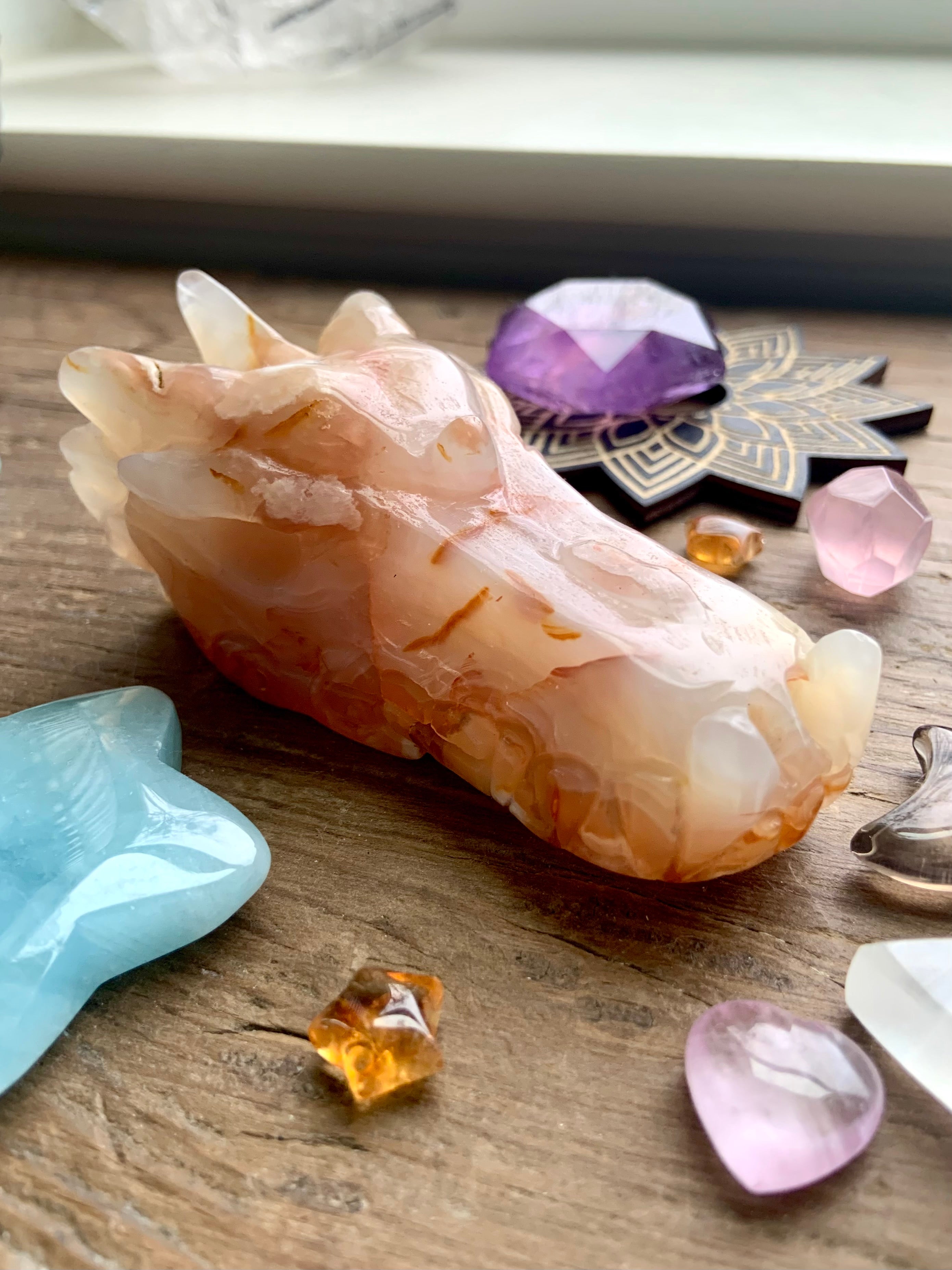 If you feel a strong connection to this Carnelian Flower Agate Crystal Dragon, my sense is that she will assist you, especially in the etheric realms, by expanding your consciousness, in remembering past life experiences, activate your higher aspects of the Divine Feminine + nudge you along toward your highest path for this lifetime.