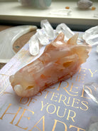 Manifest your potential with a one of a kind Carnelian Flower Agate Dragon Carving. This beautifully hand carved crystal dragon skull is made of a beautiful piece of creamy translucent amber colored Agate with swirling linear patterns, sparkly druzy + a prominent well formed cherry blossom on its head.