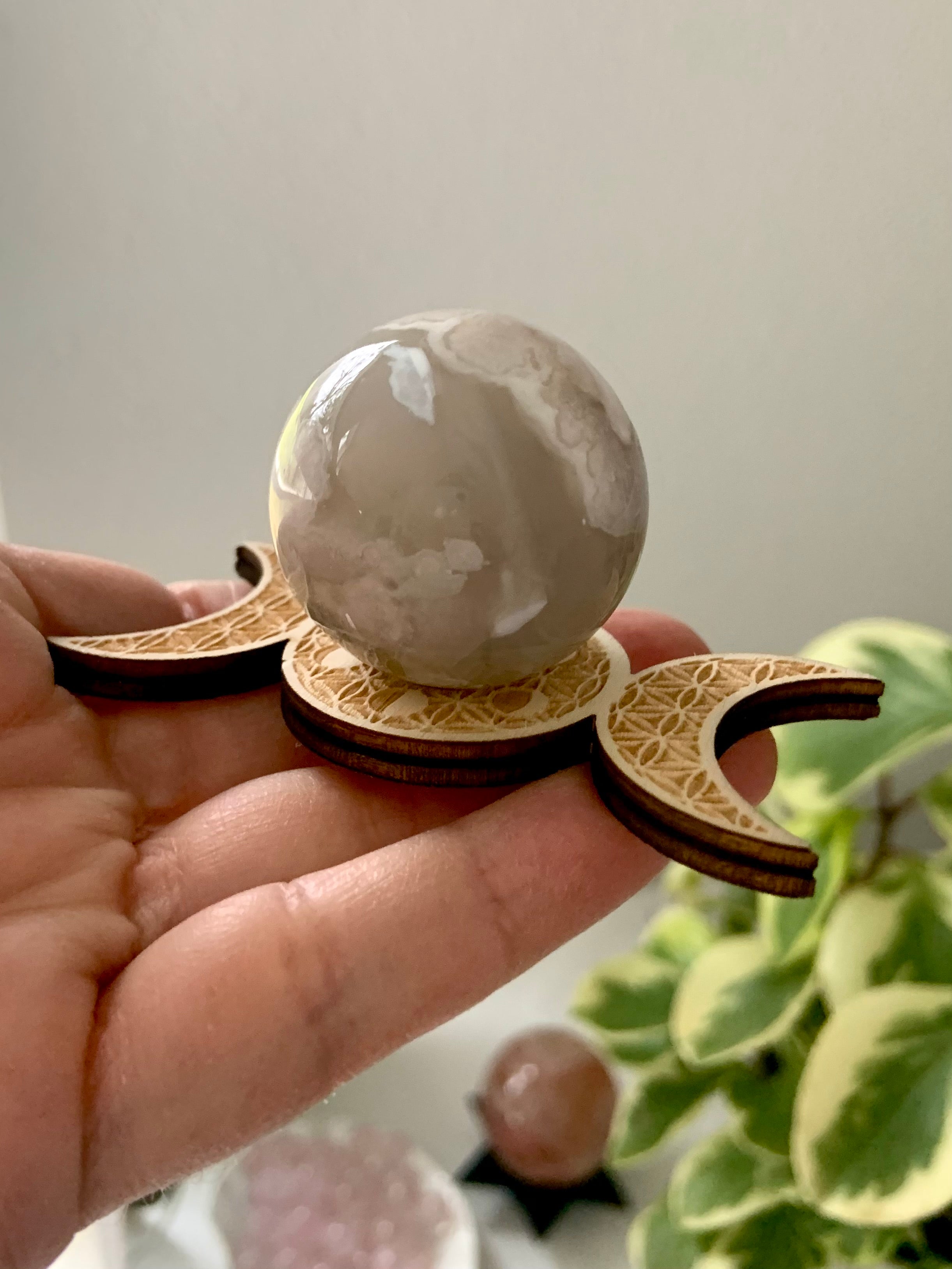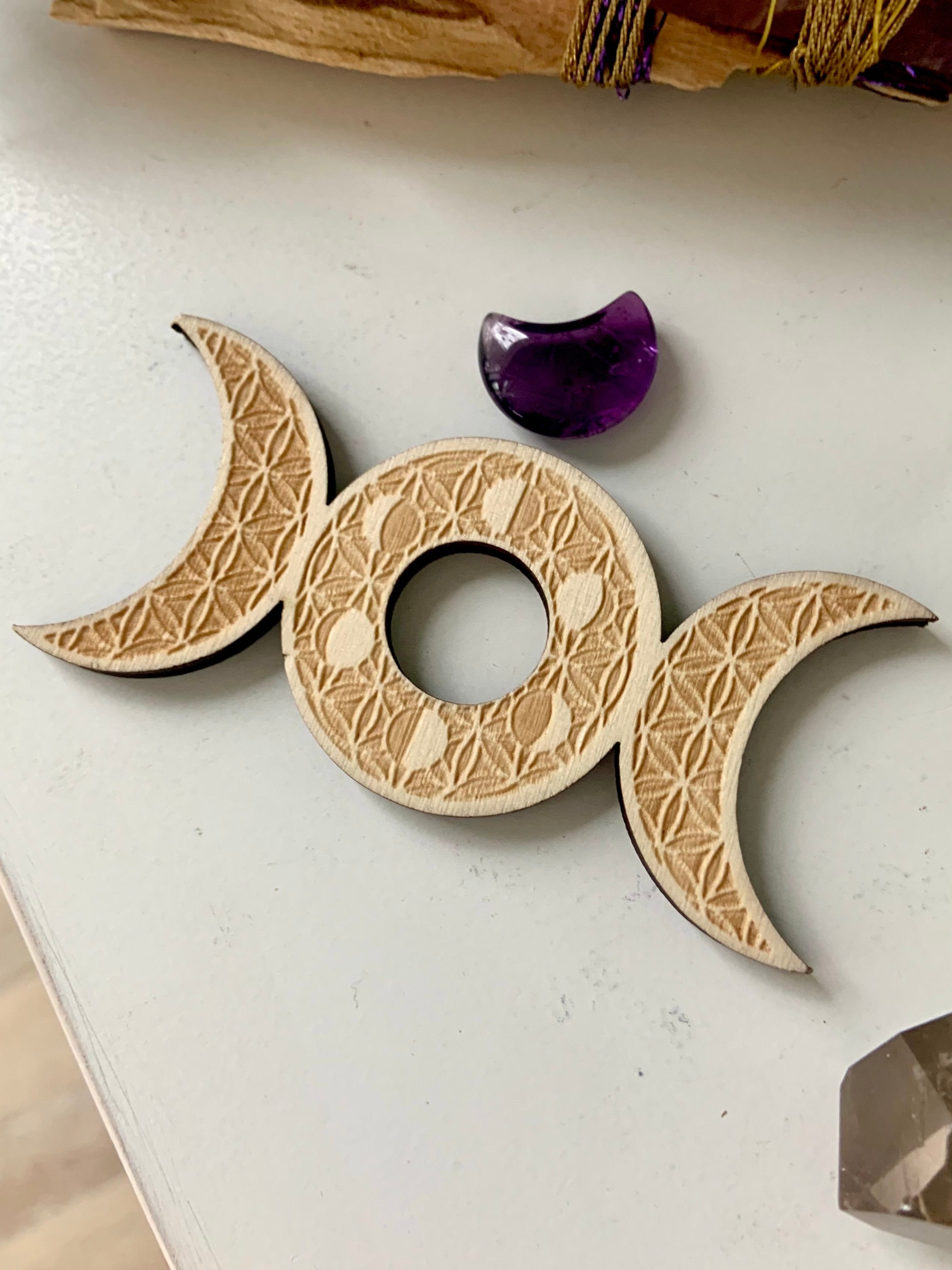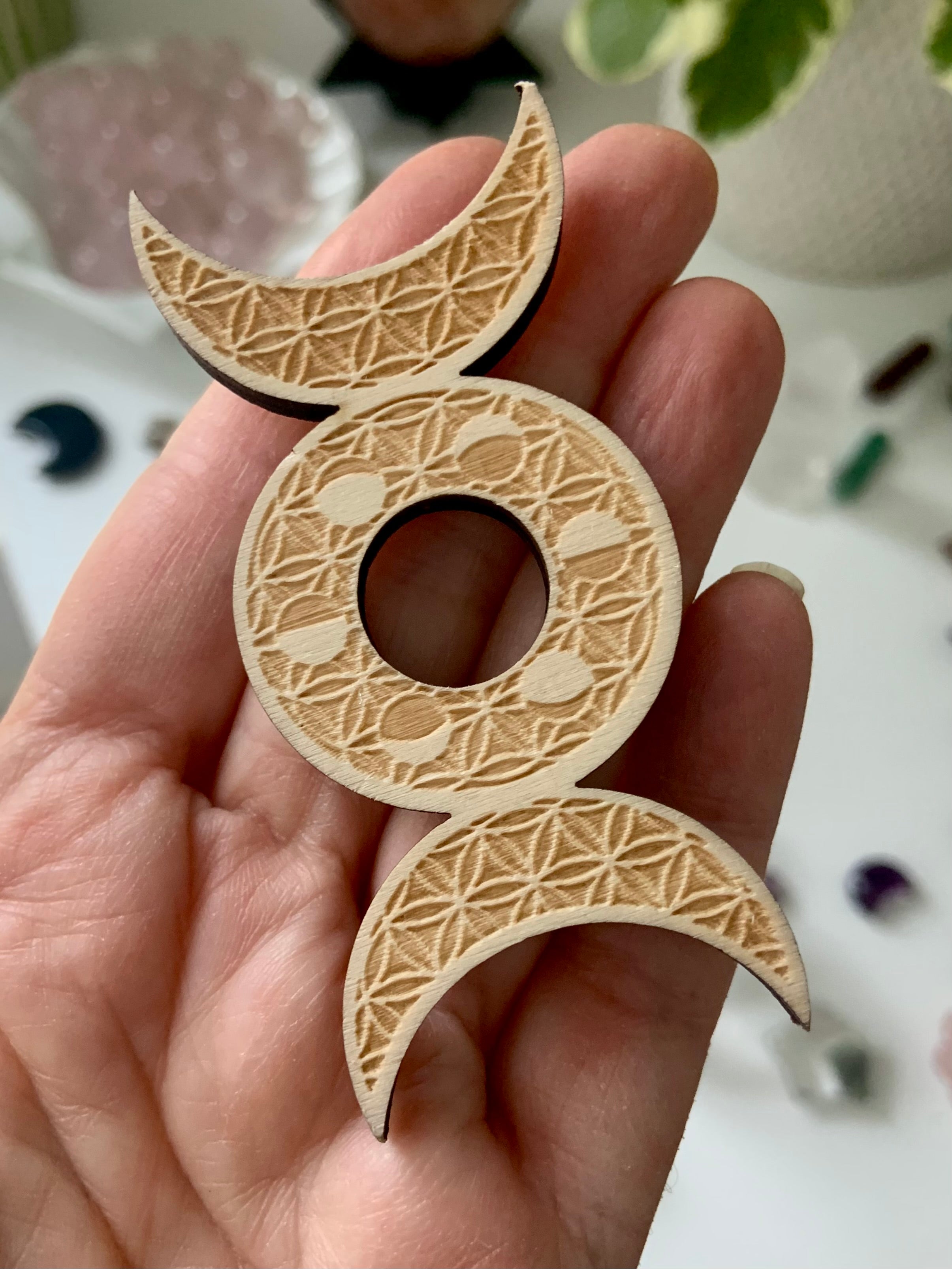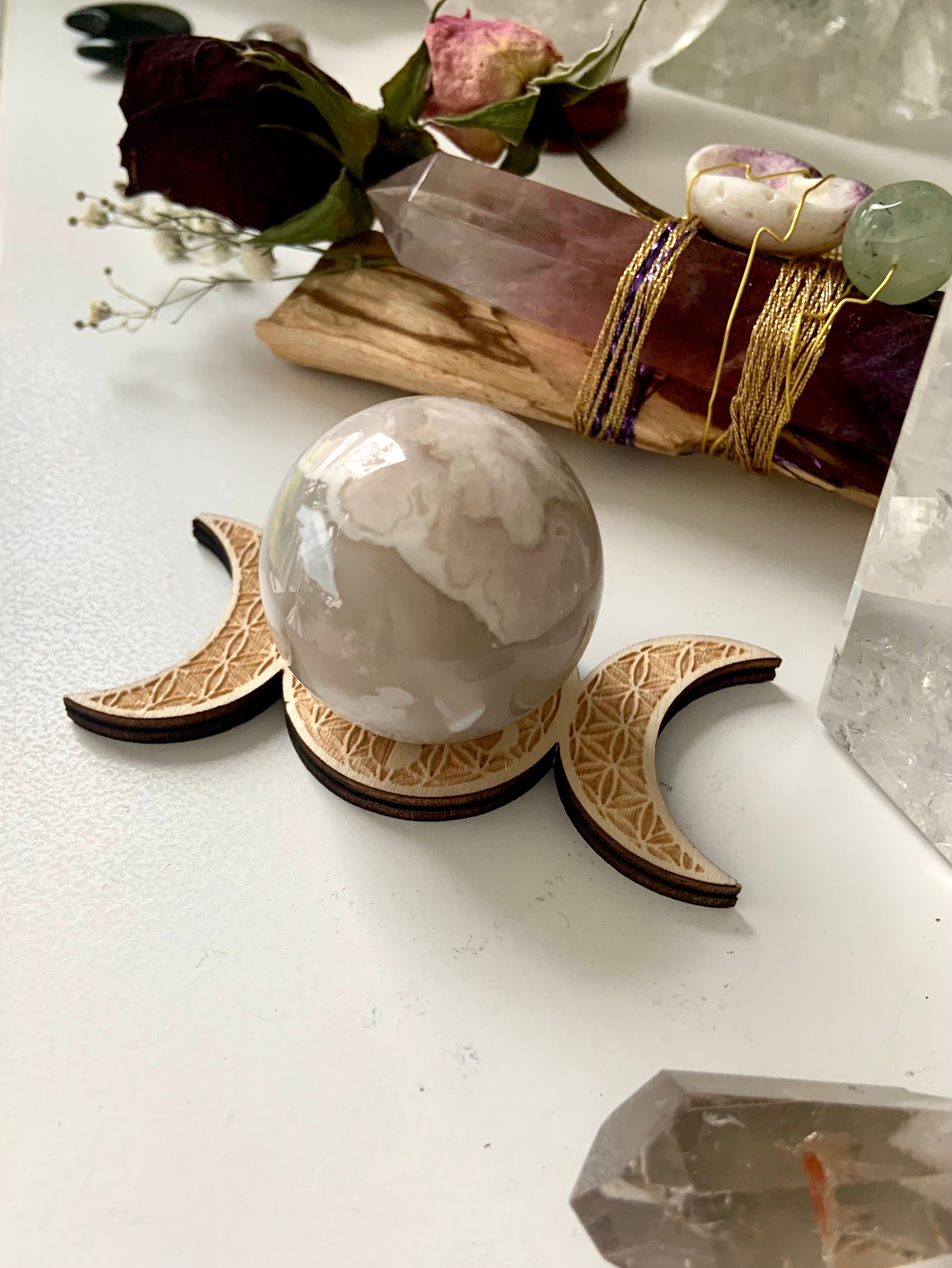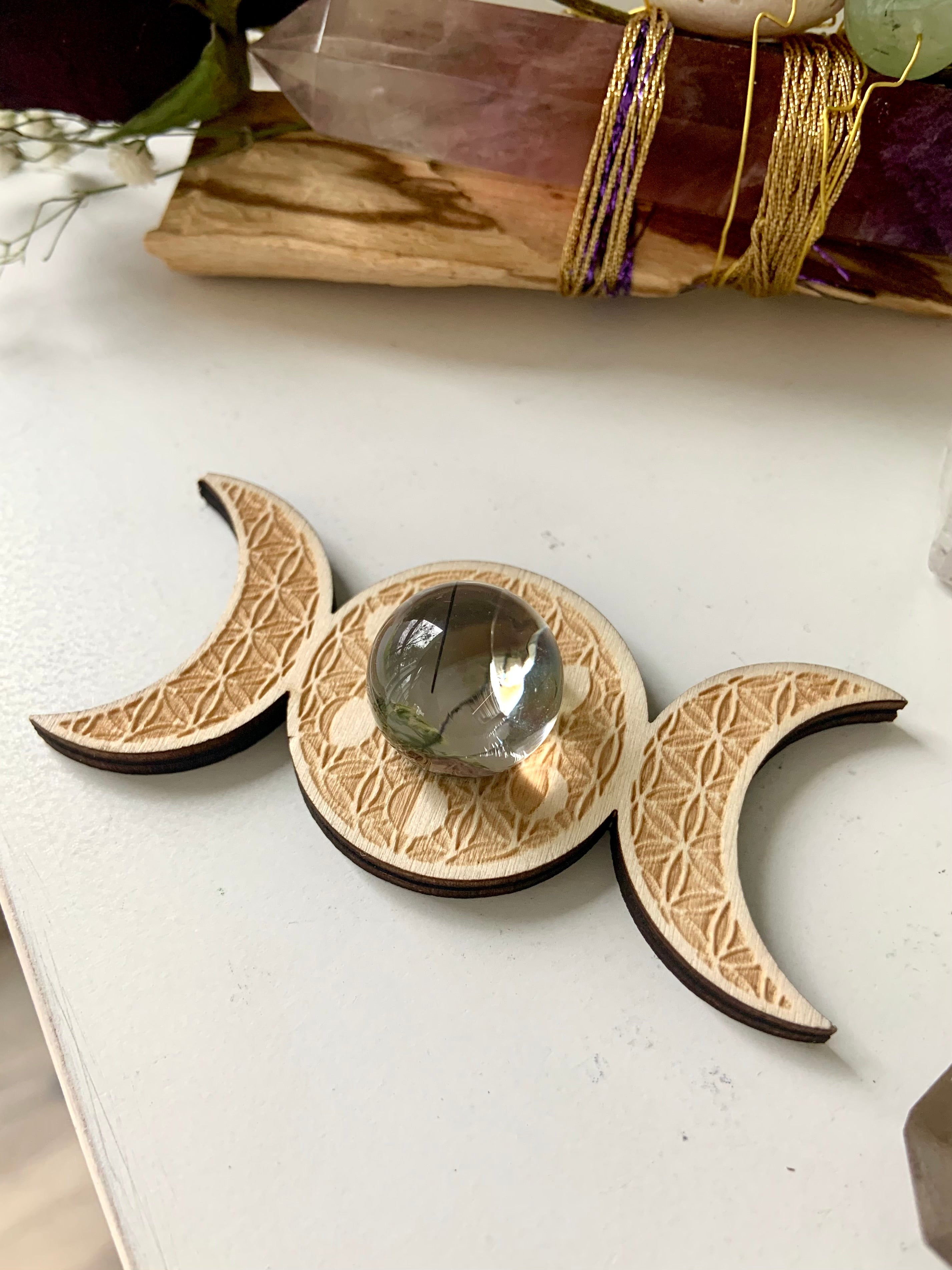 This beautiful Triple Moon Sphere Stand + Crystal Holder is made from light colored wood shaped like the triple moon symbol with moon phase + flower of life design laser etched into the natural wood. This lovely + versatile crystal holder will hold a variety of different pieces in your crystal collection + make a beautiful base to display your special crystals.