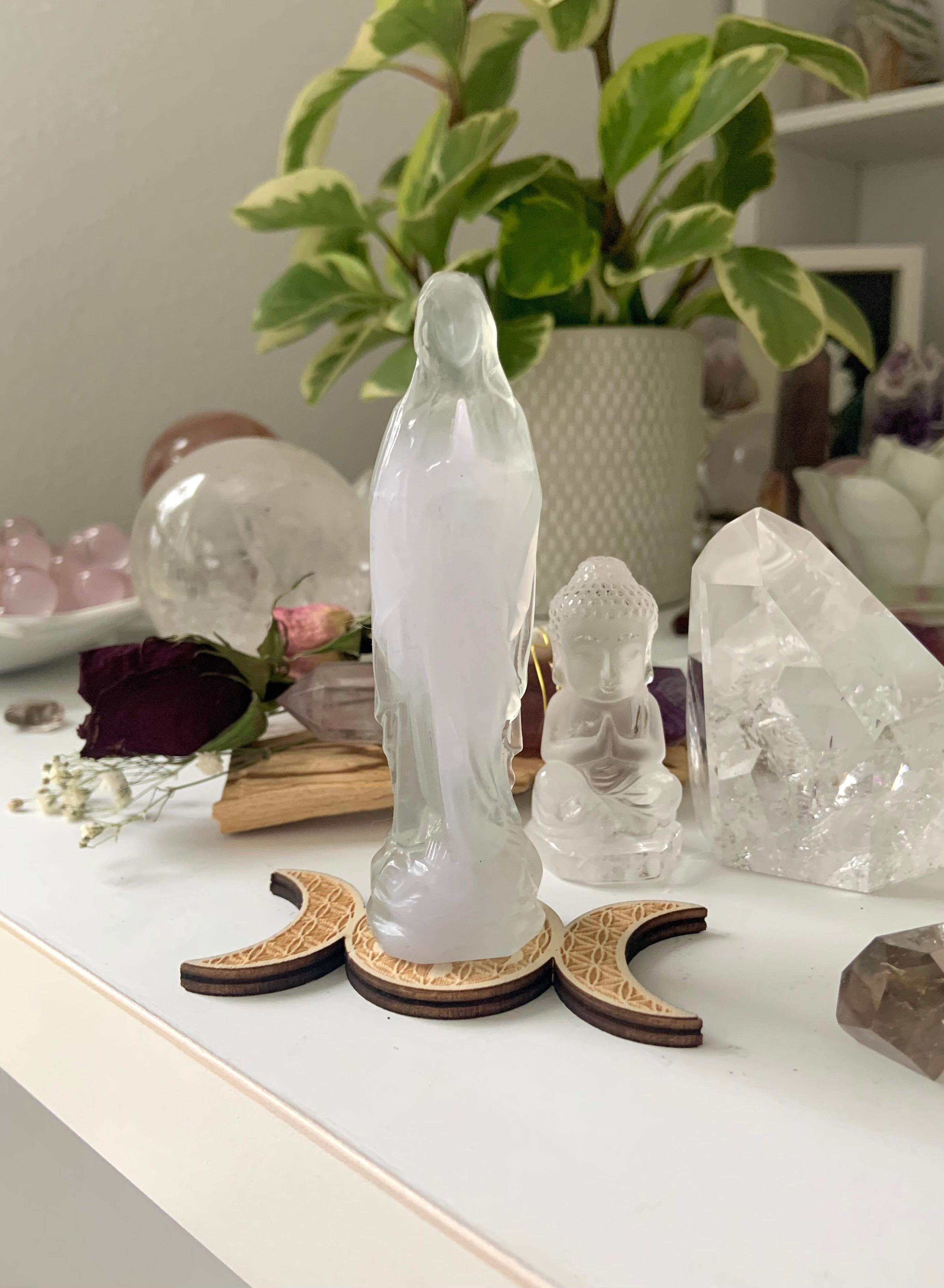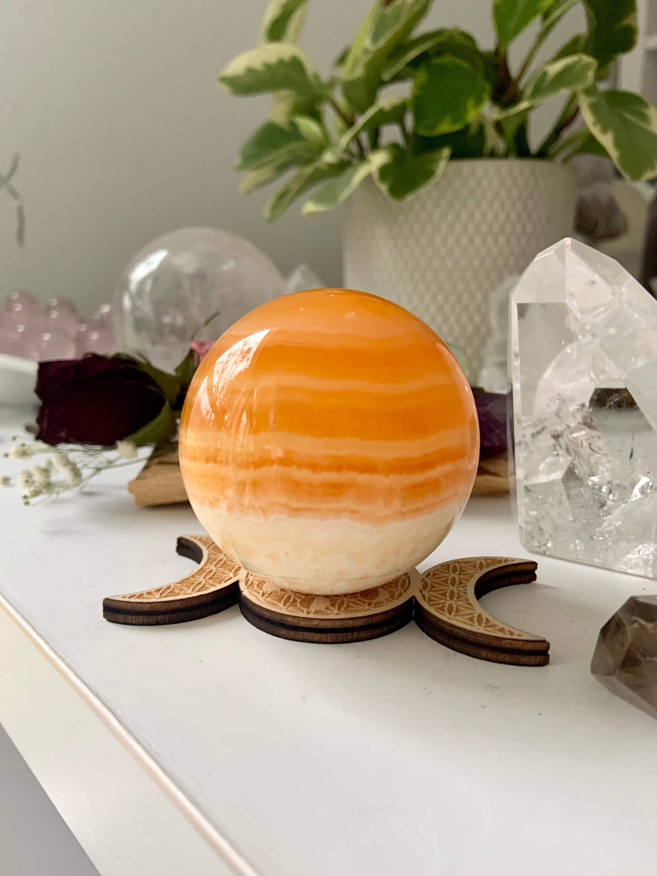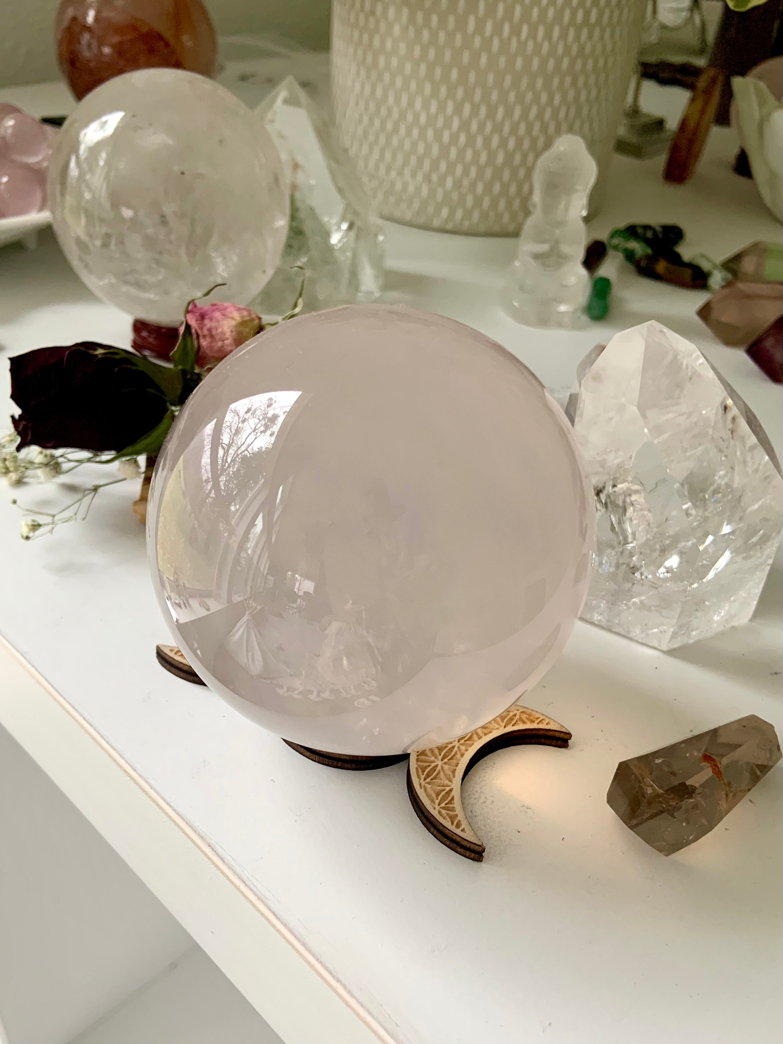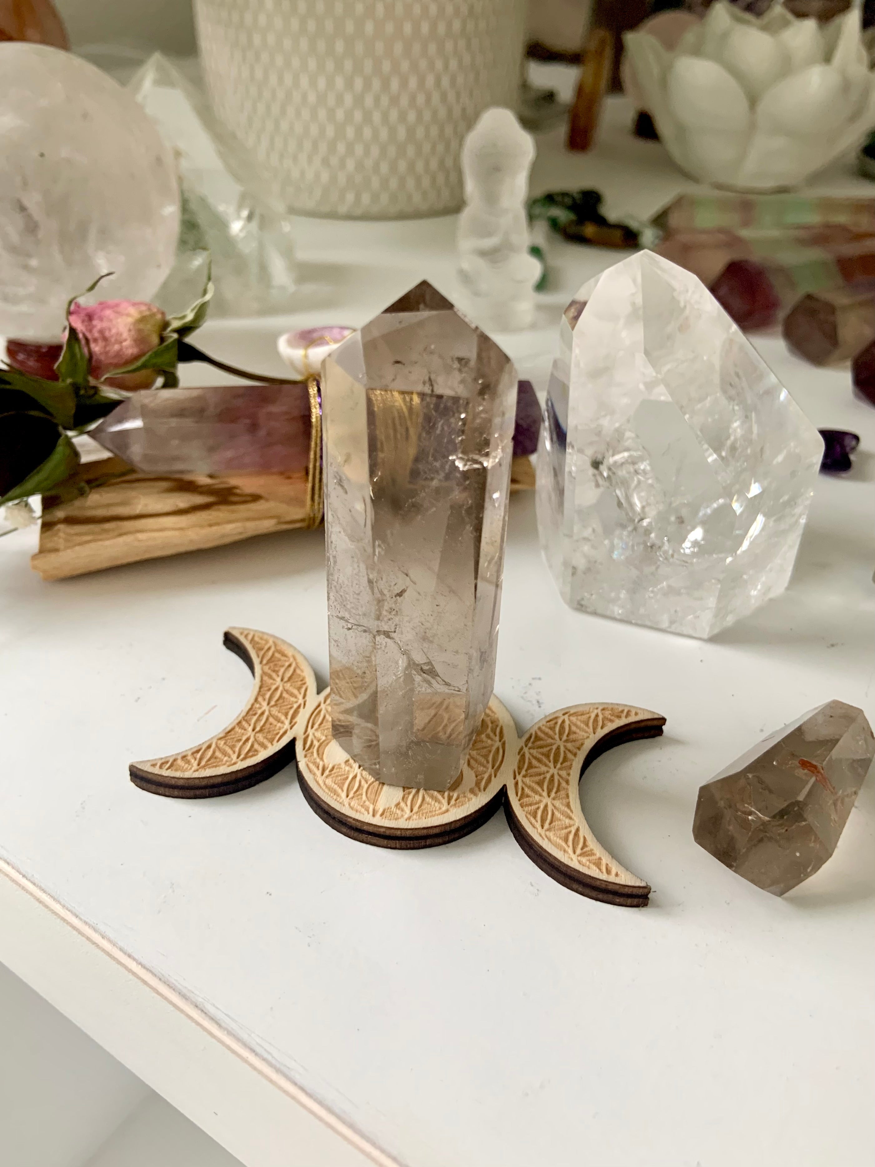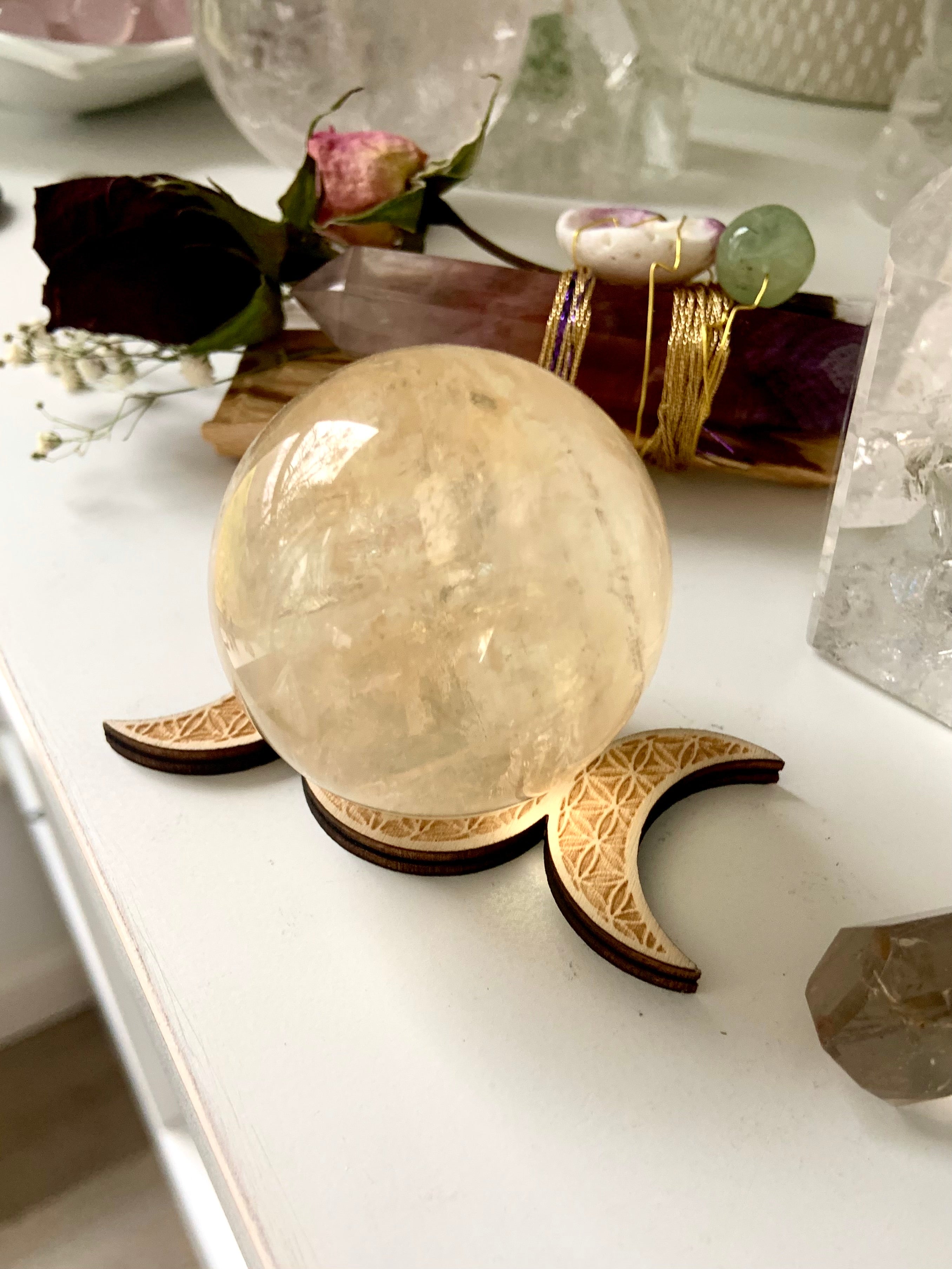 This beautiful Triple Moon Sphere Stand + Crystal Holder is made from light colored wood shaped like the triple moon symbol with moon phase + flower of life design laser etched into the natural wood. This lovely + versatile crystal holder will hold a variety of different pieces in your crystal collection + make a beautiful base to display your special crystals.