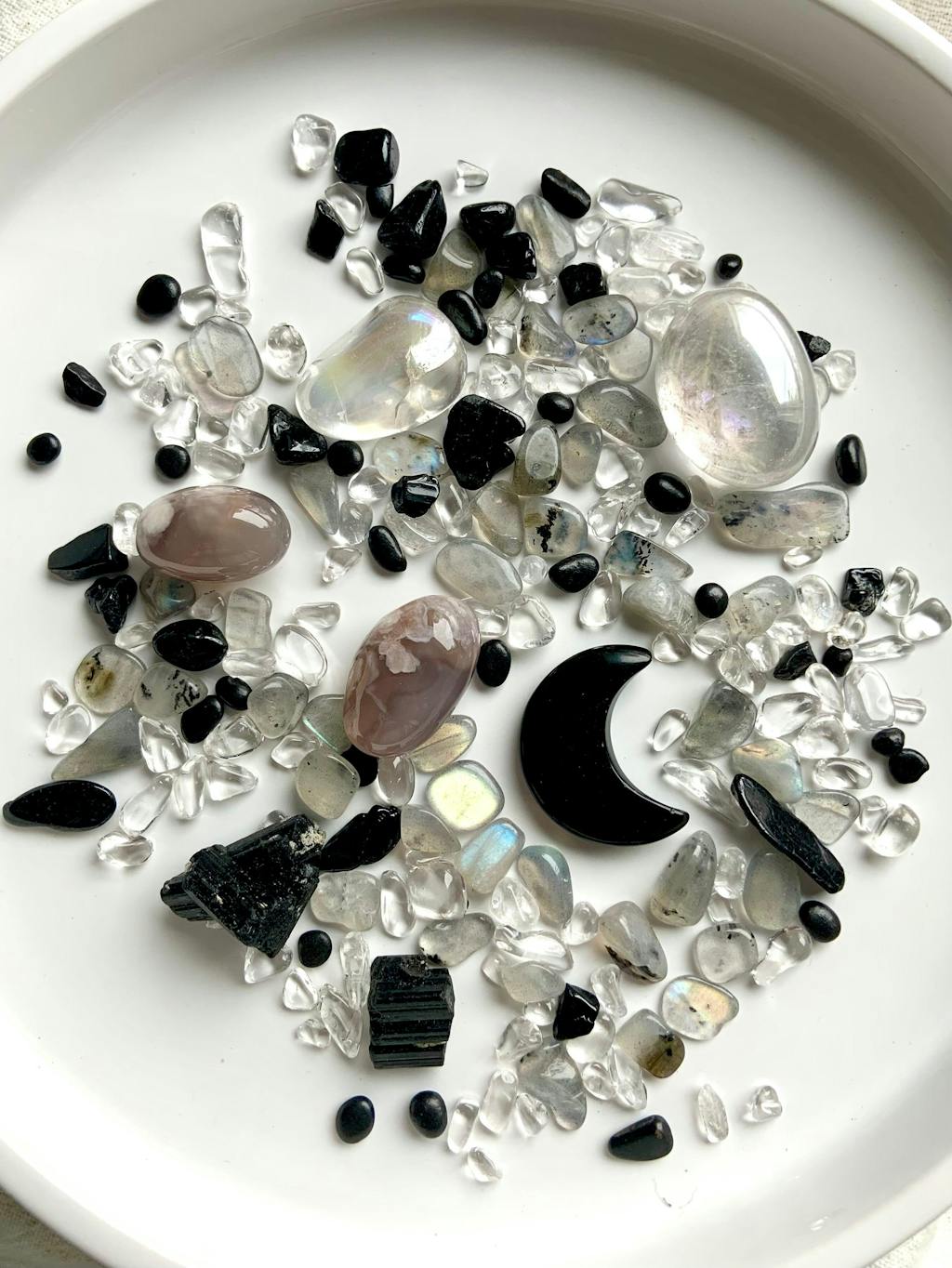 Our Moon Phase Crystal Confetti is a blend of black tourmaline, shungite, labradorite, and clear quartz crystal chips with a black obsidian moon carving. Or choose the bigger option with tumbles including opal aura and black flower agate with rough black tourmaline crystals mixed in with the chips and obsidian crescent moon, and add a cute heart bowl to make a great gift.