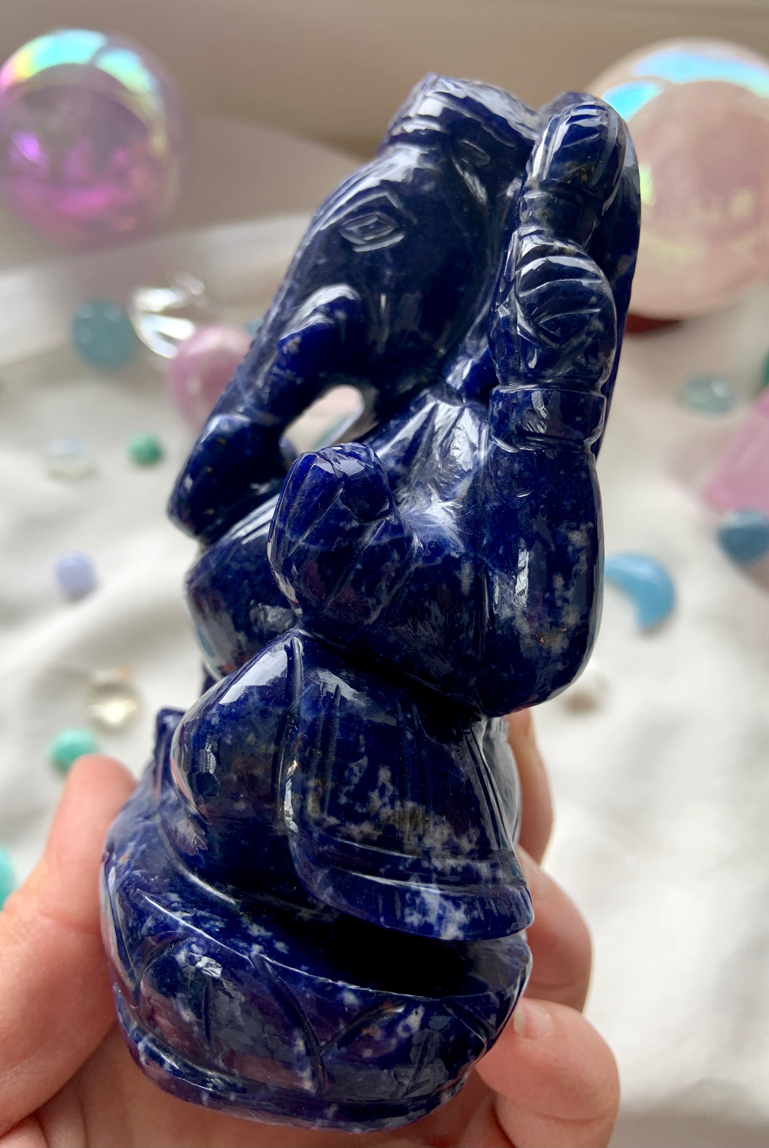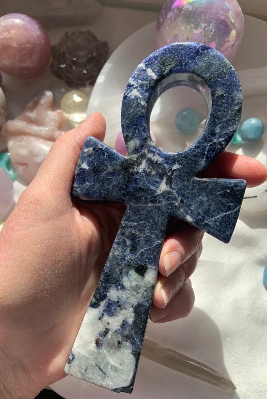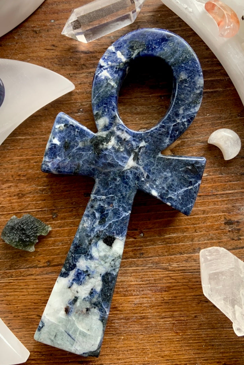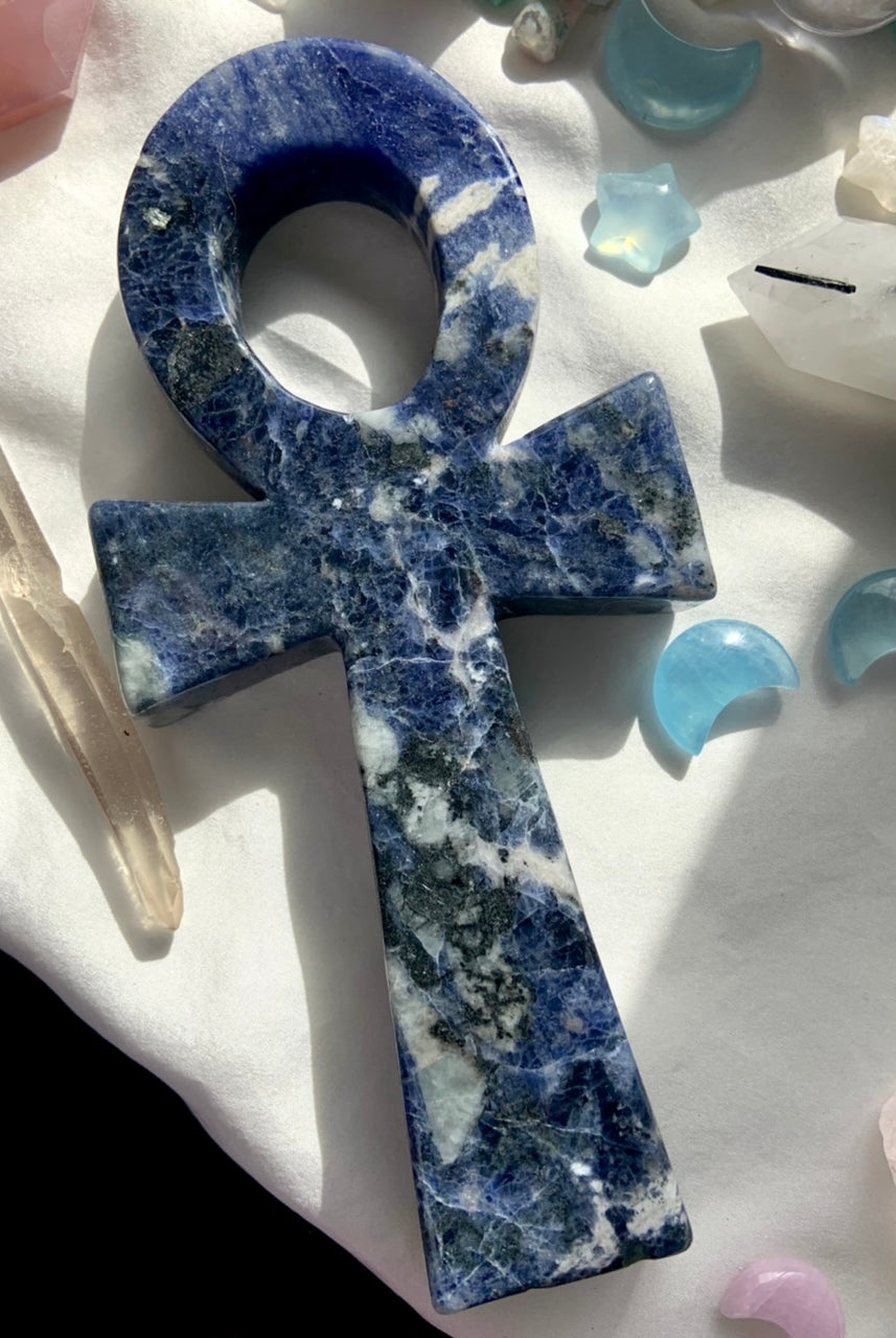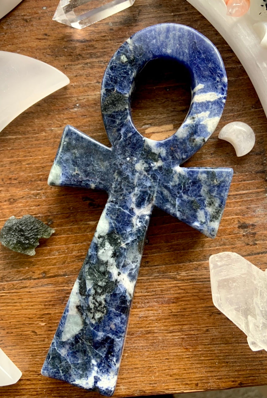 This collection features UV reactive Sodalite palm stones, with a rotating selection of one-of-a-kind carvings—like skulls, ankhs, and Ganesha—alongside bowls, towers, spheres, and handcrafted jewelry. Raw and part-polished pieces are coming soon, as well as a featured spot in our upcoming Throat Chakra crystal set. Whether you’re working with dreams, expression, or inner clarity, Sodalite offers a steady and sacred presence.