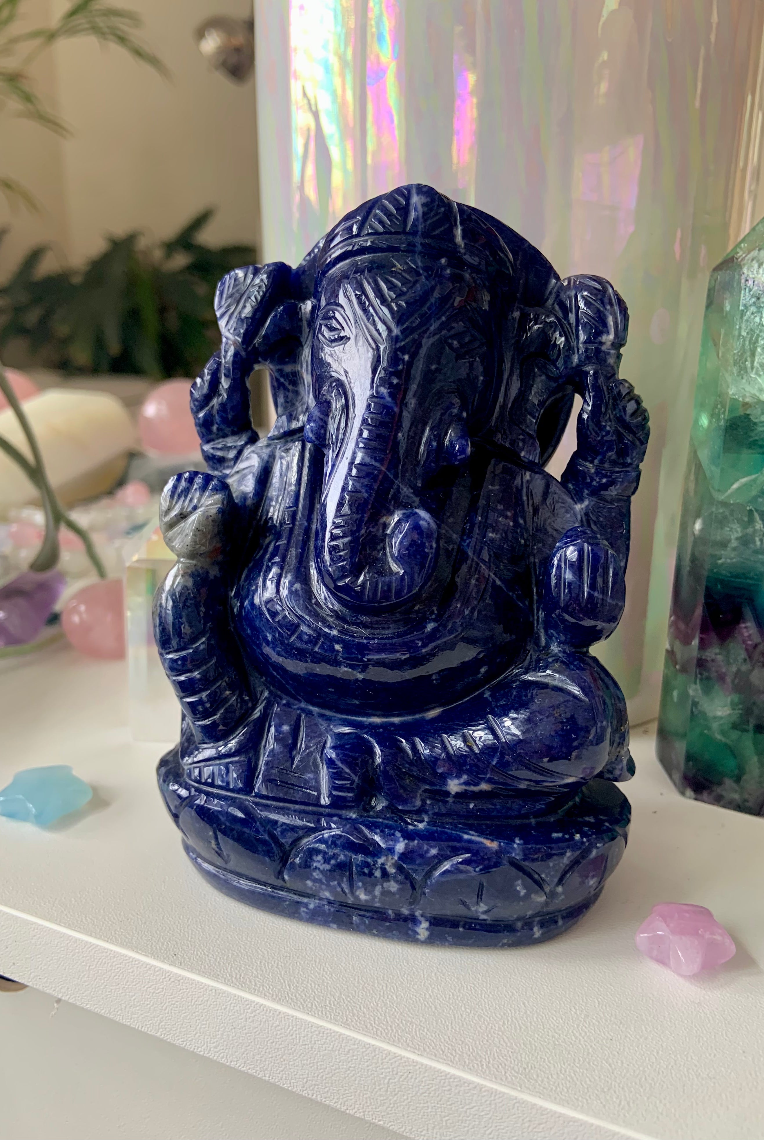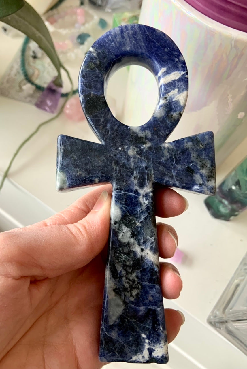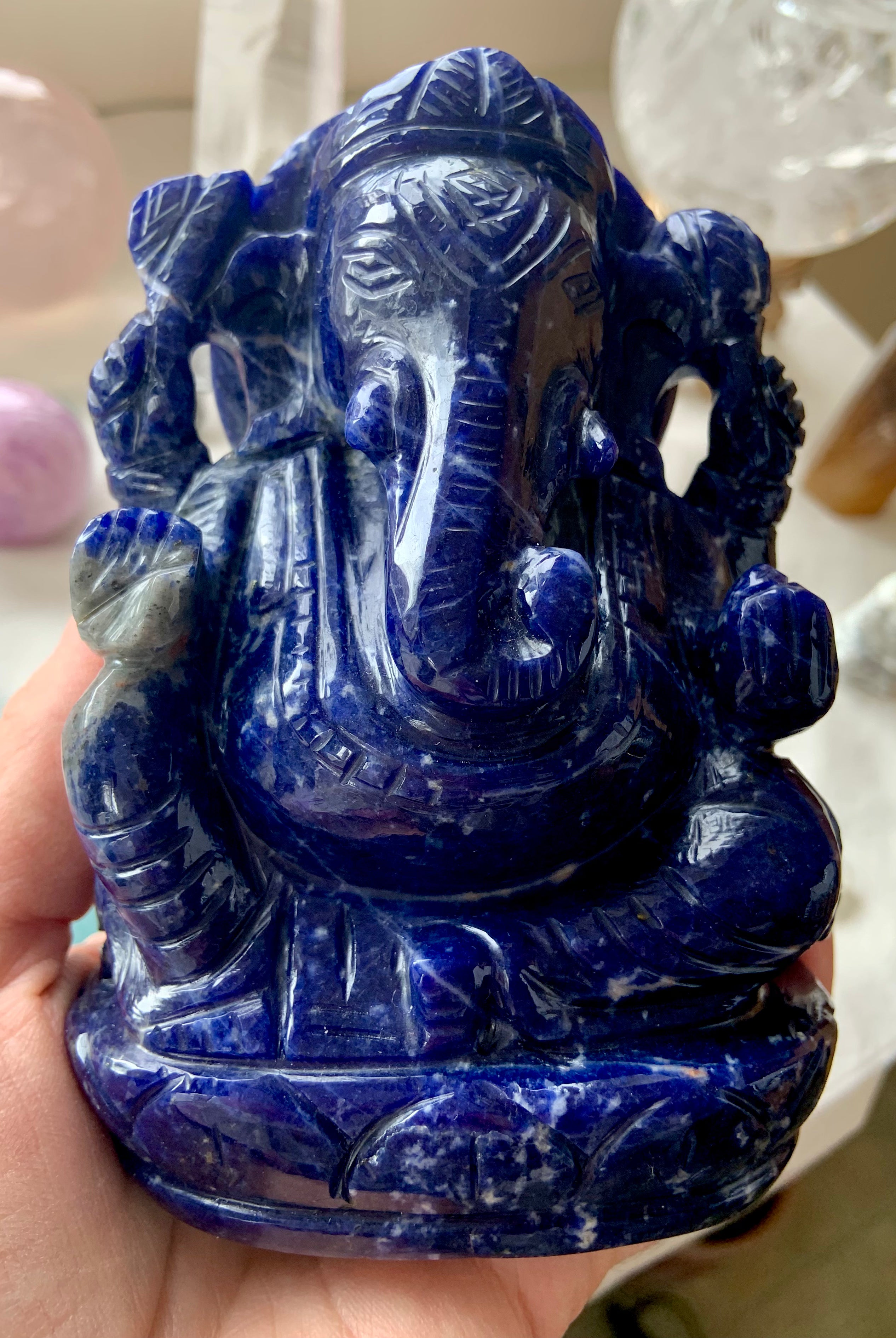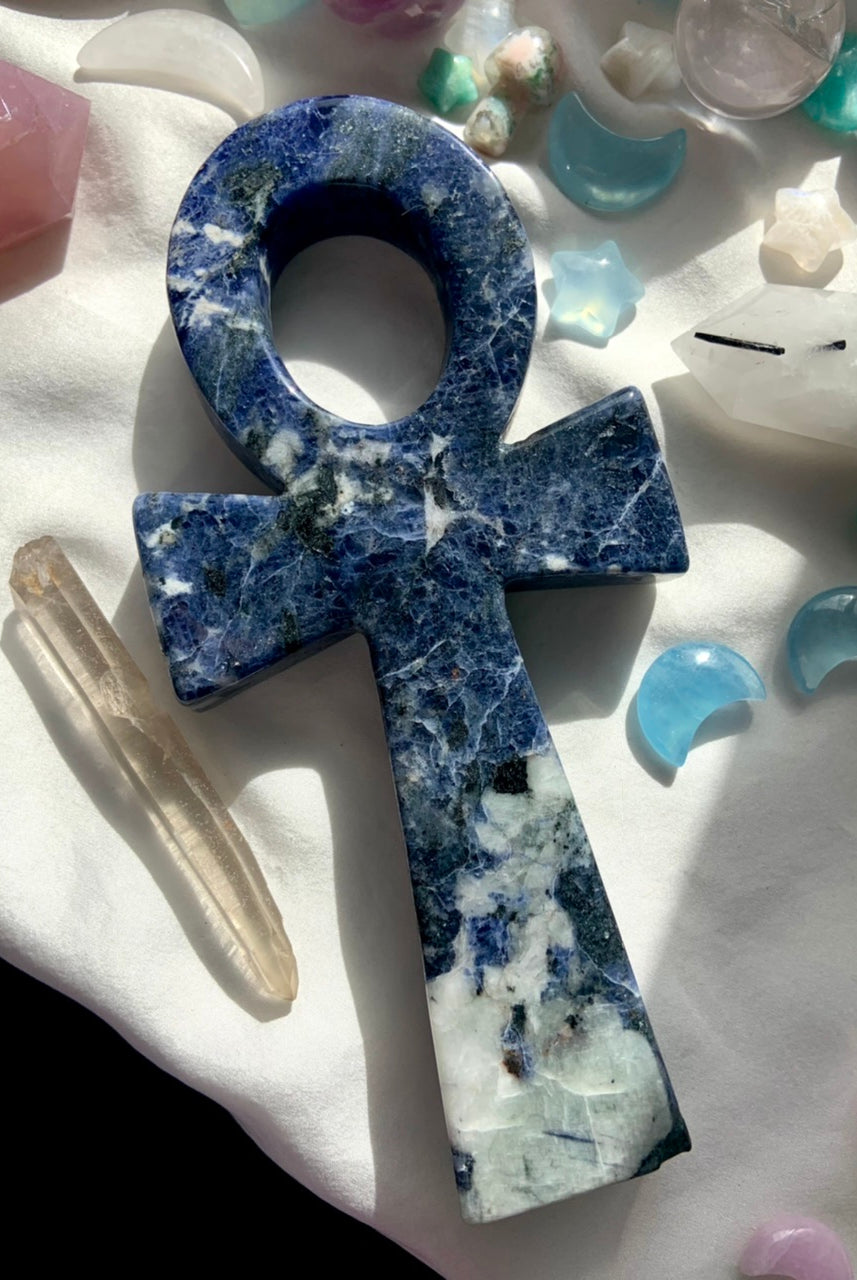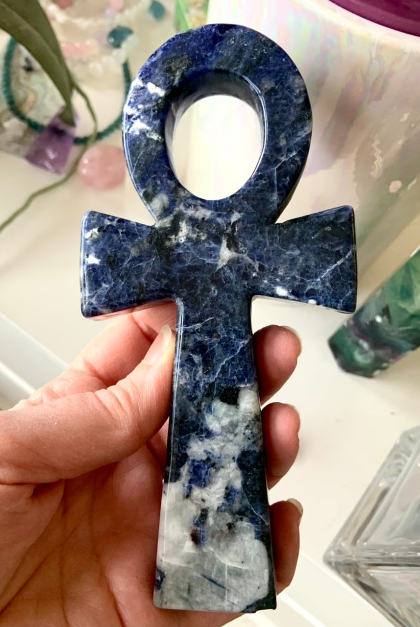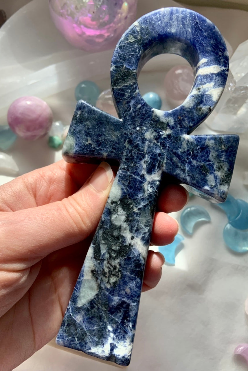 This collection features UV reactive Sodalite palm stones, with a rotating selection of one-of-a-kind carvings—like skulls, ankhs, and Ganesha—alongside bowls, towers, spheres, and handcrafted jewelry. Raw and part-polished pieces are coming soon, as well as a featured spot in our upcoming Throat Chakra crystal set. Whether you’re working with dreams, expression, or inner clarity, Sodalite offers a steady and sacred presence.