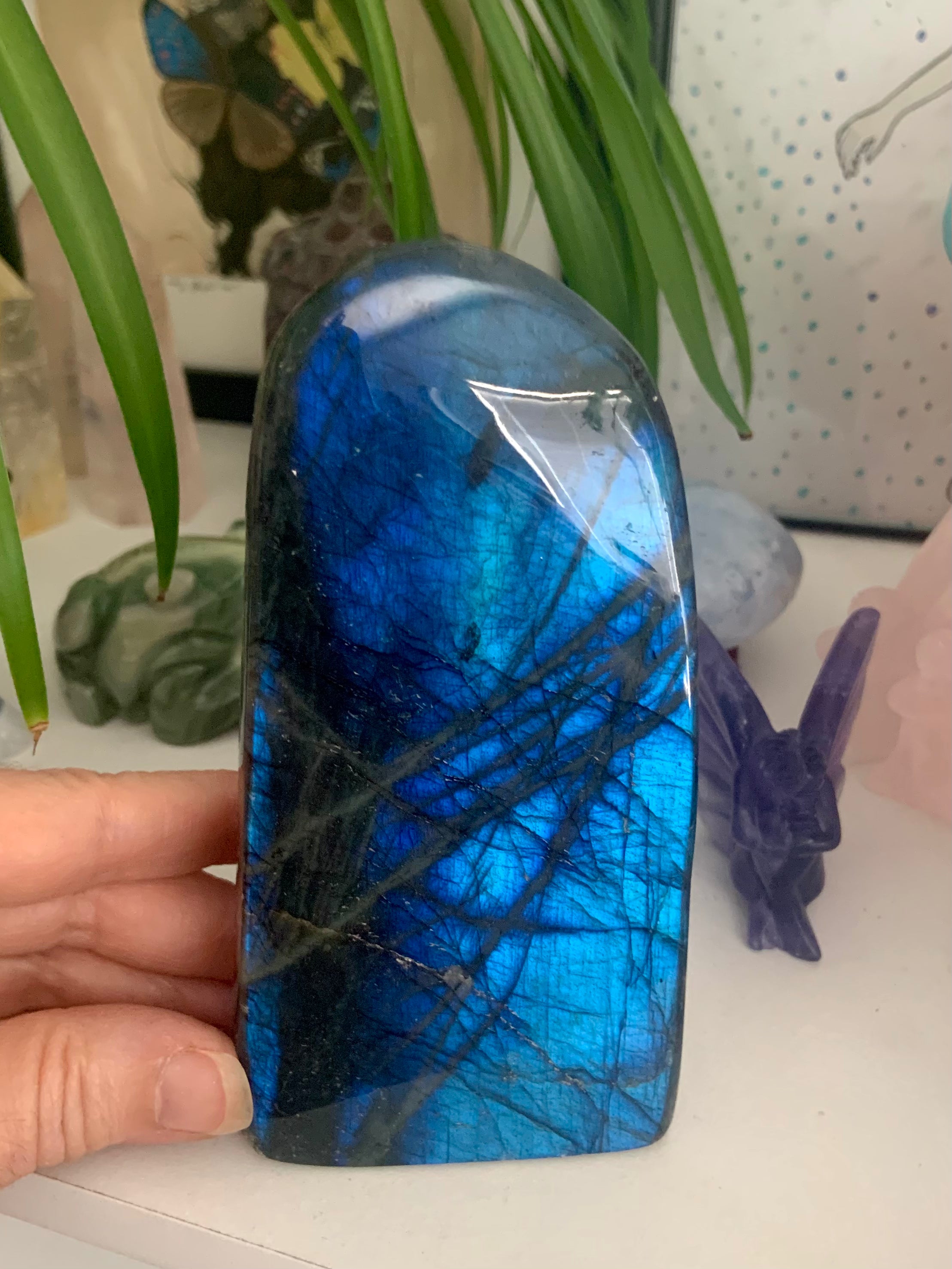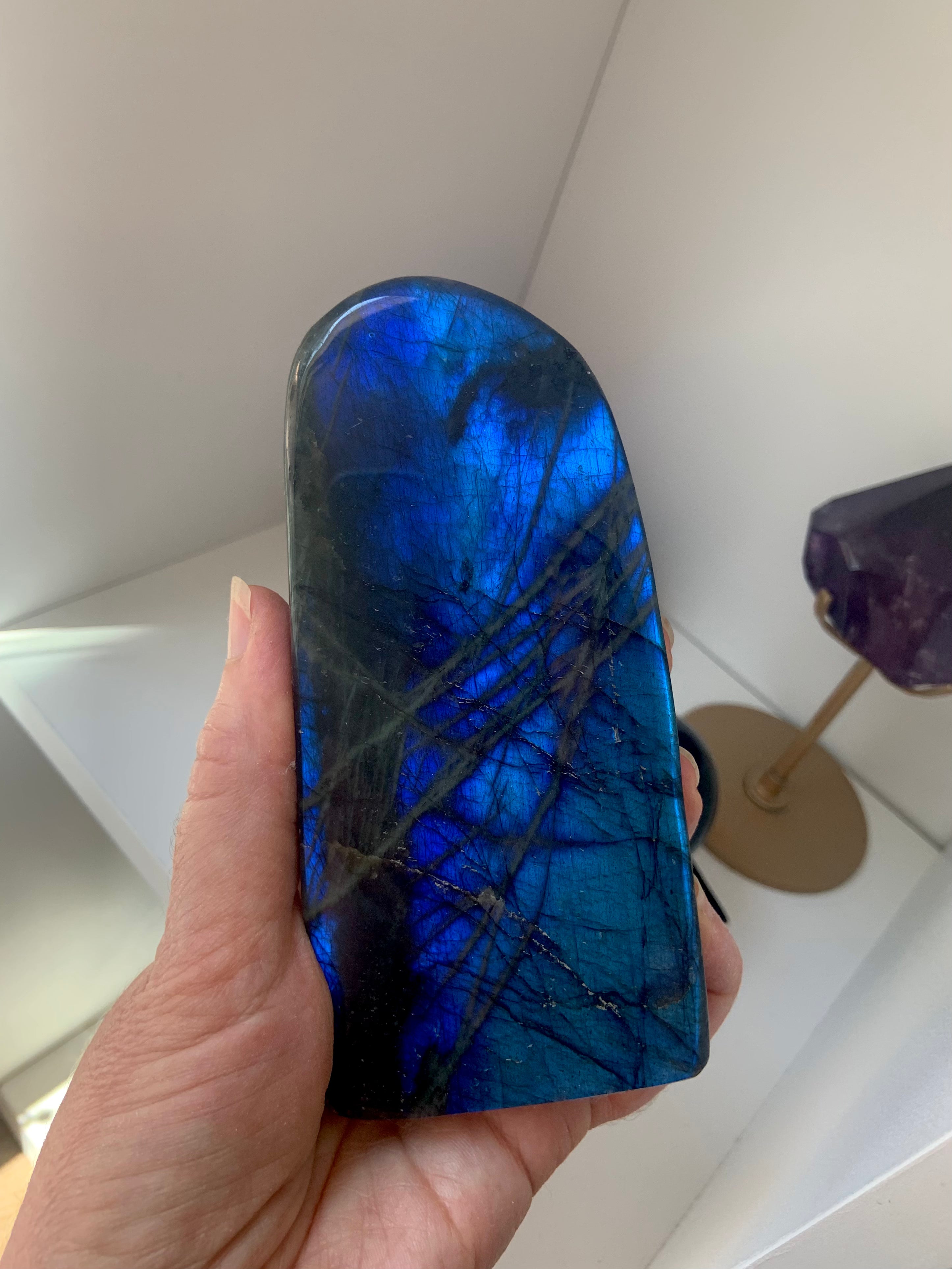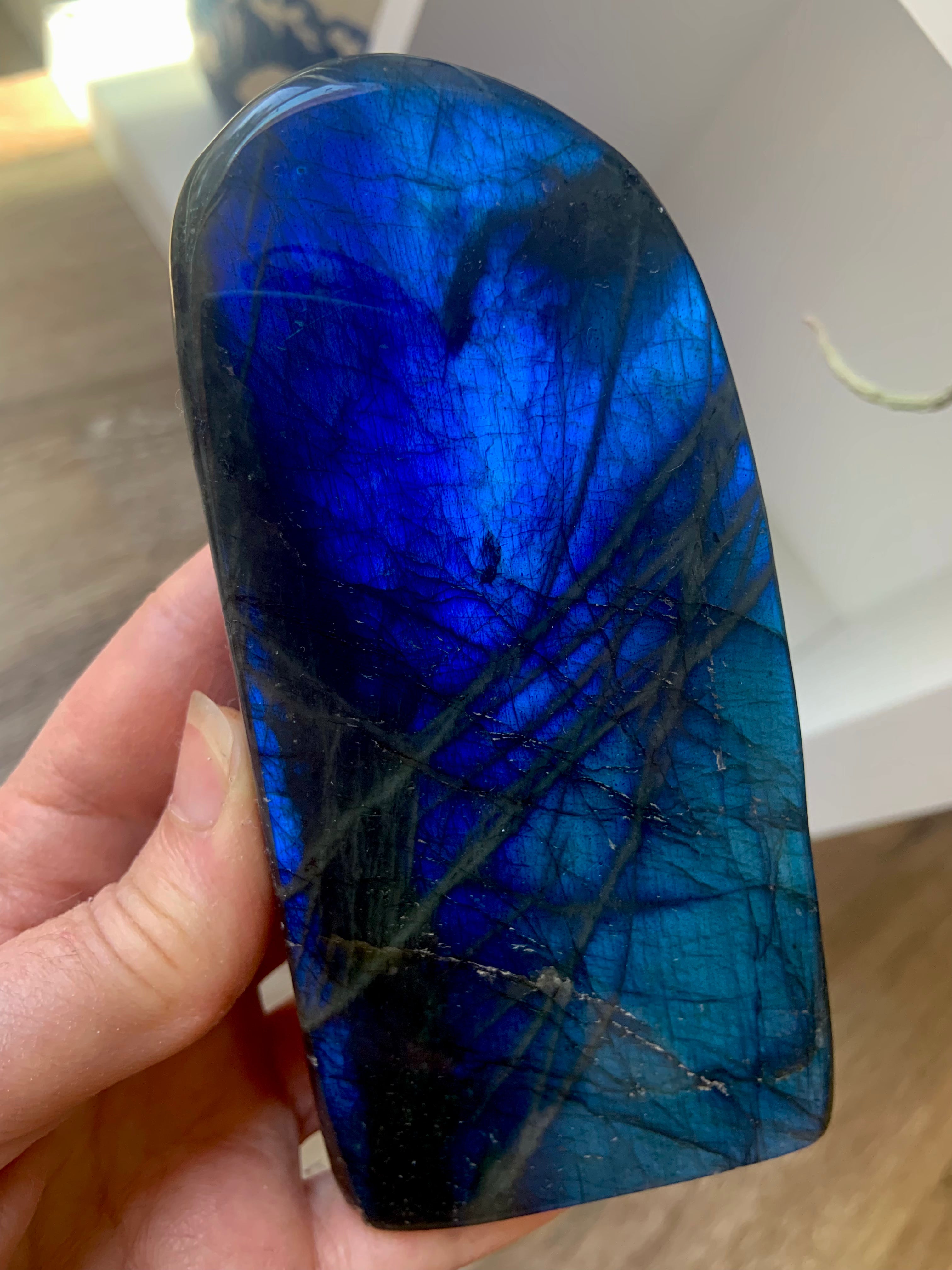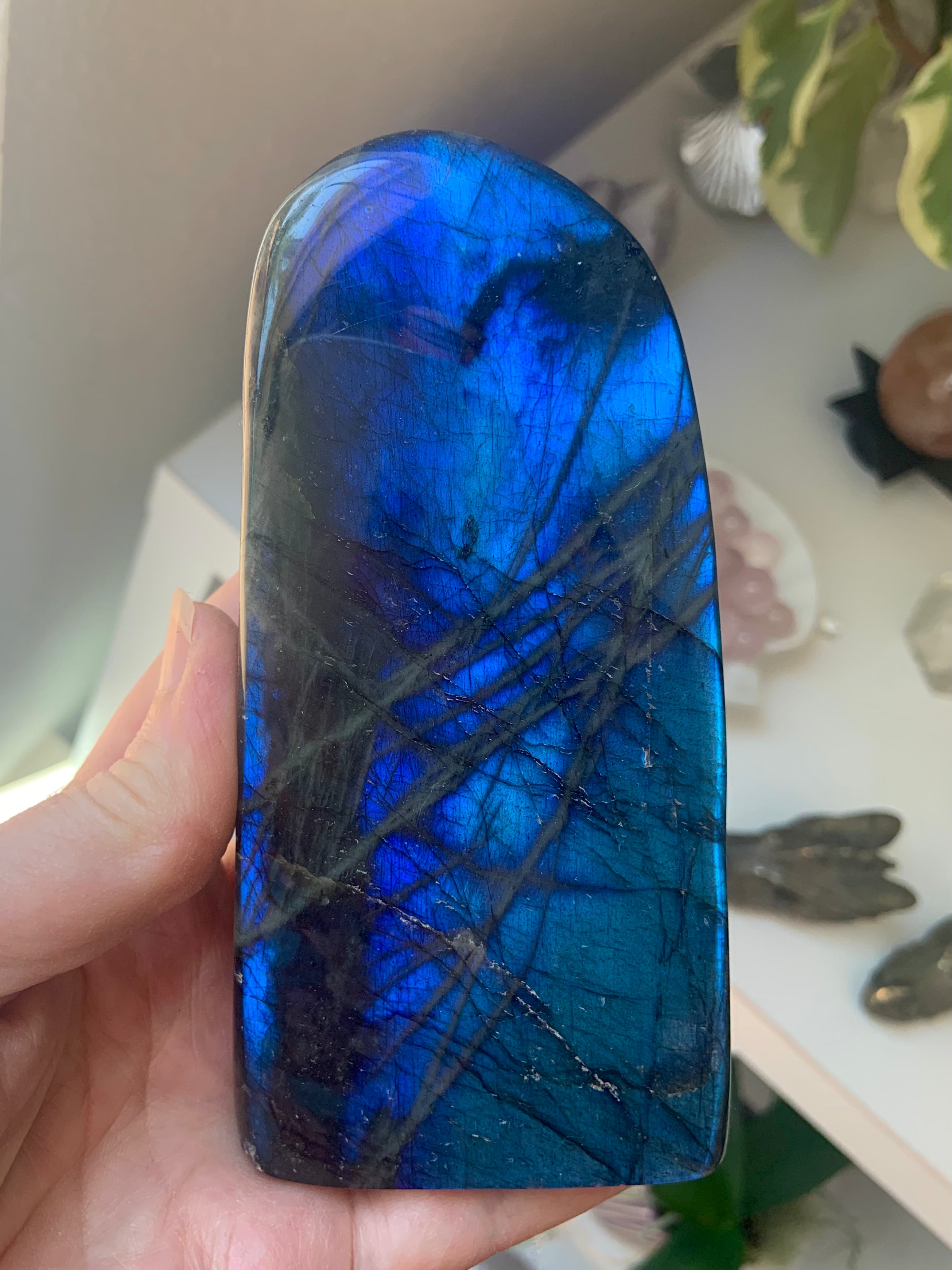 This special collector's piece will make a beautiful + powerful impact on your space. It's a lovely rounded free from shape with a flat bottom, creating a lovely window of blue flash. A statement piece for your altar, bedside table, meditation space, den, office, or treatment room.