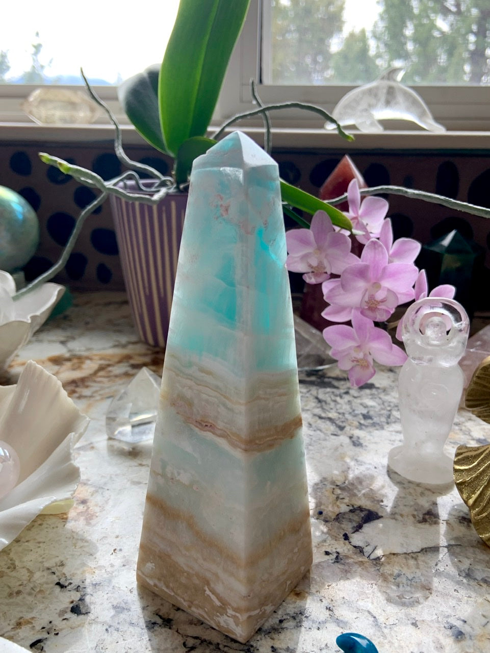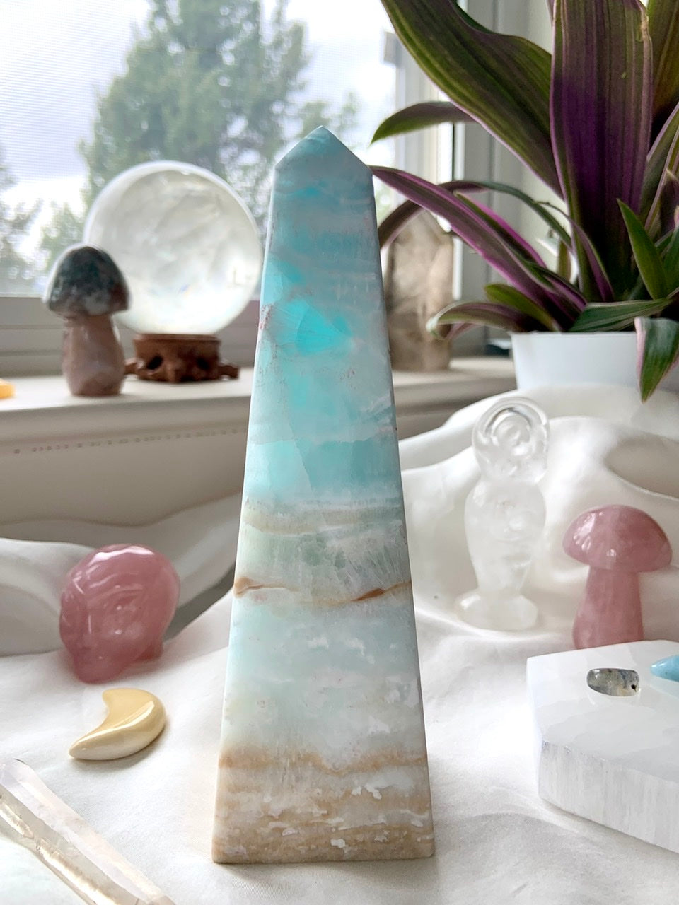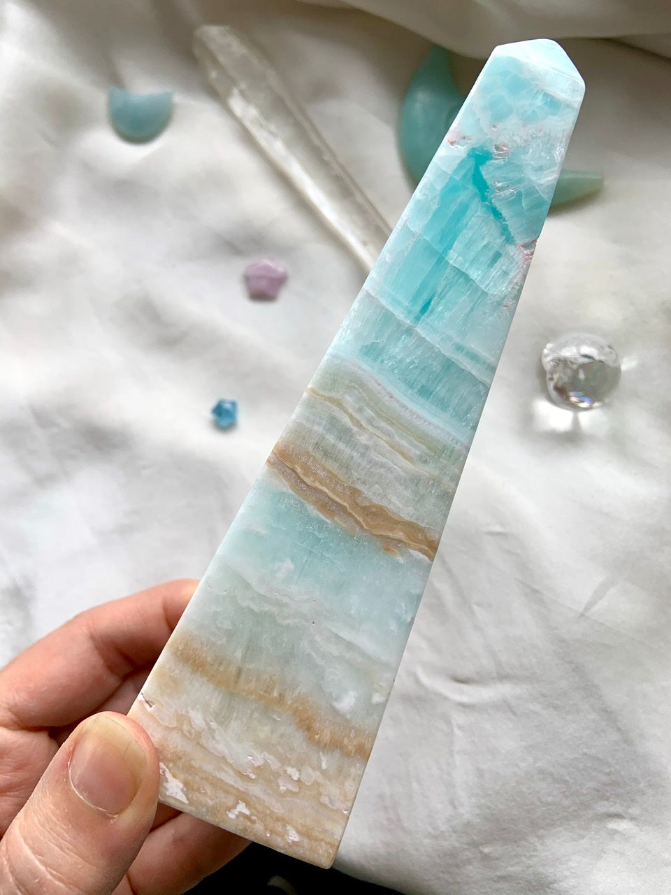 Caribbean Calcite resonates with the heart, throat + third eye chakras. It's a joyful, expansive stone which opens your capacity for compassion, hones your intuition + sparks creativity.