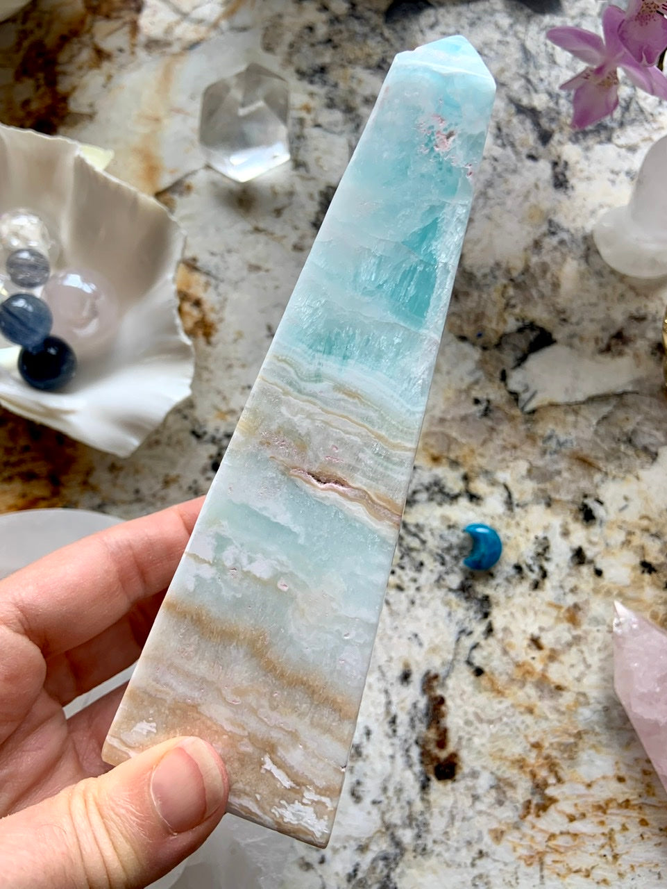 Caribbean Calcite aka Blue Aragonite, is a combination of a very light ocean Blue Calcite with light brown, white + sometimes pink Aragonite. This stone is a relatively new find from Pakistan. This stone has natural crevices + cavities in the layers of minerals,