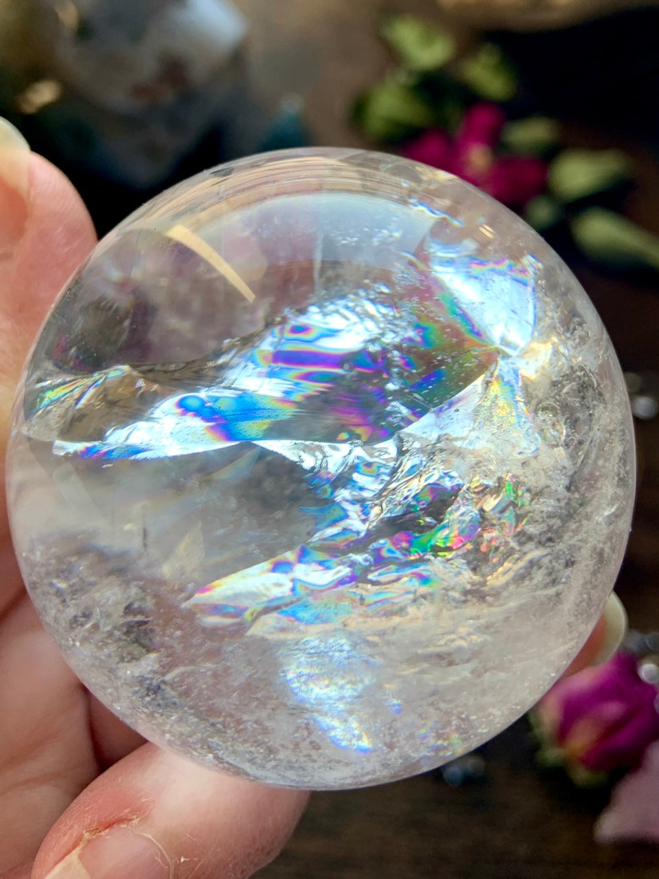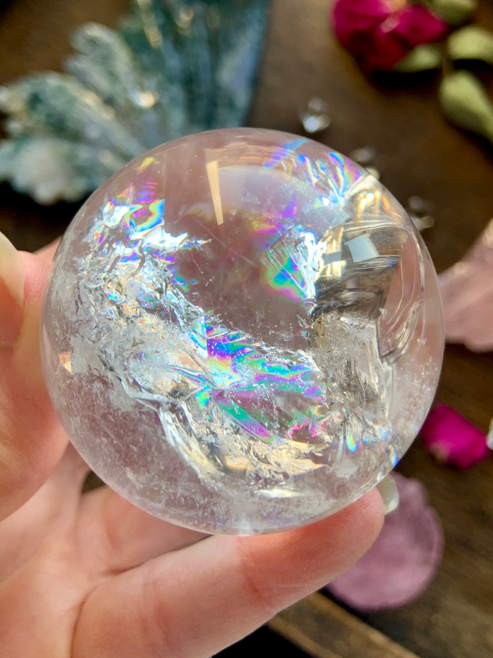Crystal Spheres radiate energy in all directions. The crystal ball shape allows the light + energy to move above, below + toward all four sacred directions of the crystal. Light passes through the crystalline core illuminating the brilliant rainbows + patterns of the natural quartz crystal from virtually every angle.⁠⁠