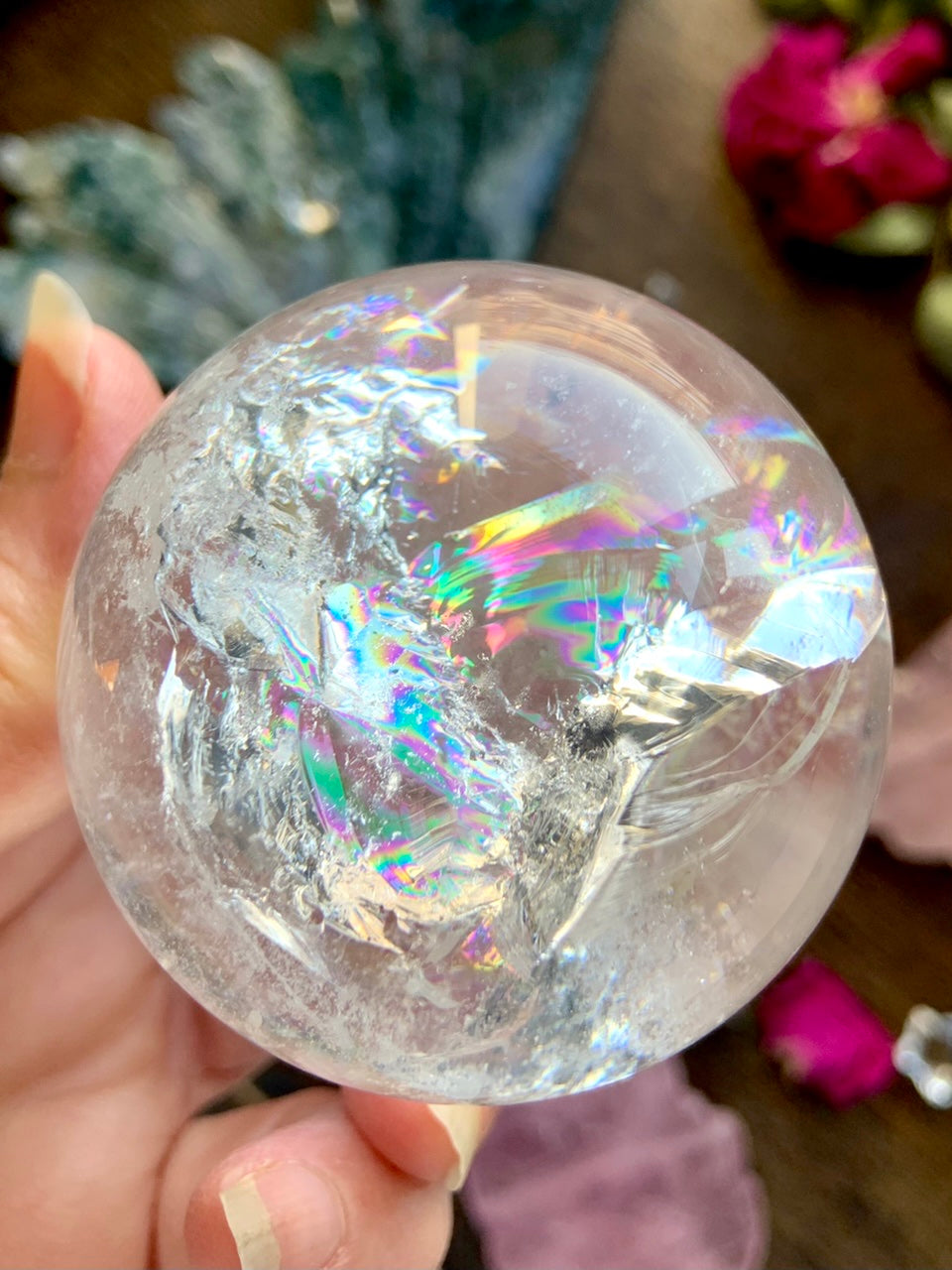 This gorgeous clear quartz sphere is filled with loads of magical rainbows + wildly  beautiful interior dimensions + silvery flash.