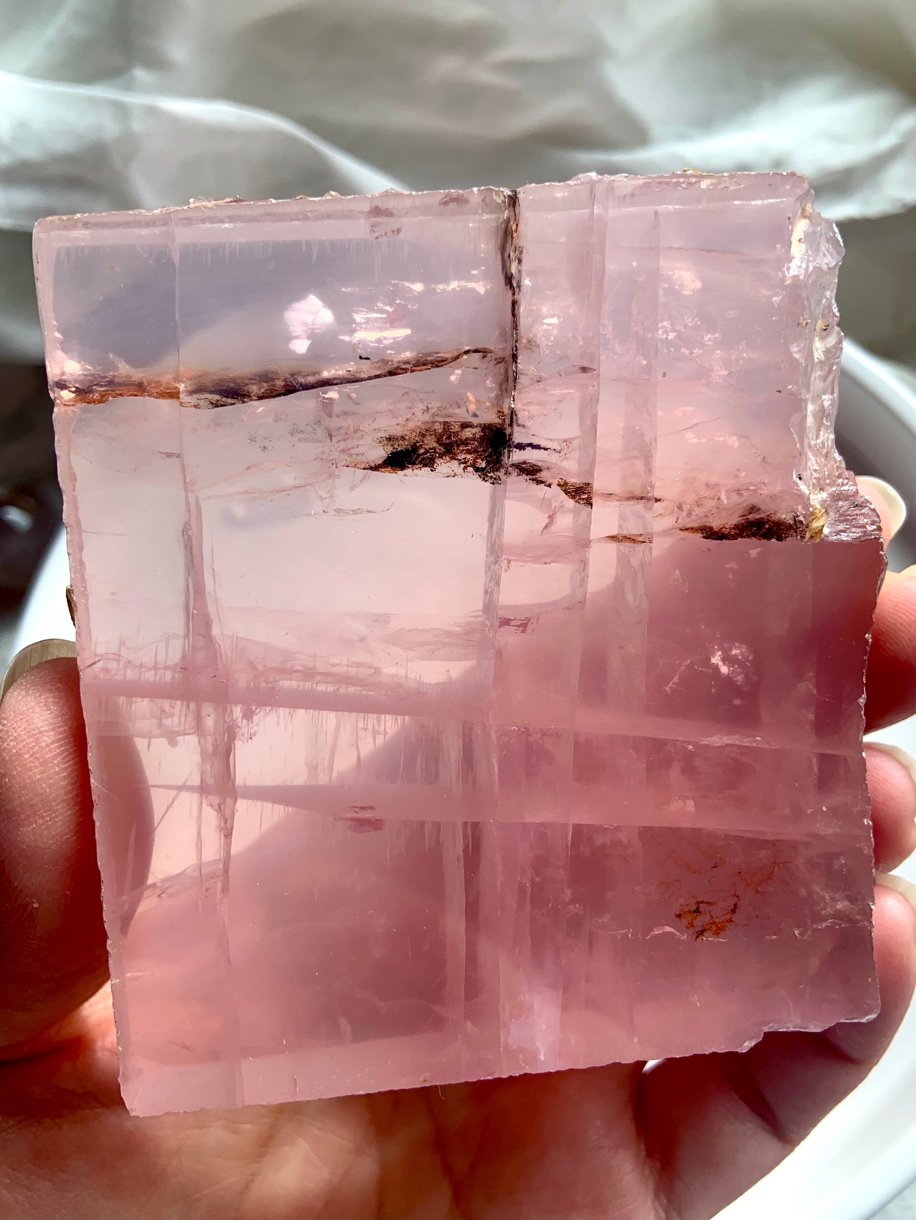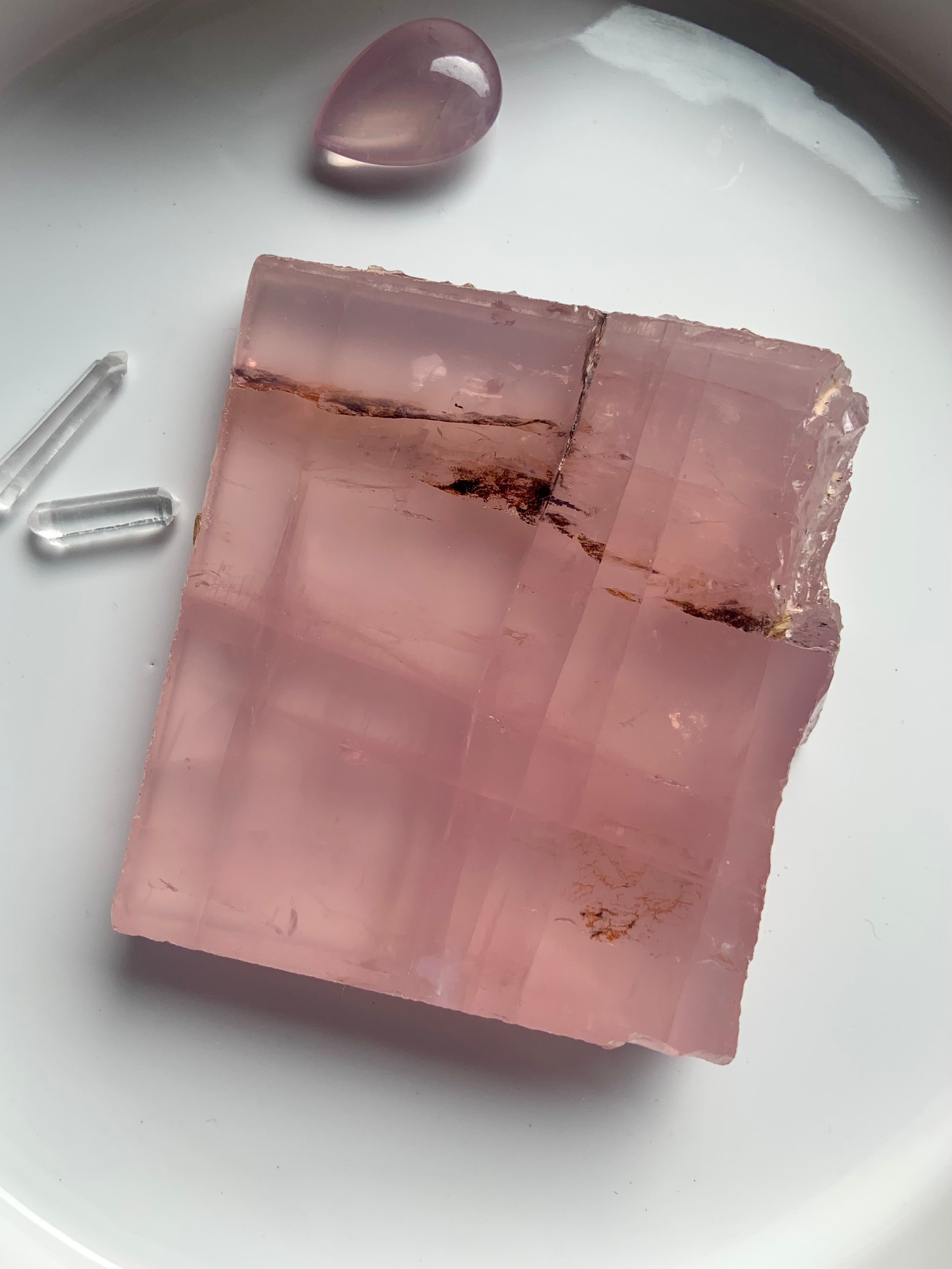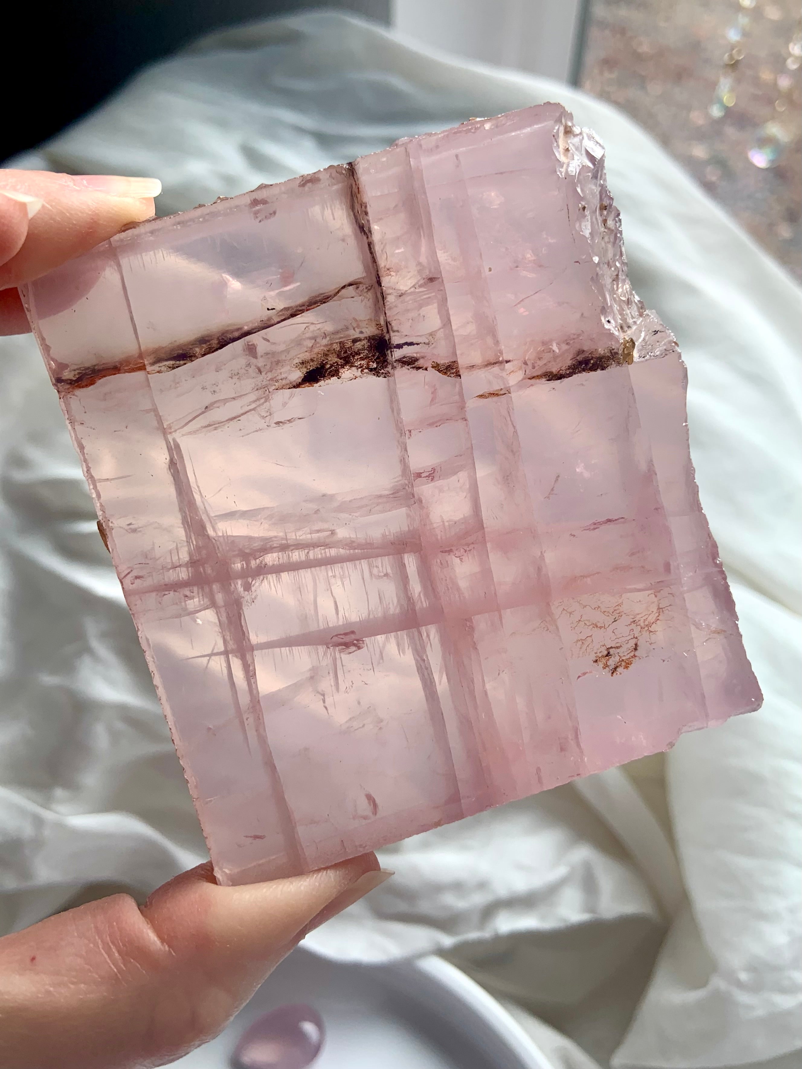 This very pink and gemmy, translucent Rose Quartz Crystal Slab from Mozambique with hematite inclusions and asterism is an absolute thing of beauty.