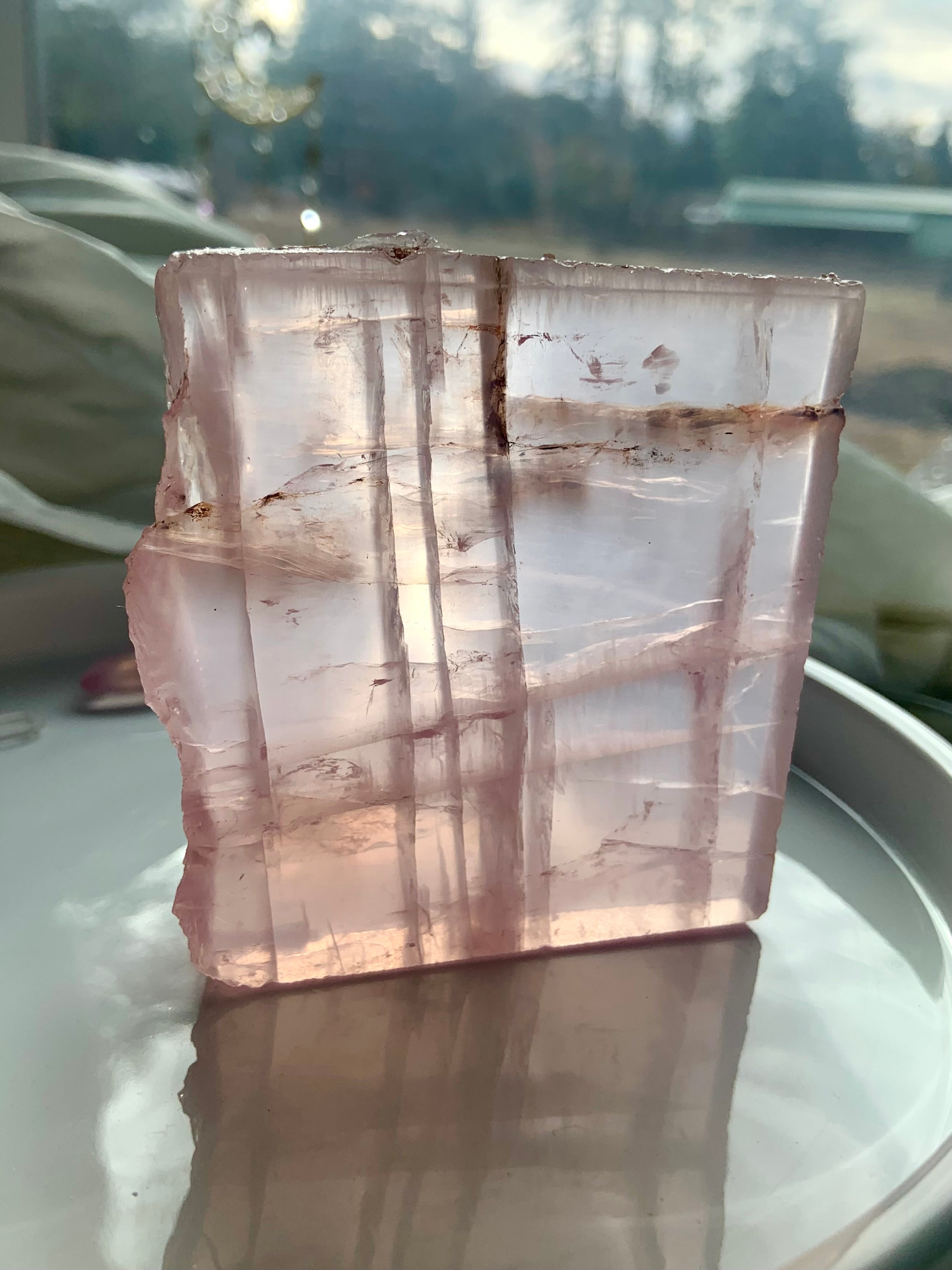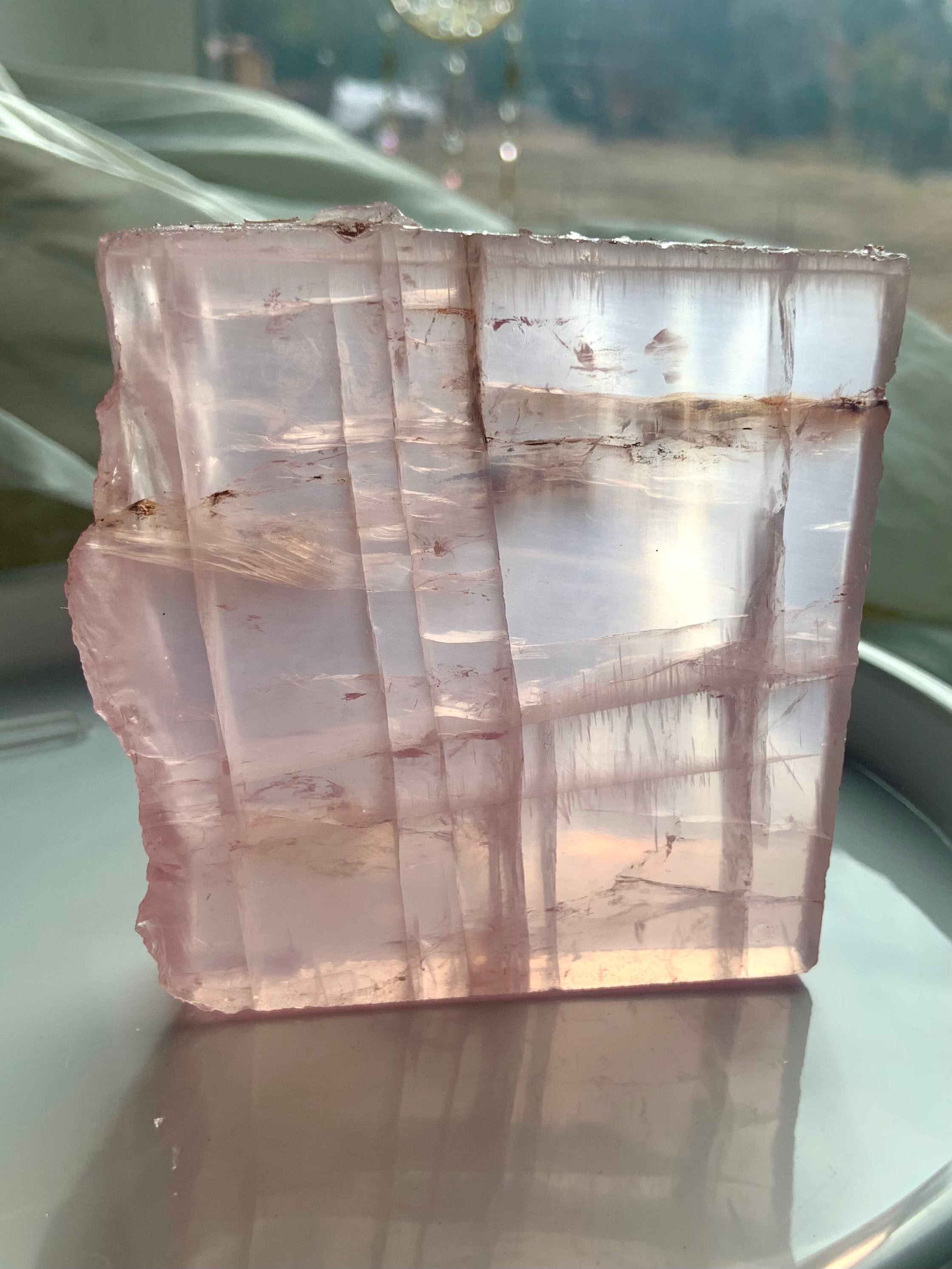 natural bright morning light. You will receive this exact slab of rose quartz that you see in these pictures. Self-stands on two of the edges. There is some hematite inclusion with a little fire quartz/golden healer.