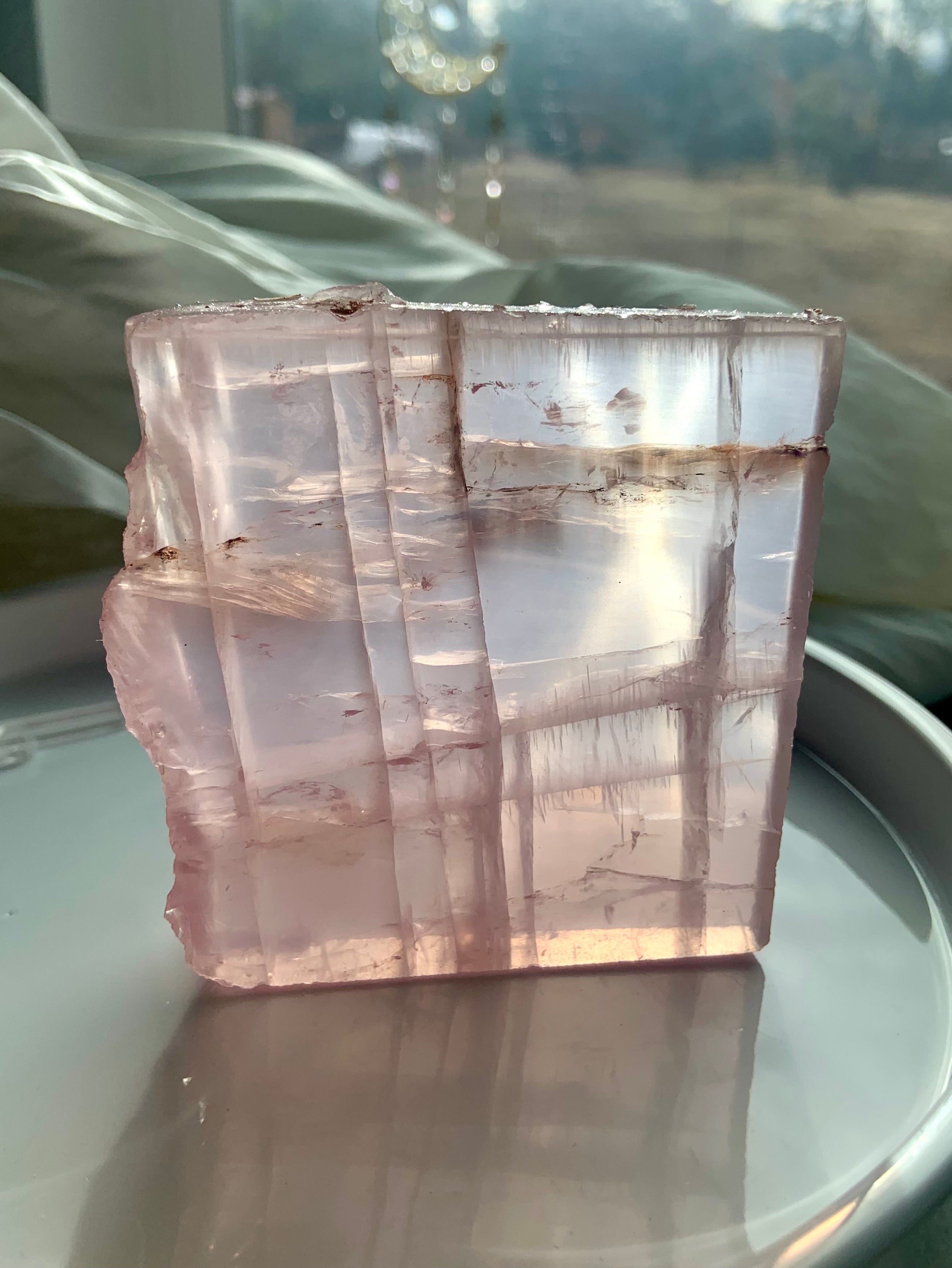 You can display this pink crystal slab upright, self standing on two of the sides to allow the light to shine through the stone. Or use it as a high vibrational charging plate for your special jewelry and crystals. This polished Rose Quartz is a nice size to hold as a meditation crystal and will surely be a cherished piece in your