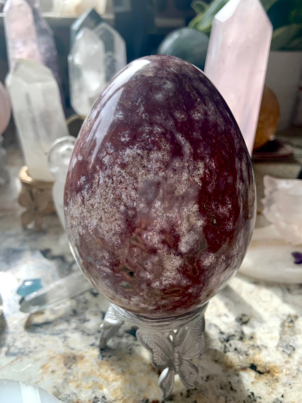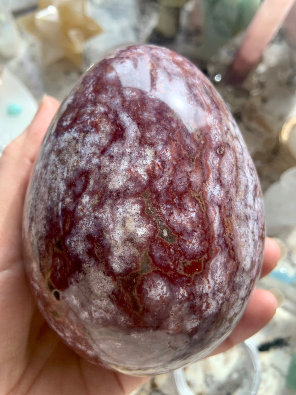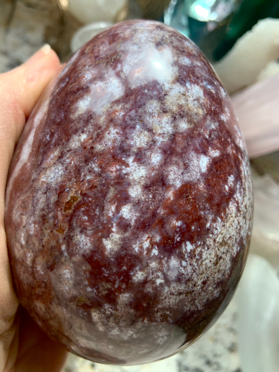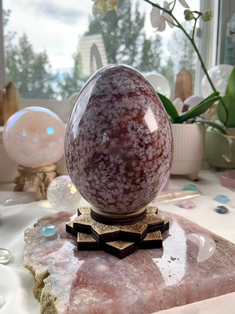 An elegant statement piece, this large Ocean Jasper Crystal Egg is swirling with tiny bubbly orbs in pink, burgundy, rusty red, magenta + raspberry colored stone. Polished smooth + glossy this crystal egg is beautiful from all sides.