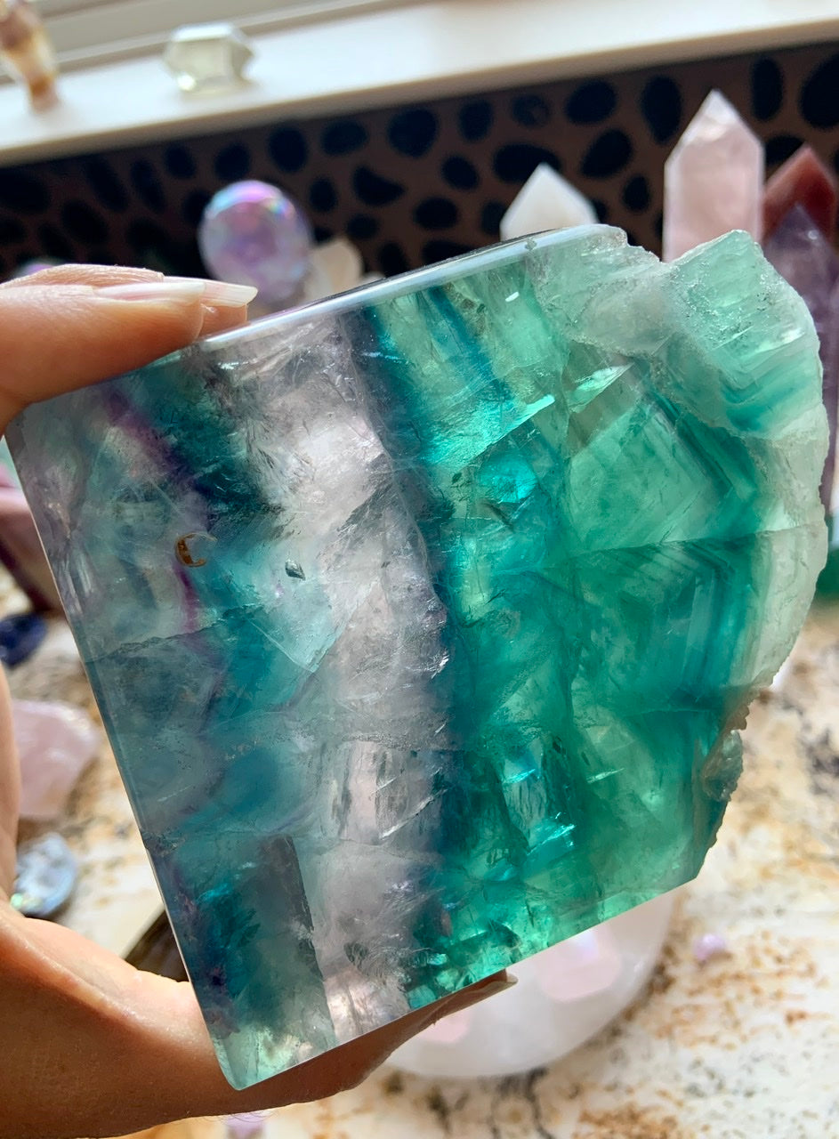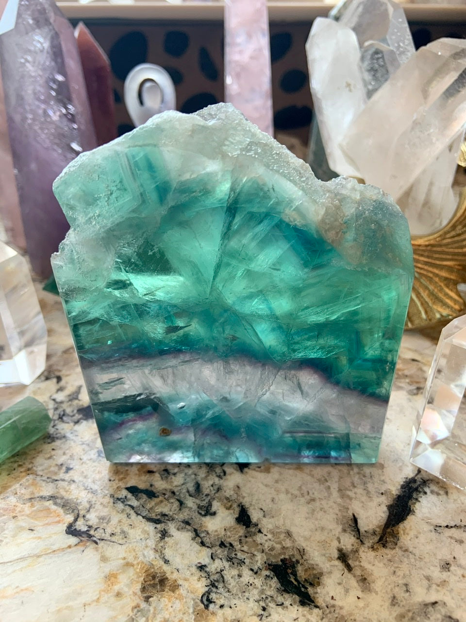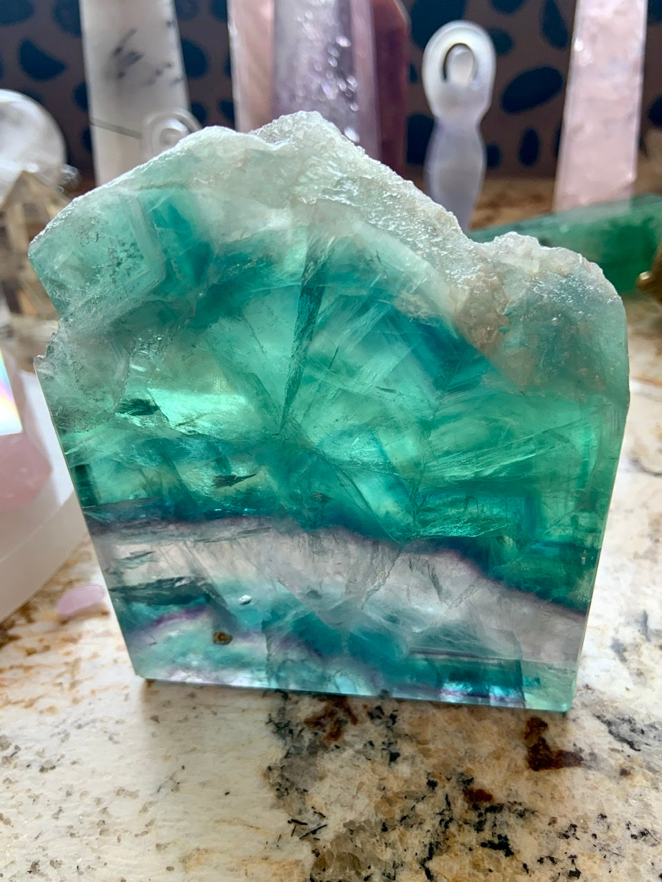 Fluorite has a grounding + harmonizing spiritual energy. Feel the grounding energy come through the bubbly raw natural stone edge + the glossy polished sides.