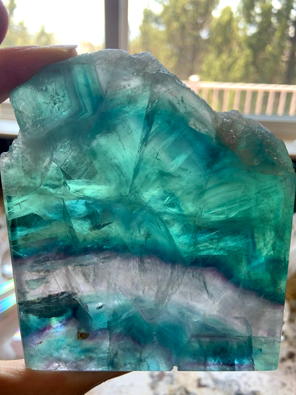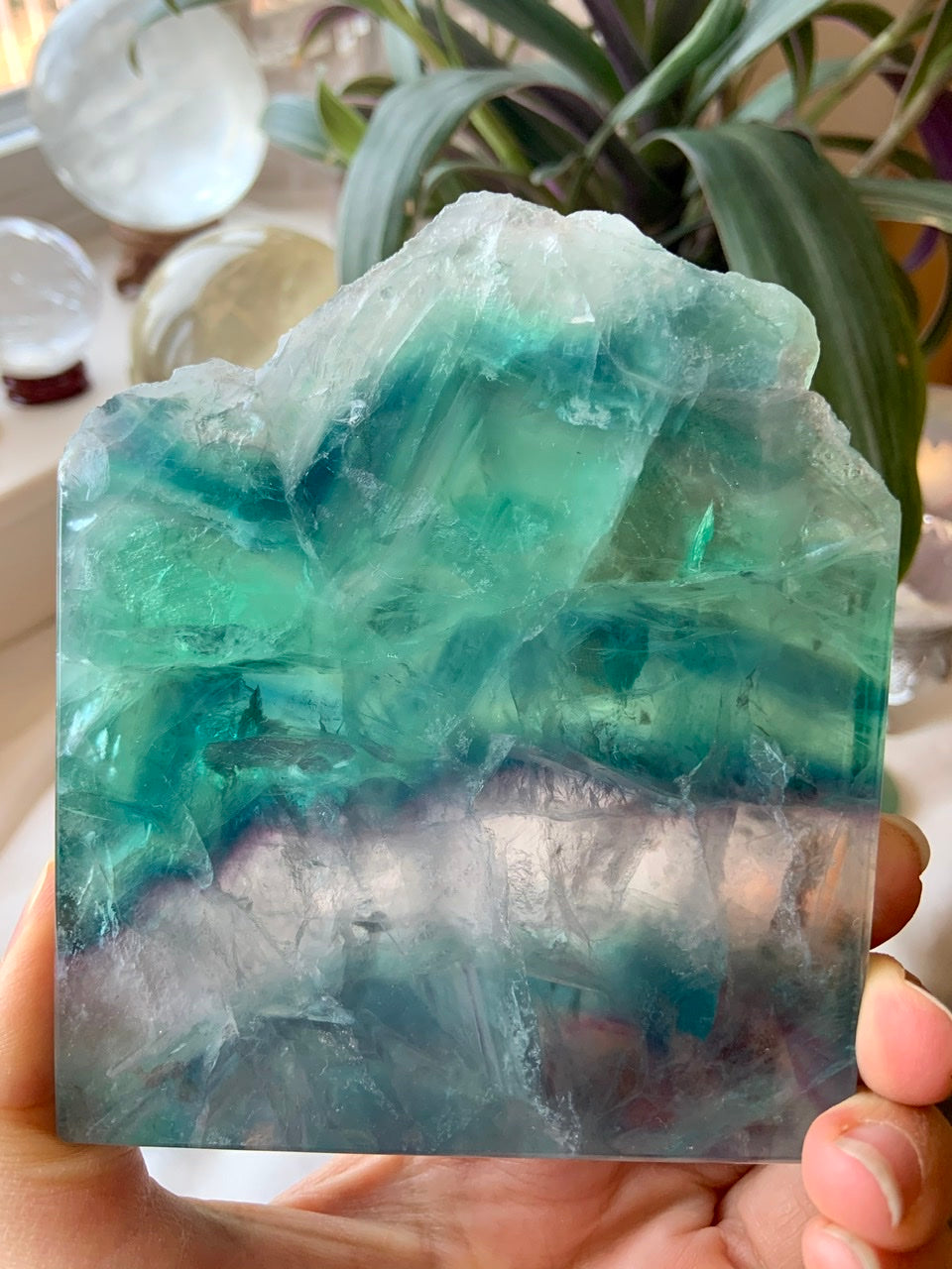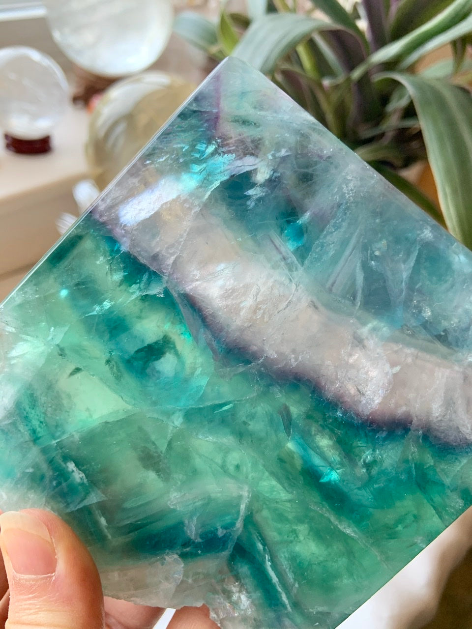 The lovely Lemurian colors of teal, blue, green + violet purple grace this remarkably transparent fluorite slab + giving it a calming, soothing oceanic vibe. This one has distinct bands of color + a few rainbows throughout the interior dimensions. It's stunning presence will make a gorgeous addition to your sacred space.