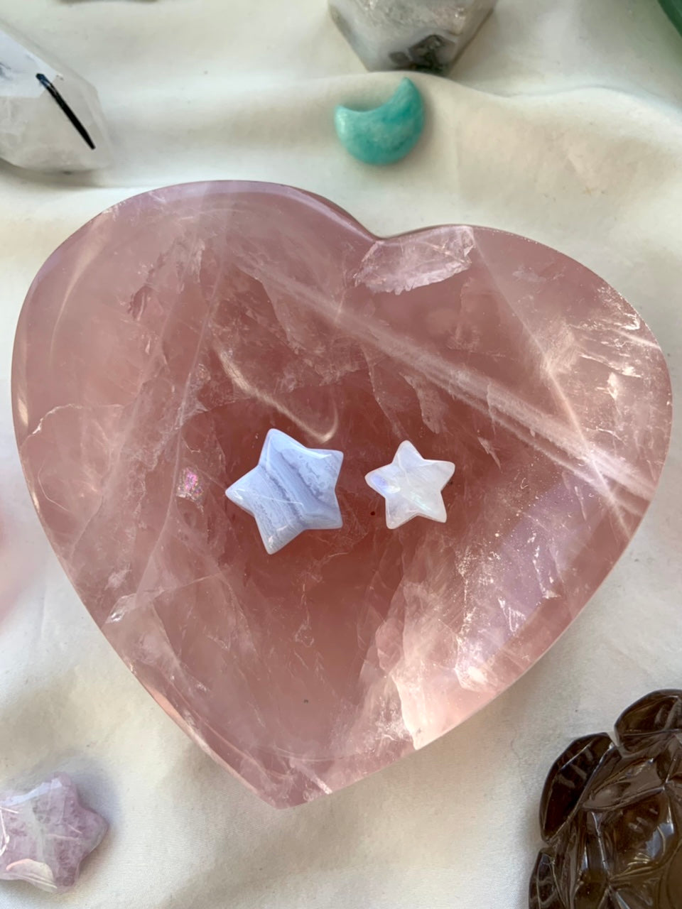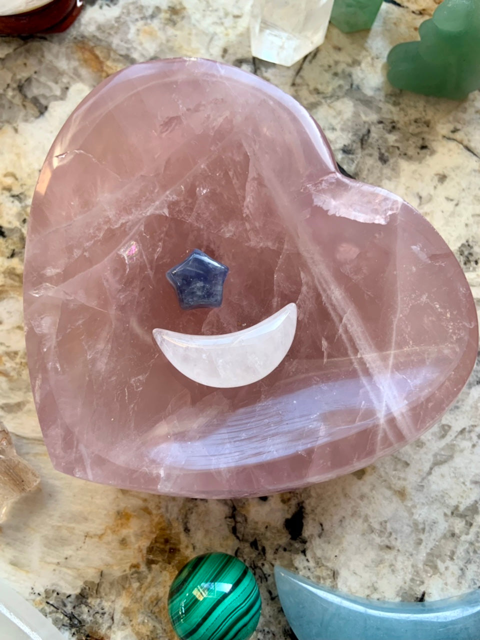 This sweet hand carved Lavender Rose Quartz Heart Bowl is perfect for using in sacred ceremony + for holding your special things, jewelry + crystals.