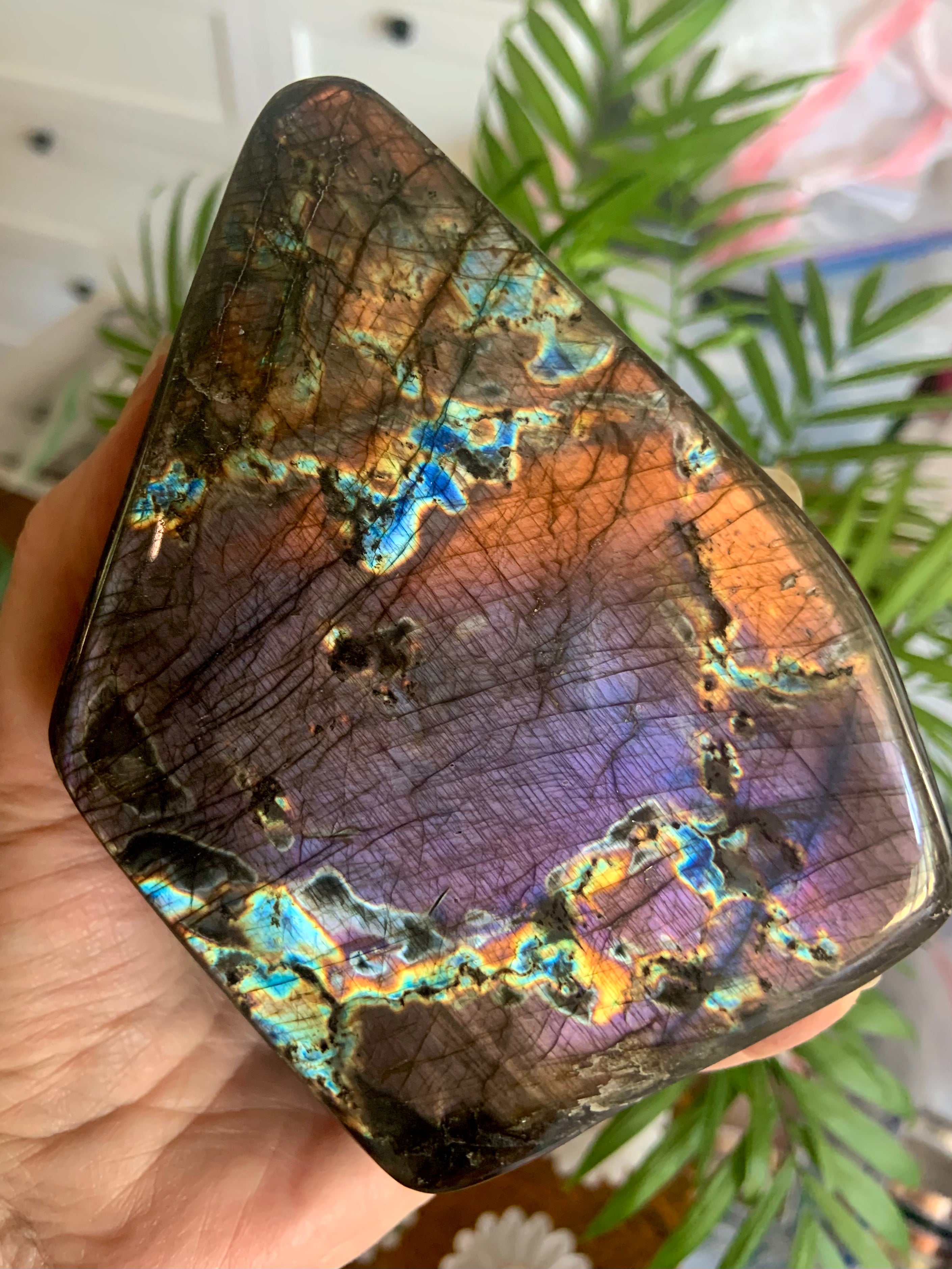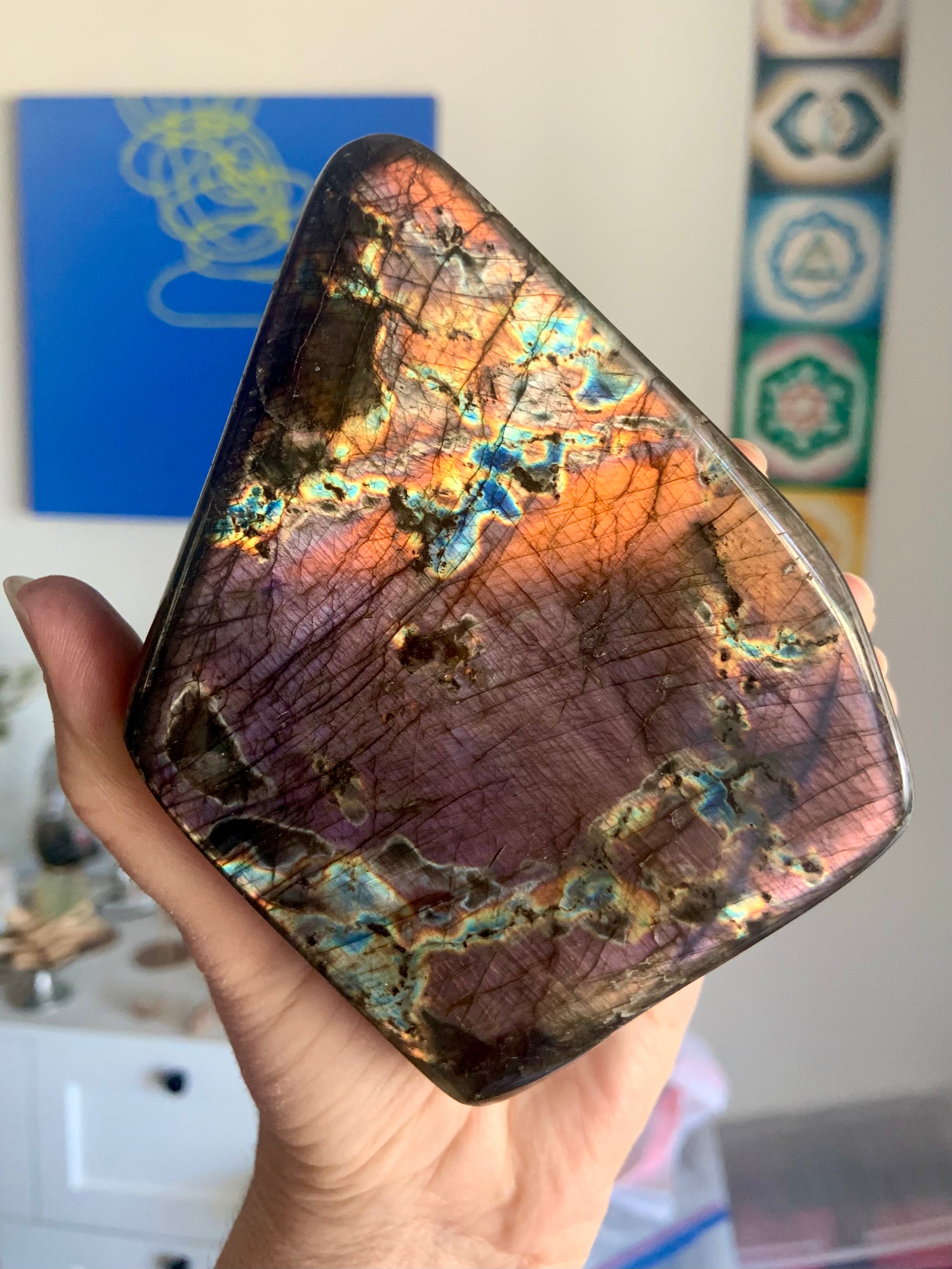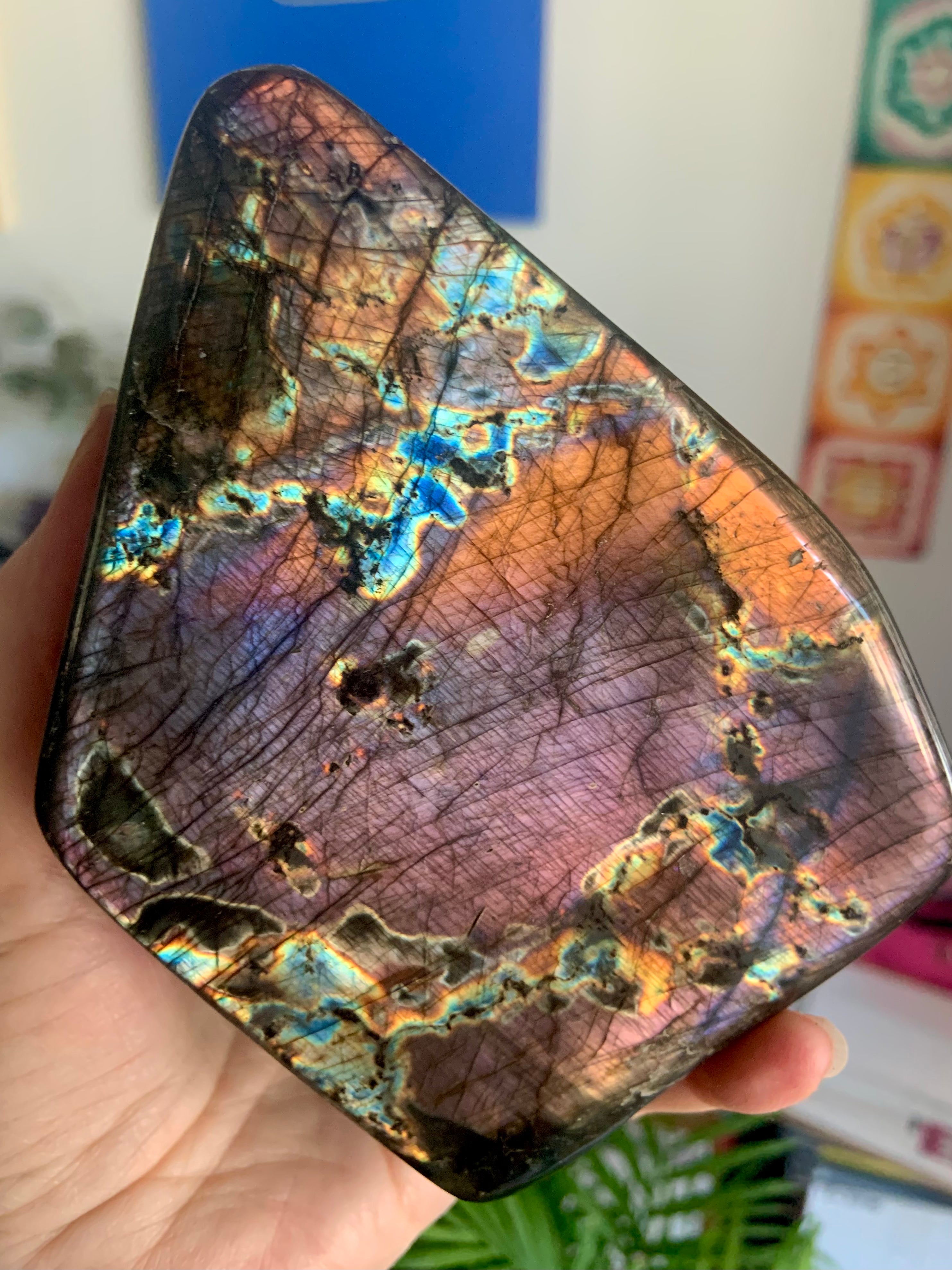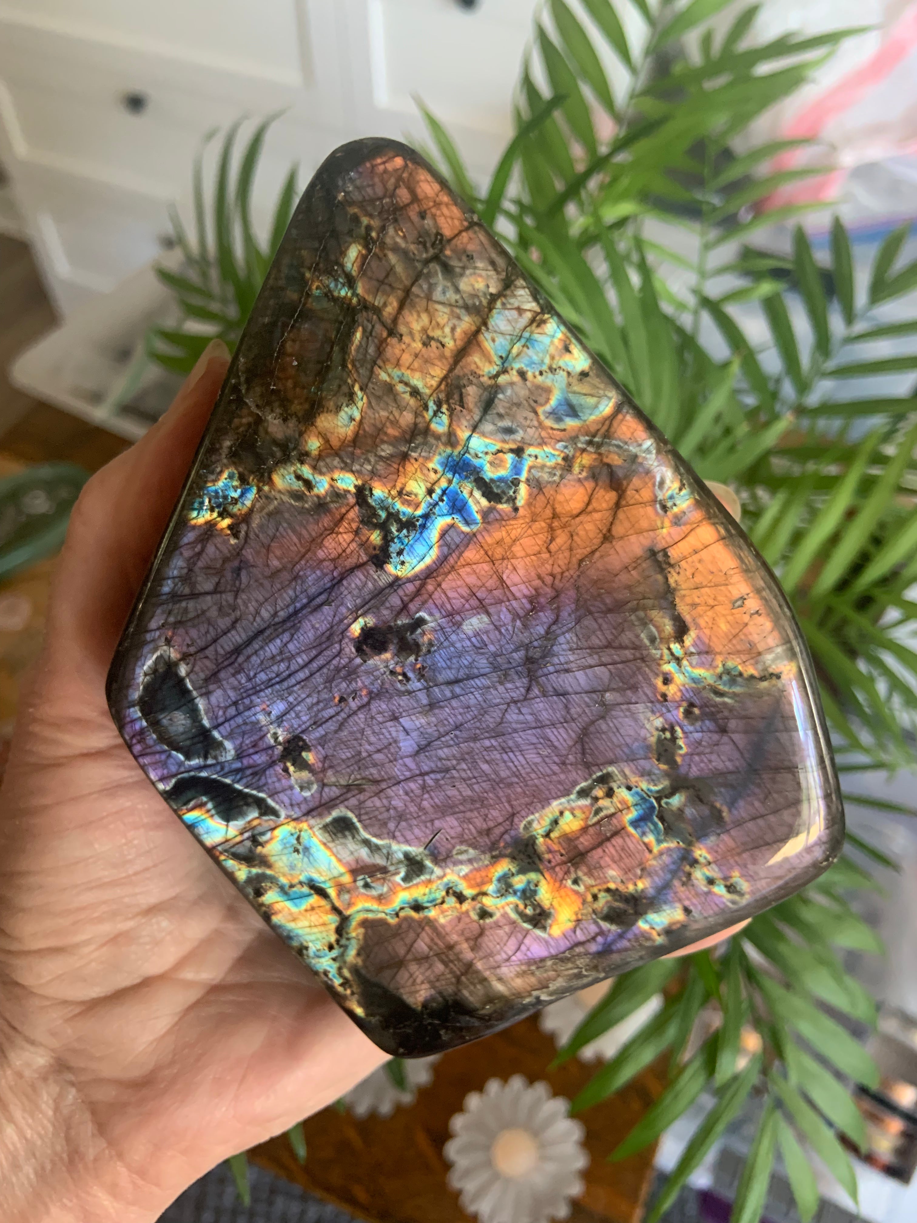 This stunning, shimmering Rainbow Labradorite Freeform has a spectrum of brilliant colors, flashing purple, pink, orange, blue + yellow with silver + gold flash from different angles. These coveted rainbow colors make this special Labradorite a rare collector's piece.