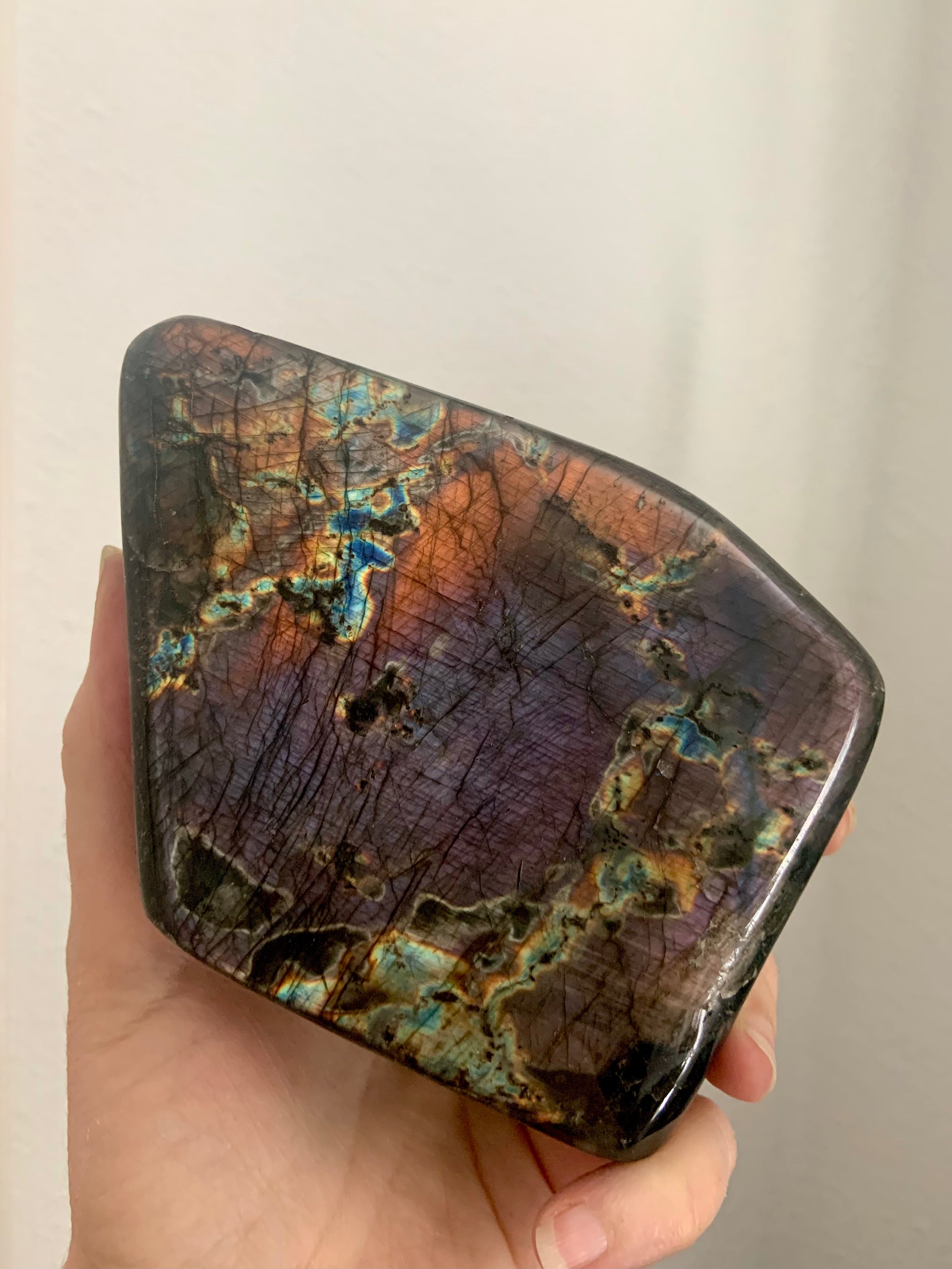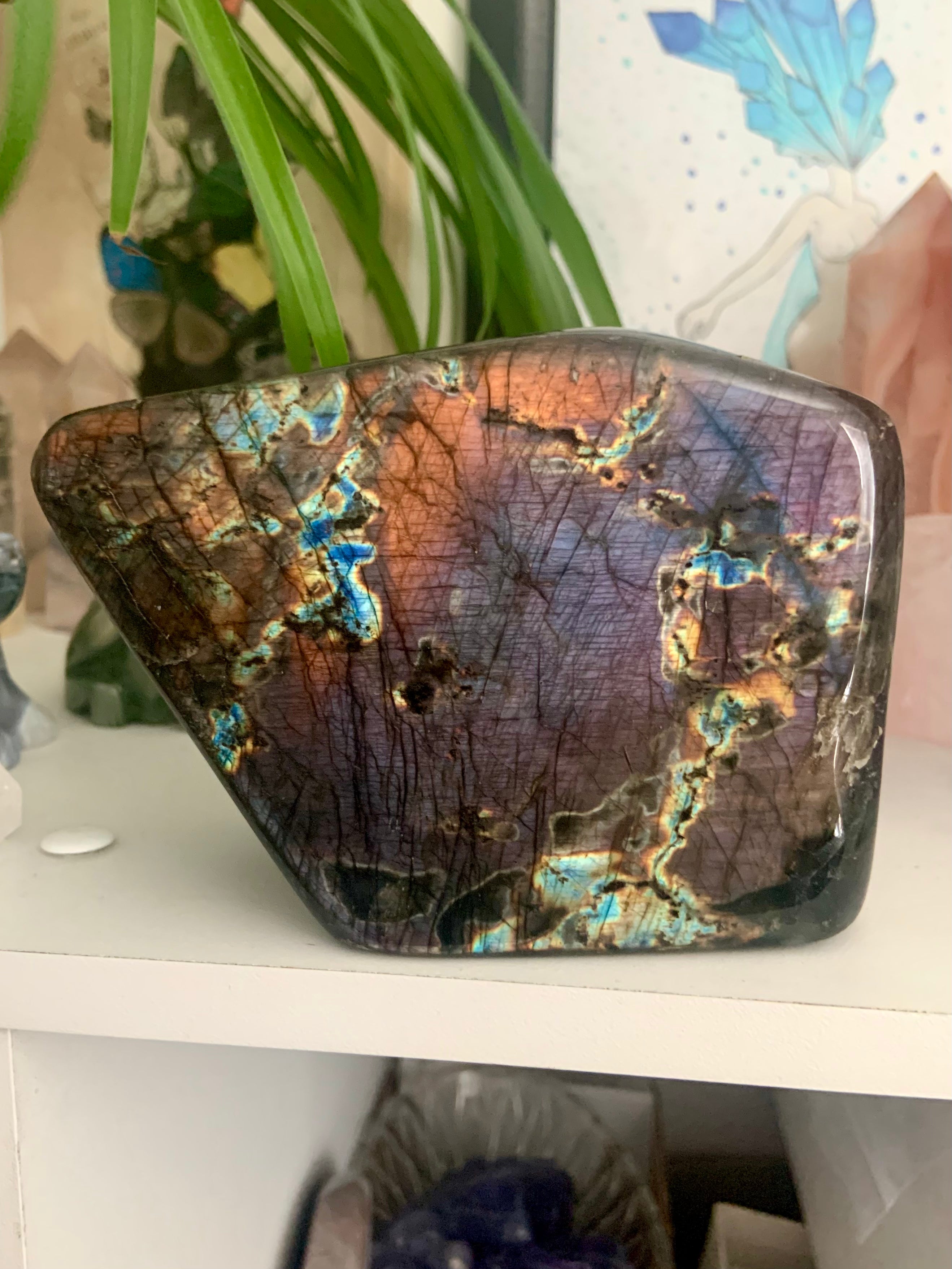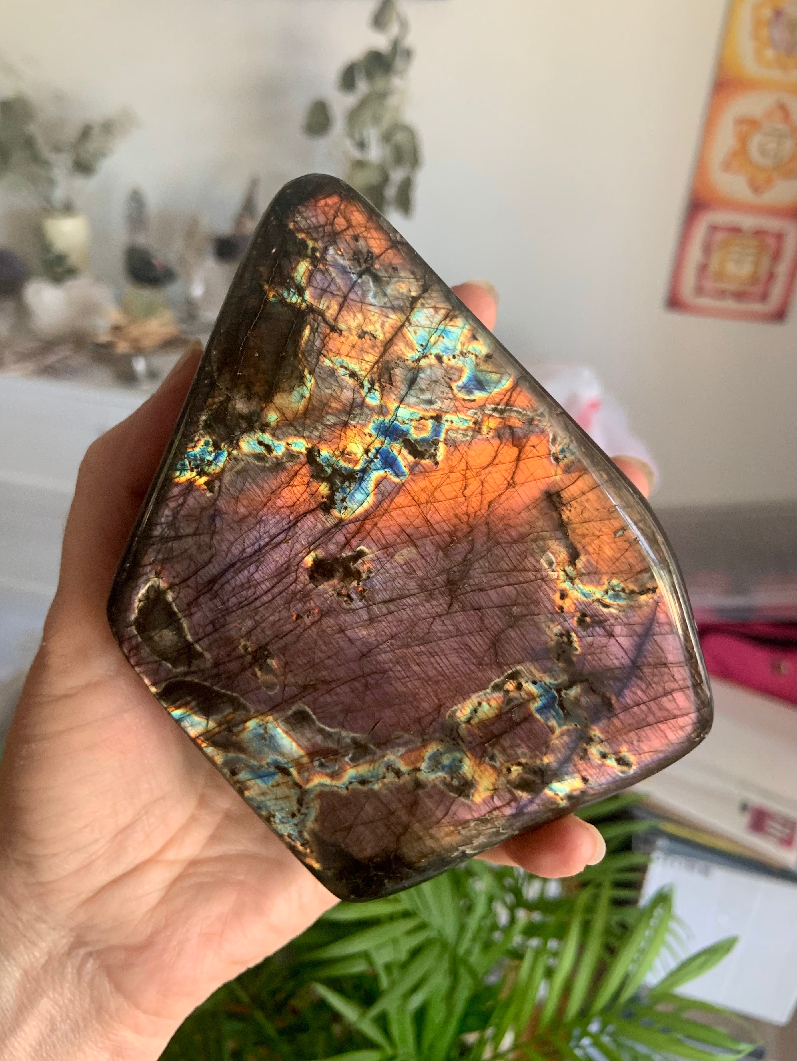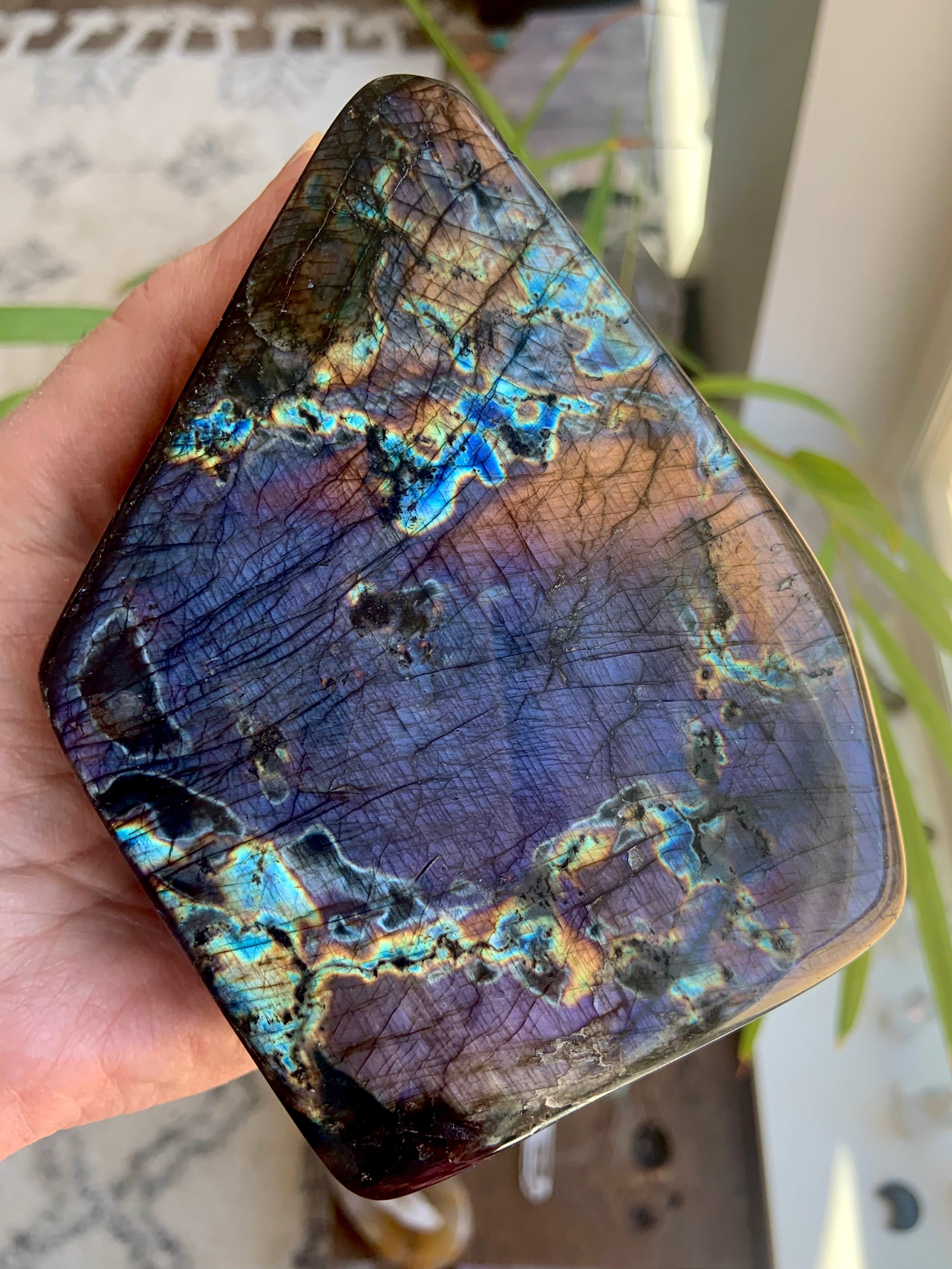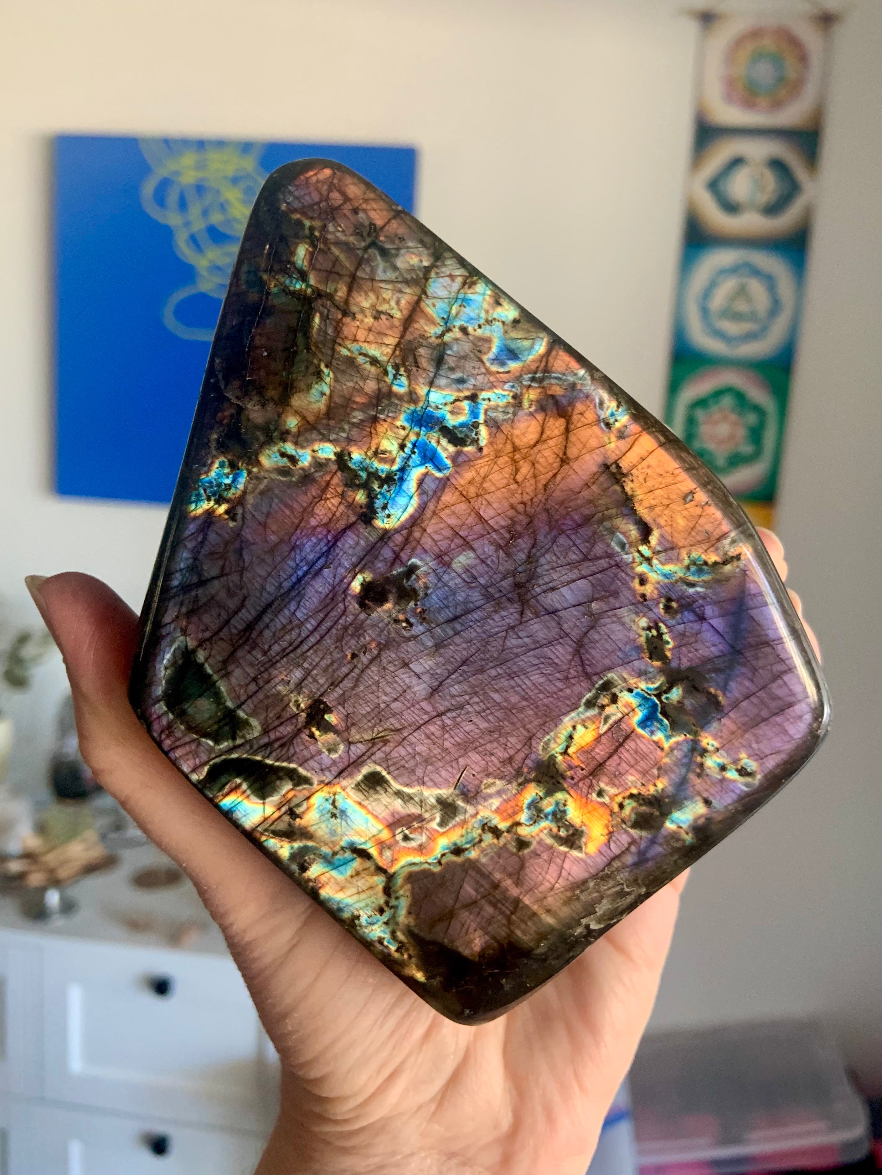 This stunning, shimmering Rainbow Labradorite Freeform has a spectrum of brilliant colors, flashing purple, pink, orange, blue + yellow with silver + gold flash from different angles. These coveted rainbow colors make this special Labradorite a rare collector's piece.