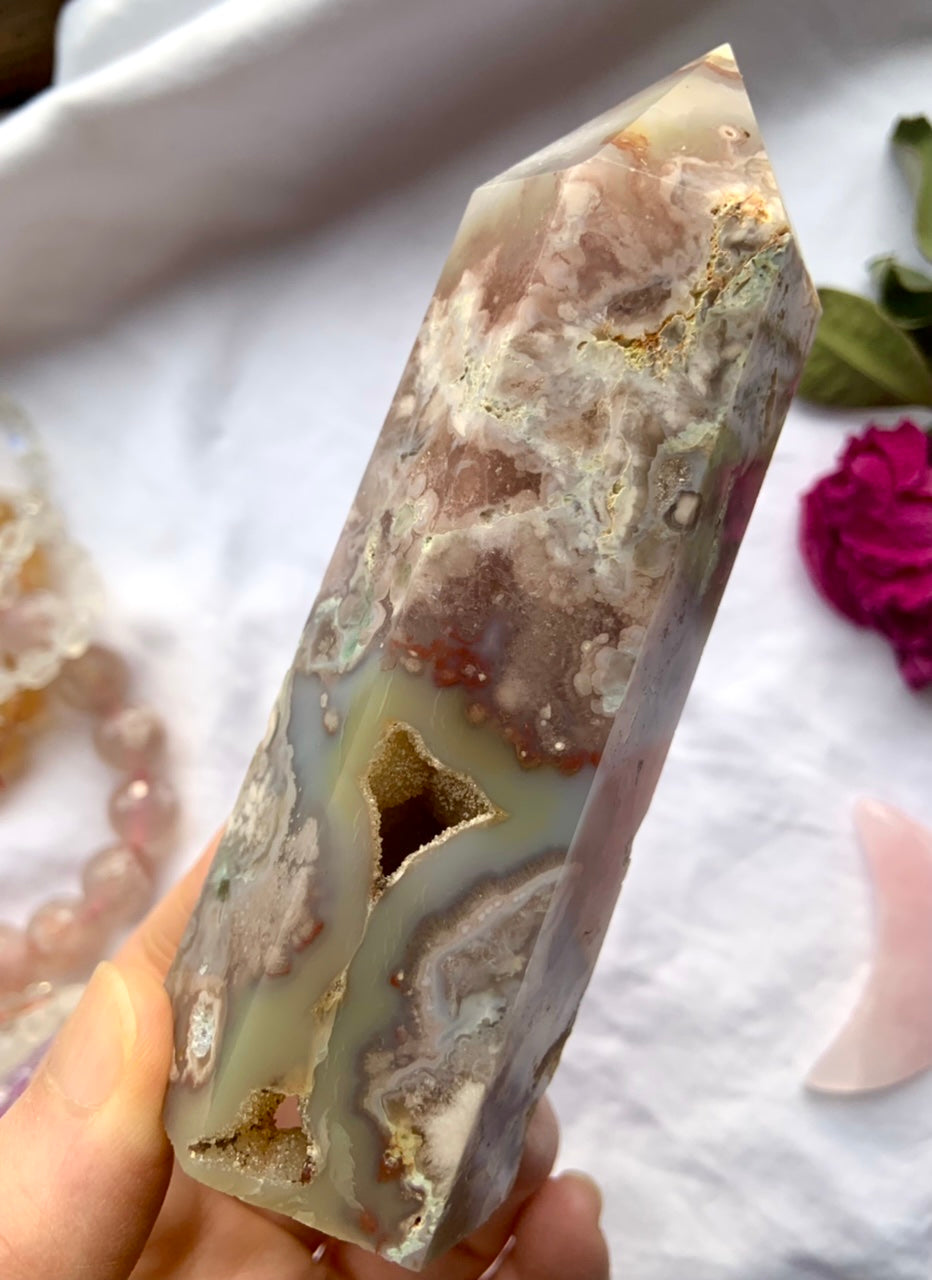 Flower Agate has a peaceful, beautiful feminine energy which can be seen + felt within the cascading blossoms + dreamy chalcedony swirls. Flower Agate embodies the Sacred Feminine + helps one to integrate the Maiden, Mother + Elder aspects of ourselves with grace, balance + harmony. There is joy in purpose + wisdom in creation.