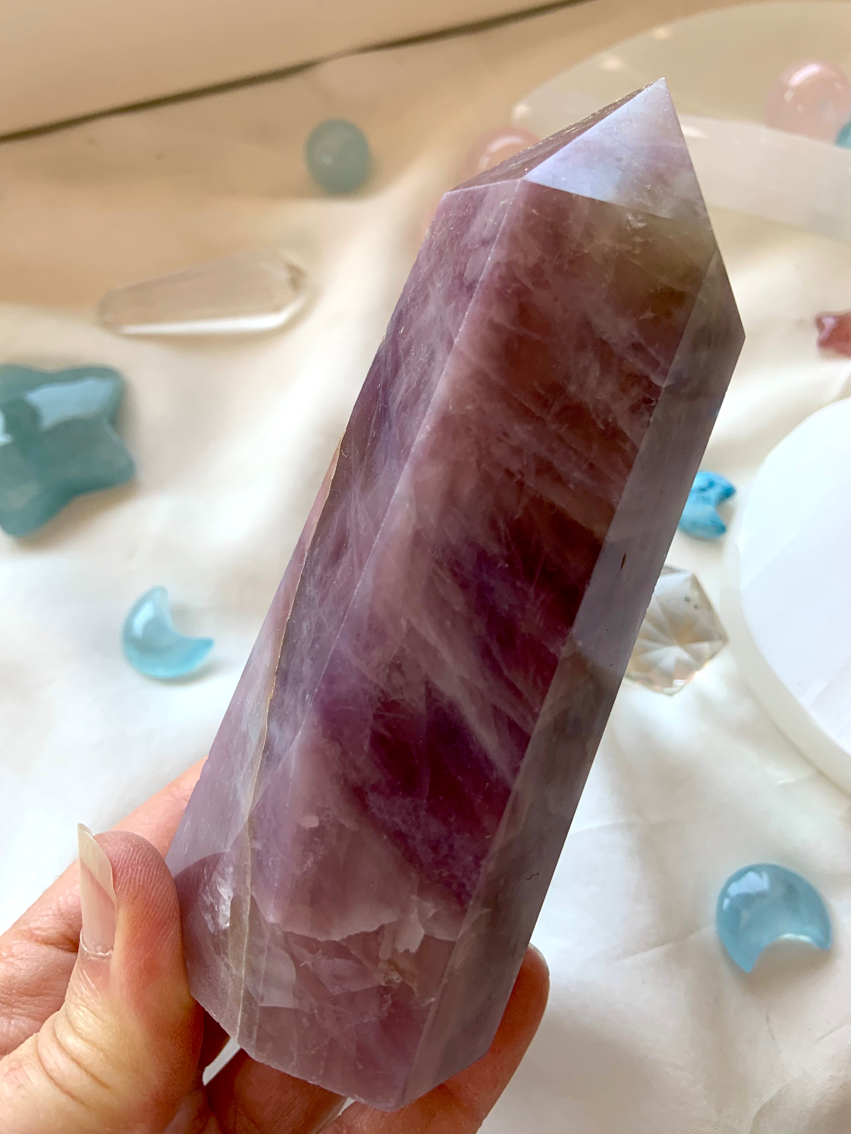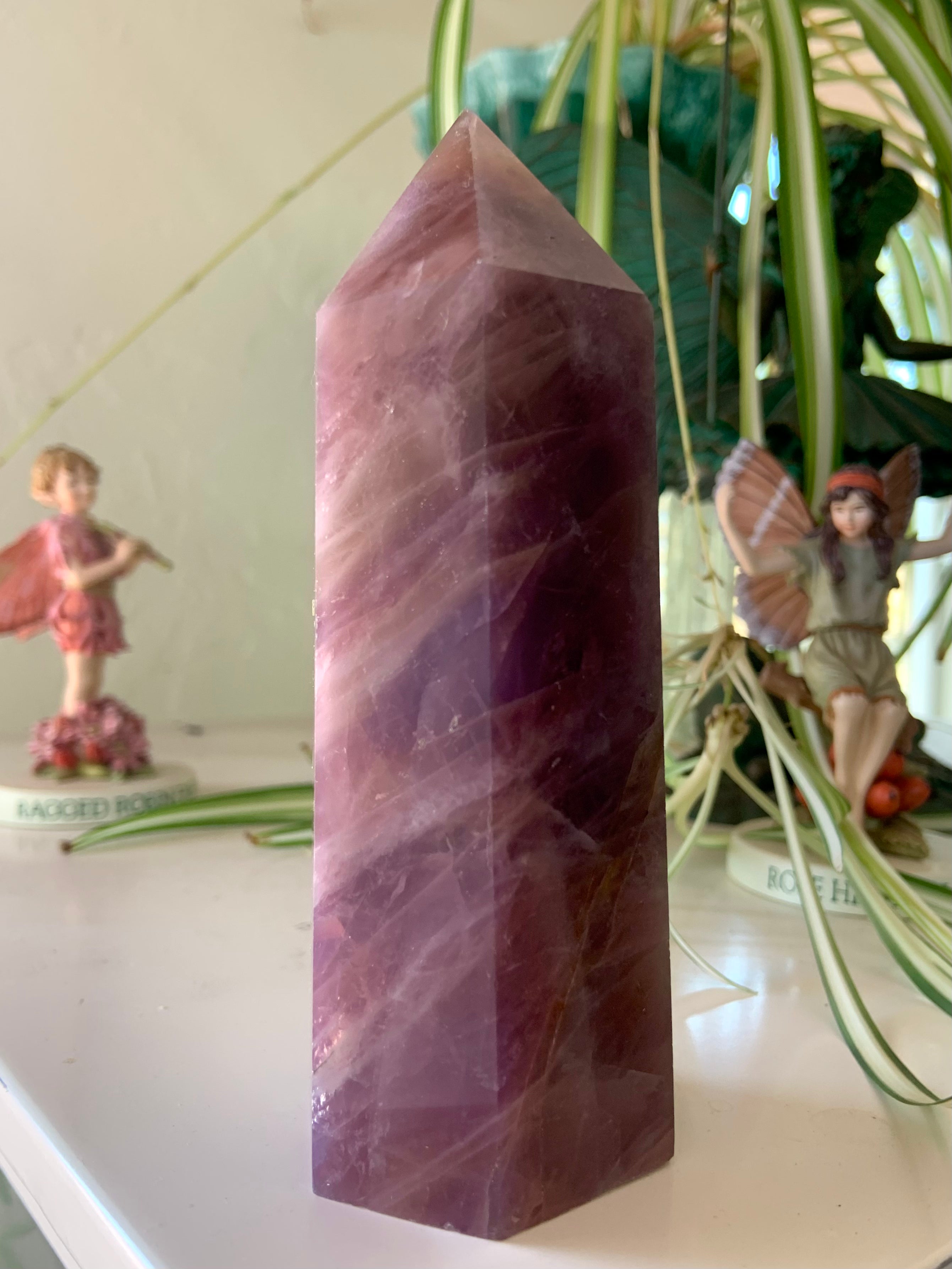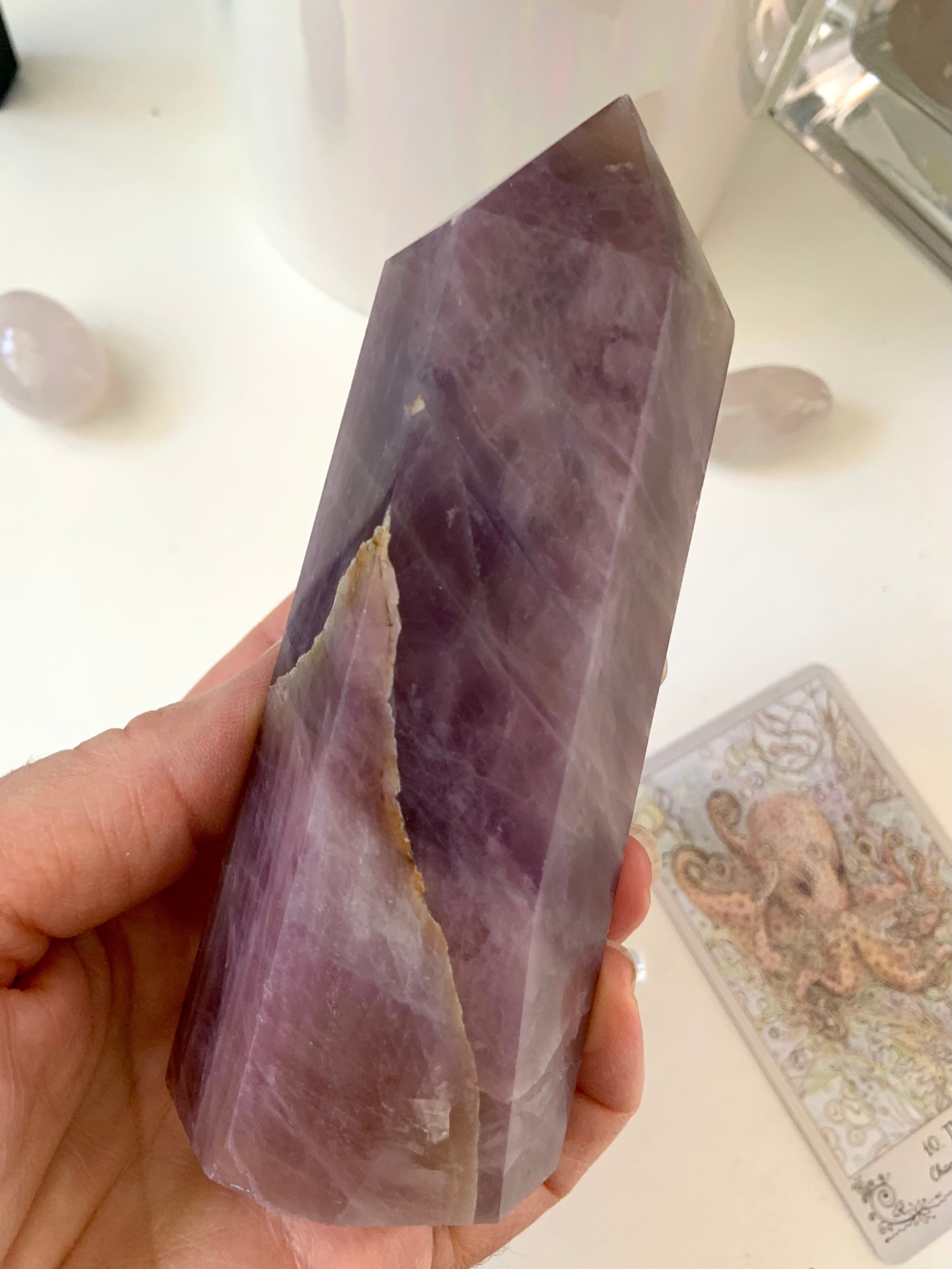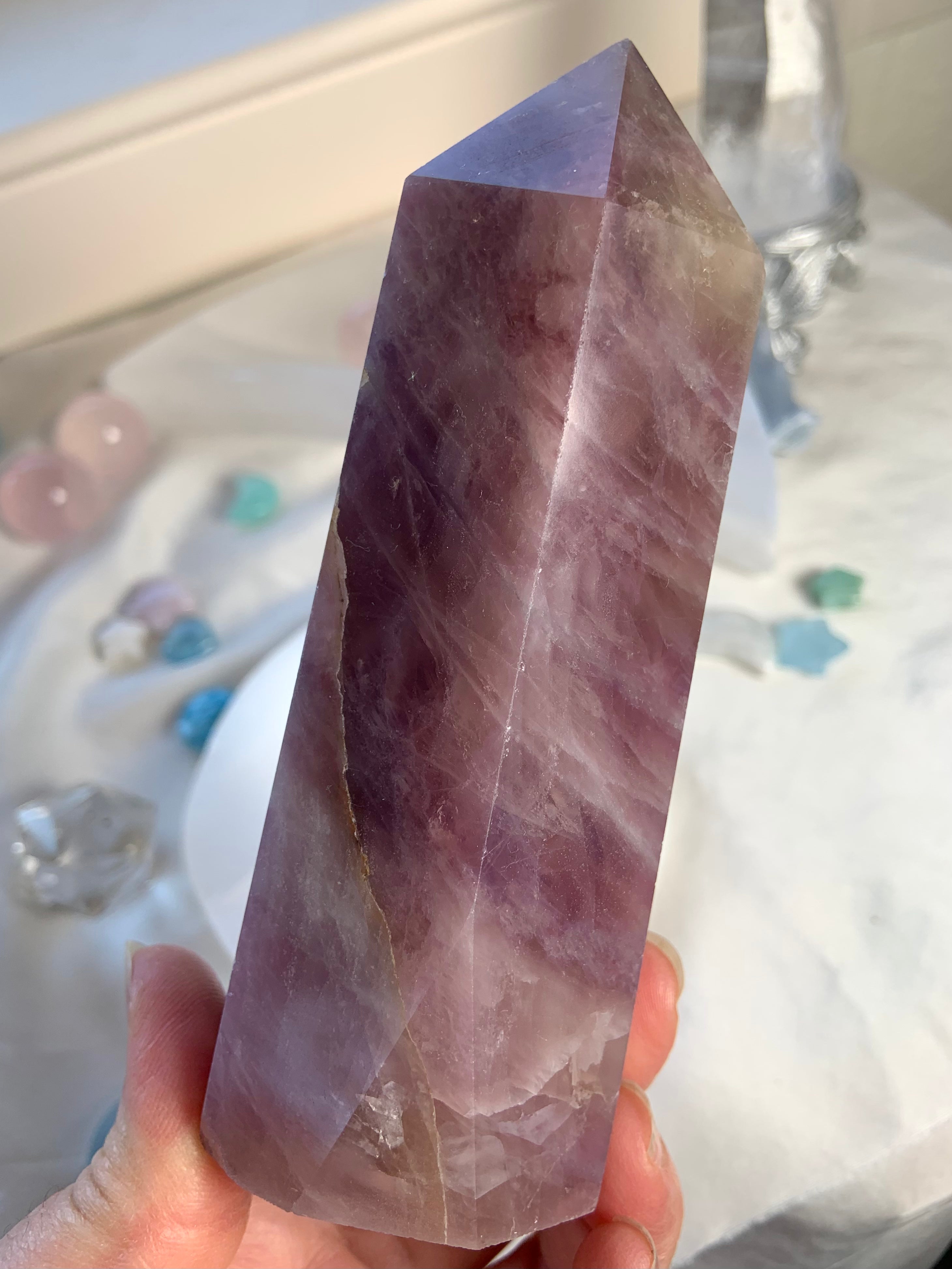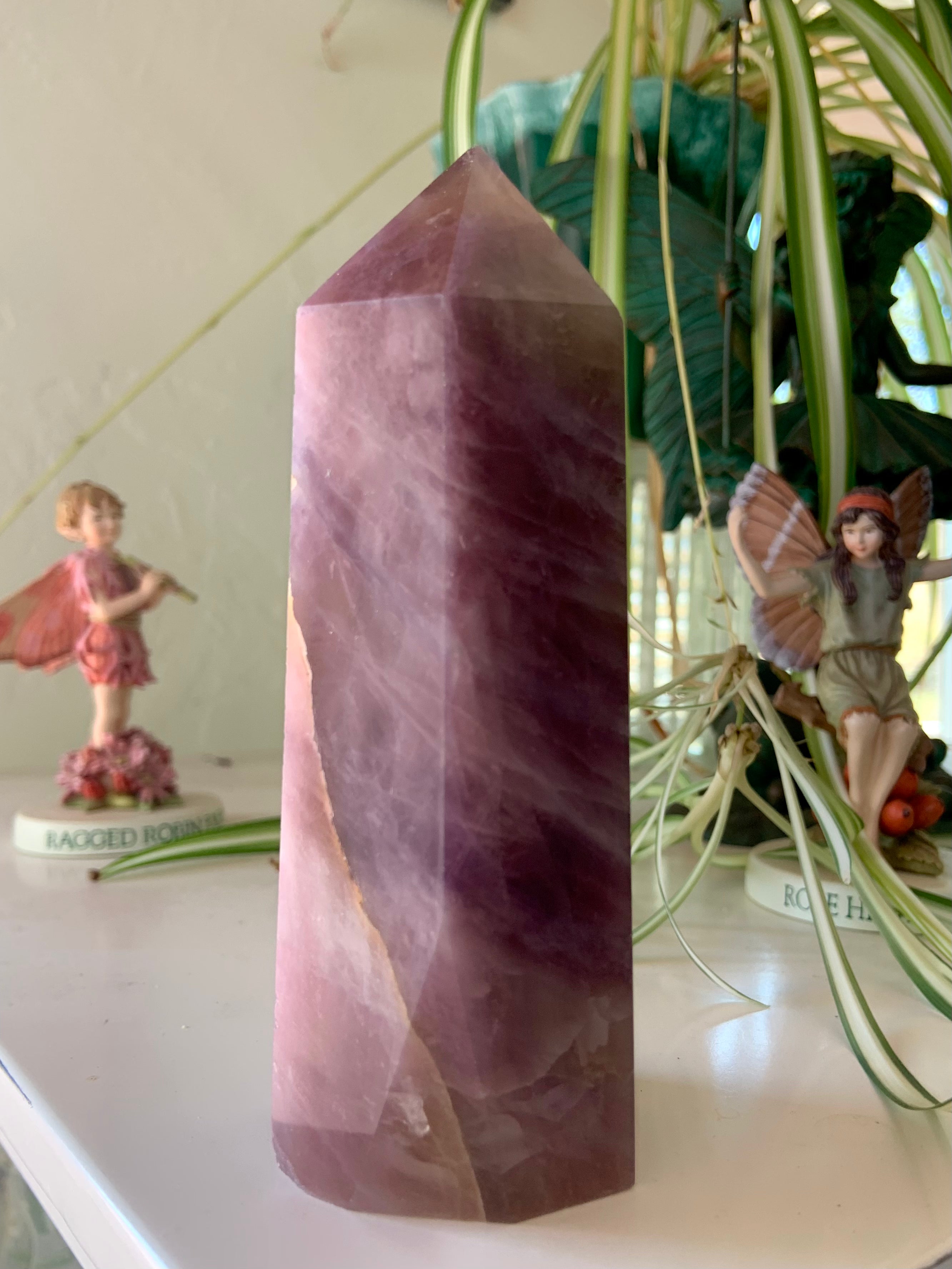 This rare deep Purple Rose Quartz Tower will make a stunning addition to your crystal collection + bring the energy of the Divine Feminine into your sacred space. The colors in this beautiful crystal range from pinkish lavender to milky grayish lilac to pinkish purple to deep magenta + darker purple with varying levels of milky luminosity + transparency plus a vein of Golden Healer running though the stone.