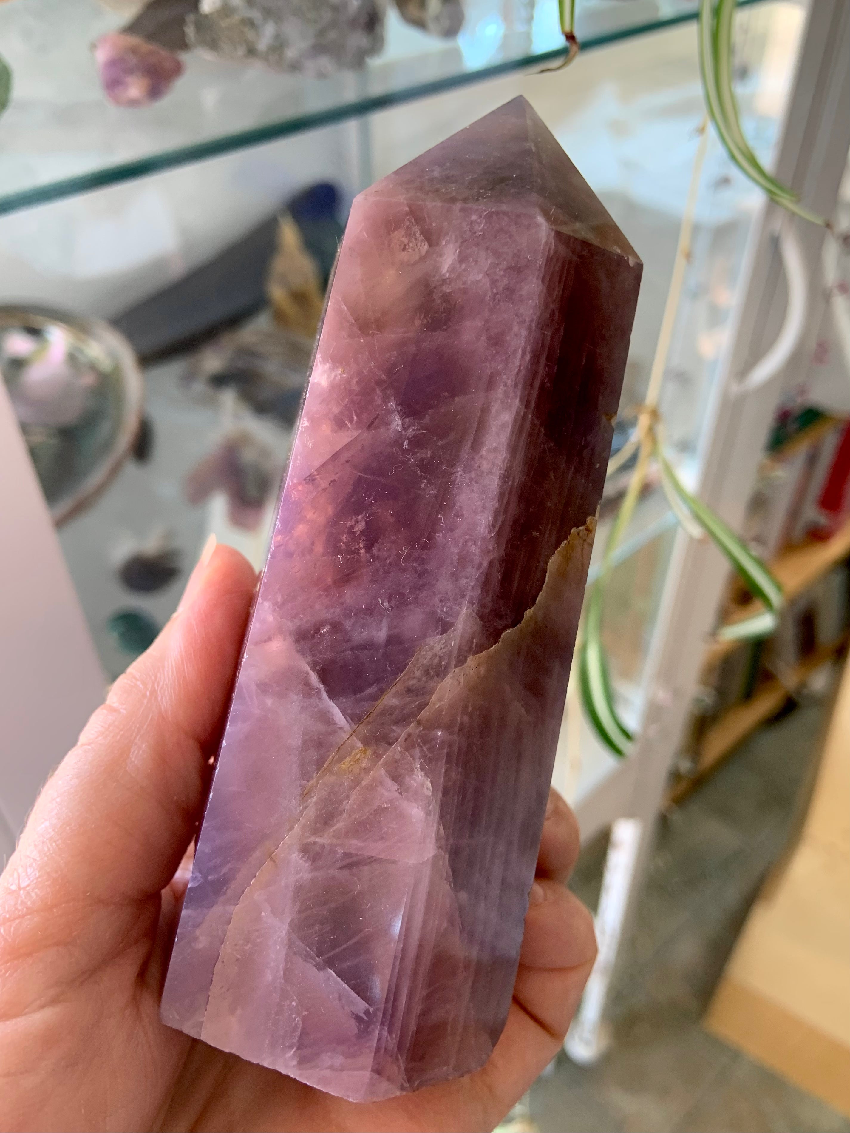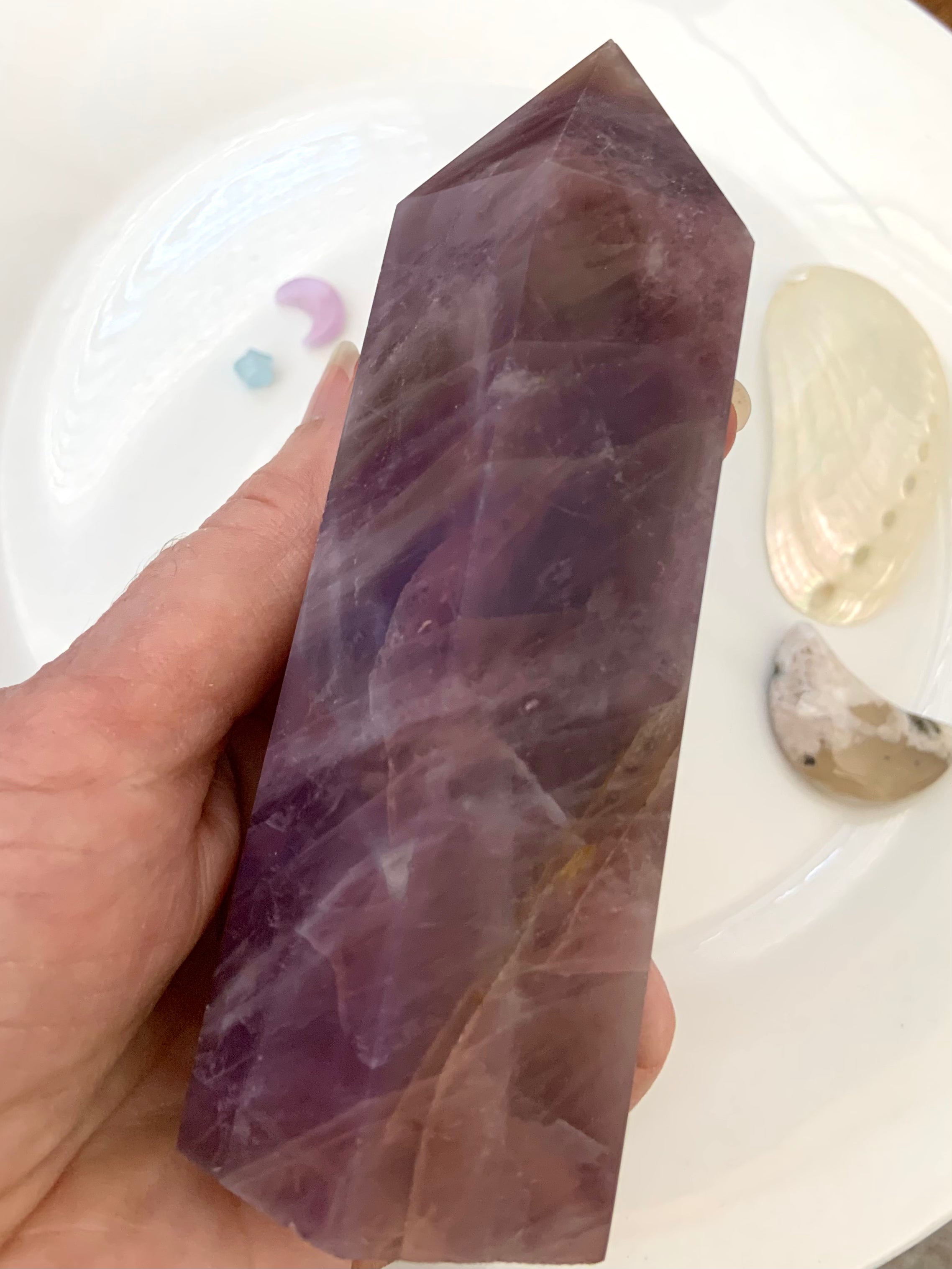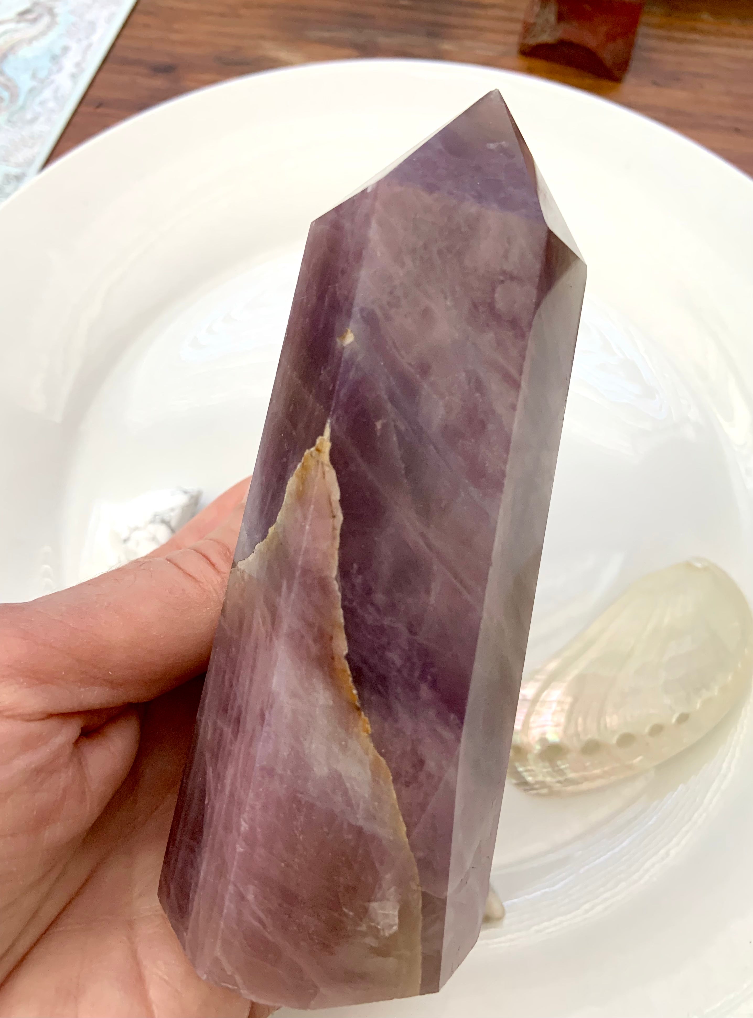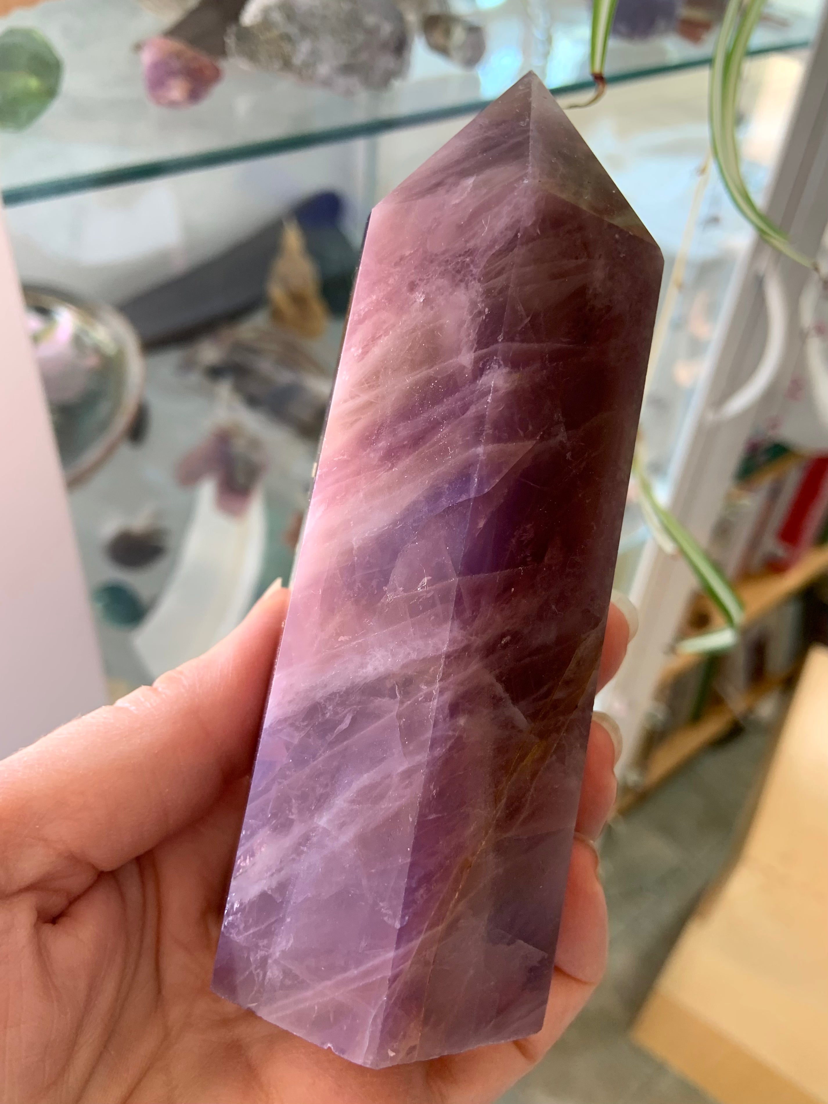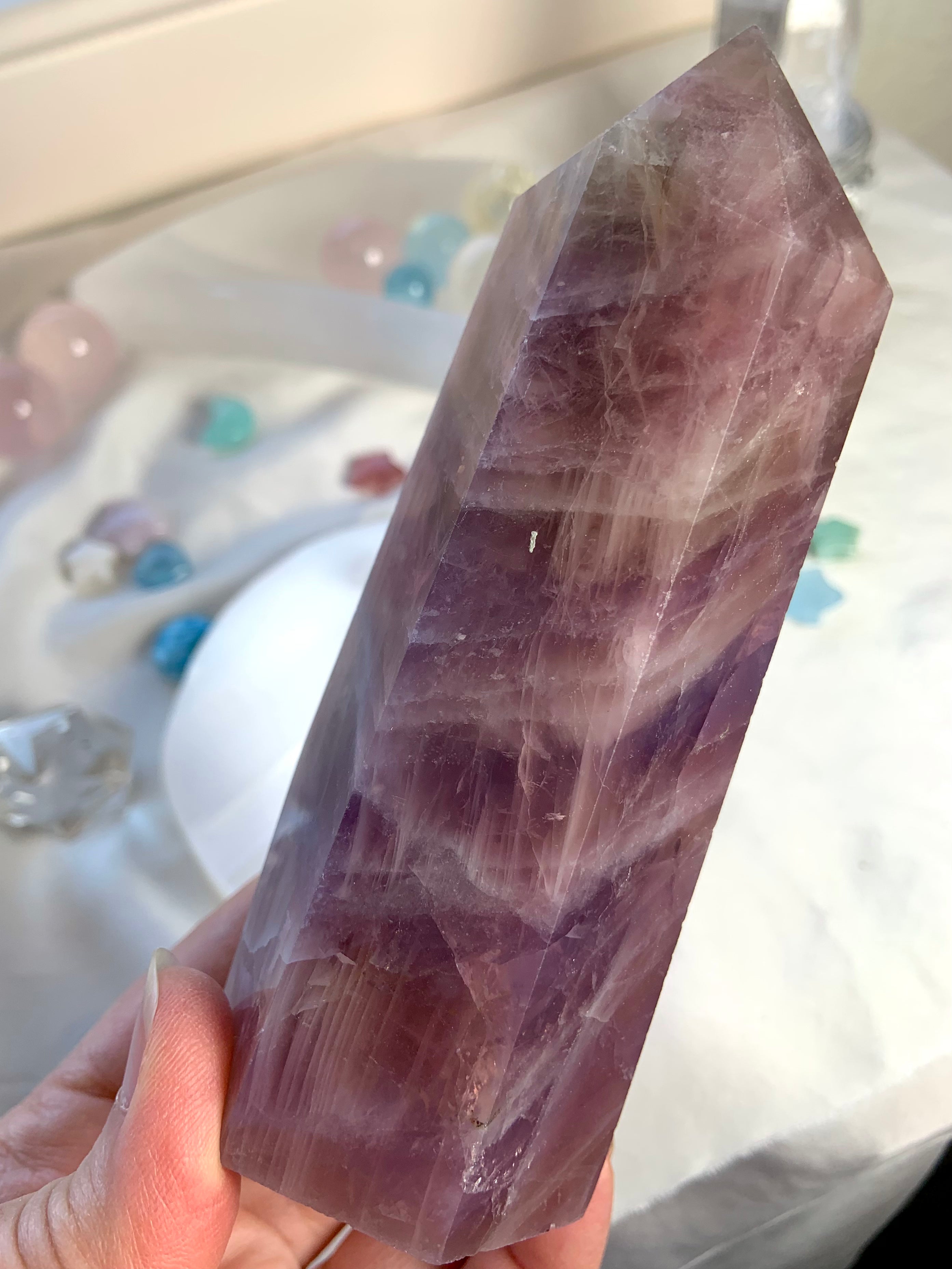 This rare deep Purple Rose Quartz Tower will make a stunning addition to your crystal collection + bring the energy of the Divine Feminine into your sacred space. The colors in this beautiful crystal range from pinkish lavender to milky grayish lilac to pinkish purple to deep magenta + darker purple with varying levels of milky luminosity + transparency plus a vein of Golden Healer running though the stone.