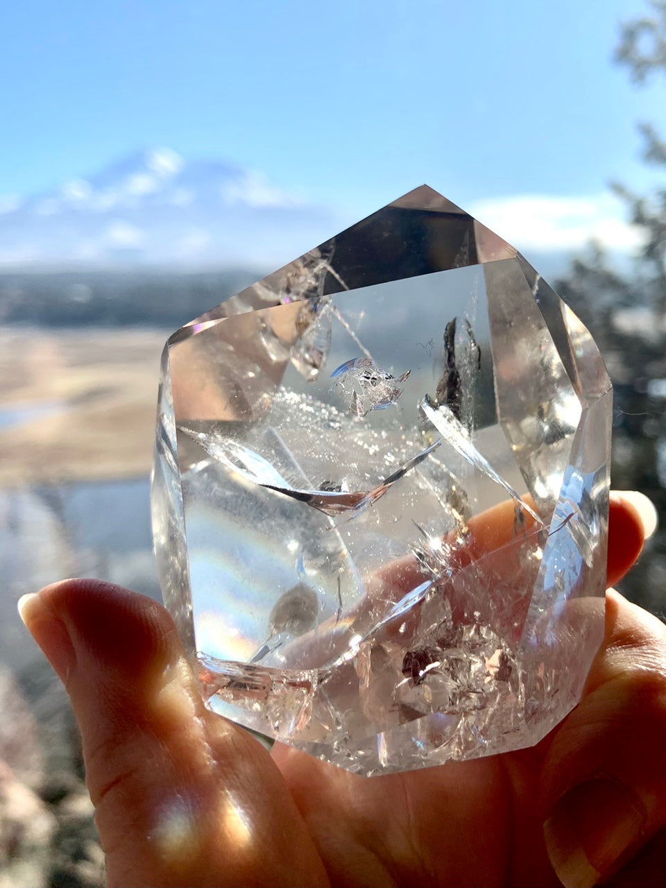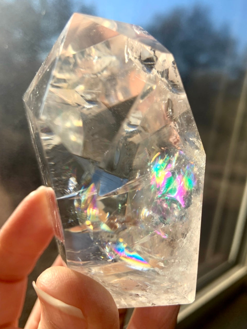 This gorgeous polished quartz crystal freeform has loads of magical rainbows with an Angel inside. This gemmy crystal has some beautiful interior dimensions, including flashy silver crackle + bubbly galaxy patterns that are highlighted by prismatic facets on all sides of the crystal.