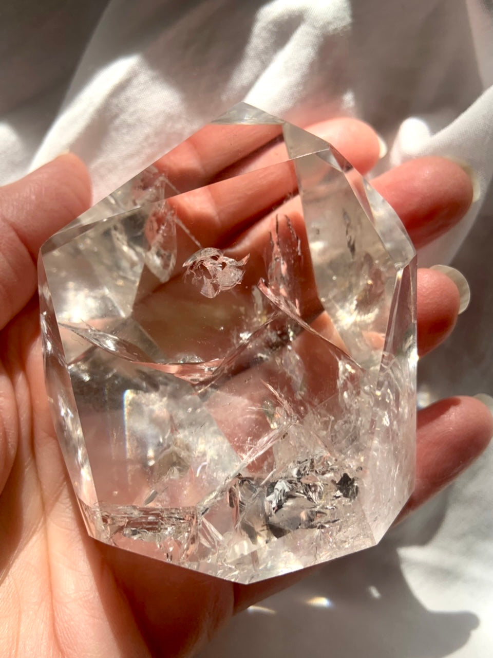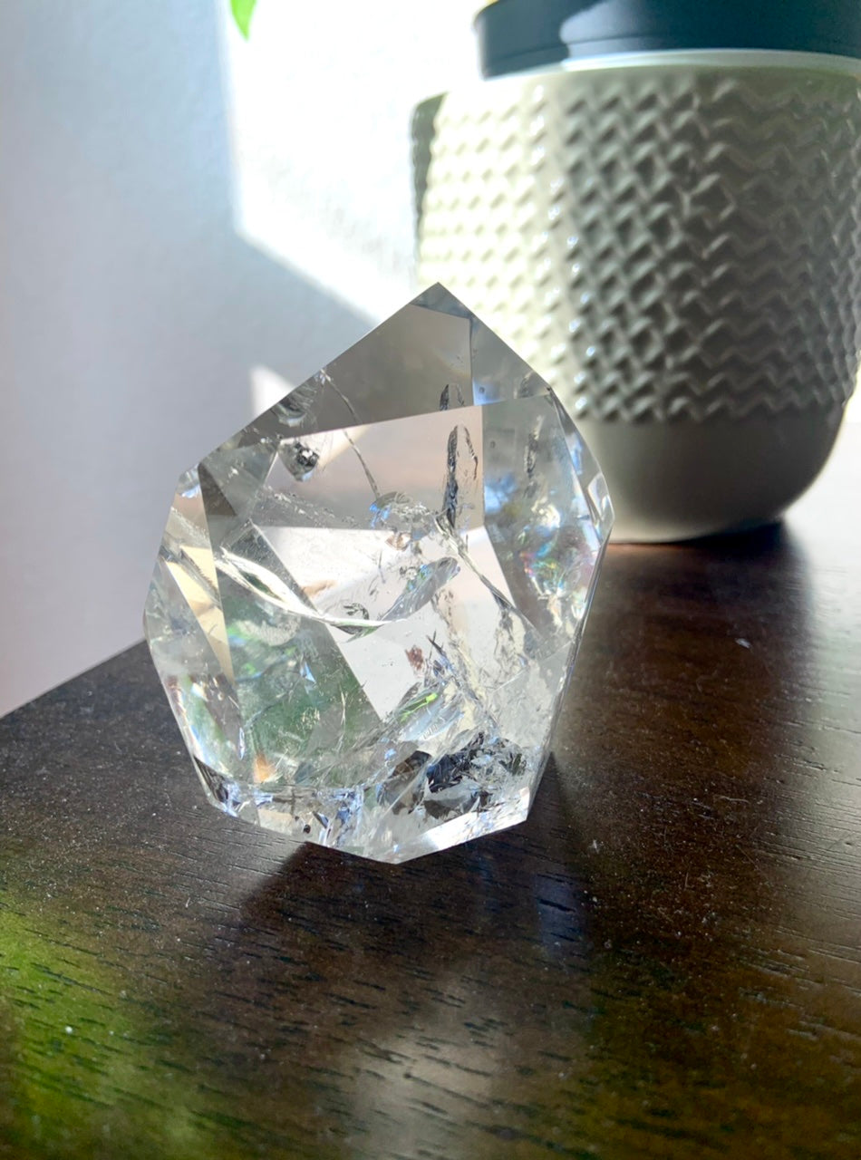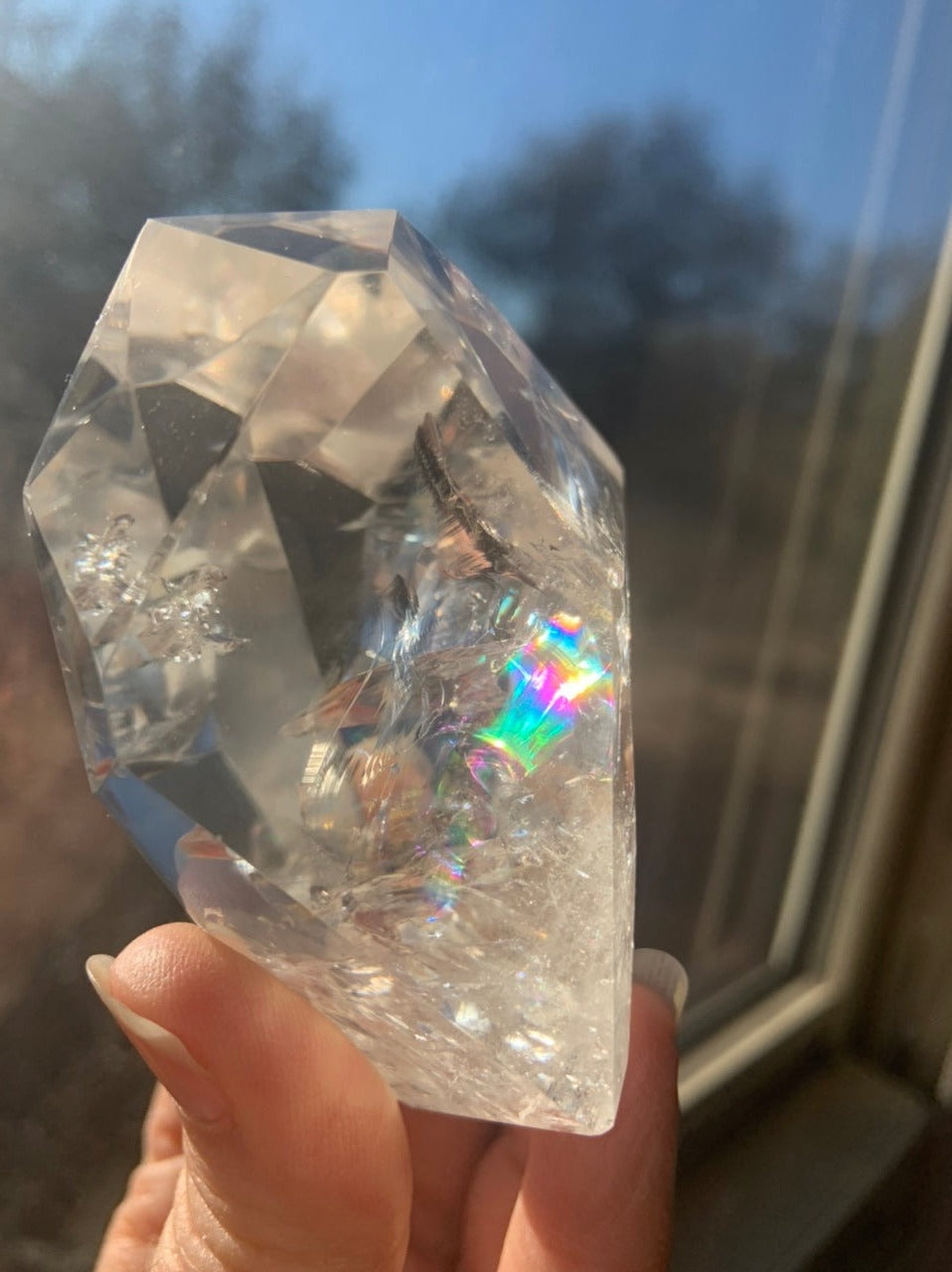 This shockingly clear quartz crystal is cut + polished with irregular faceted angles that capture the light beautifully. This gem looks stunning on all sides + can rest safely on several of the faceted edges to show off the unique freeform gem cut prism.