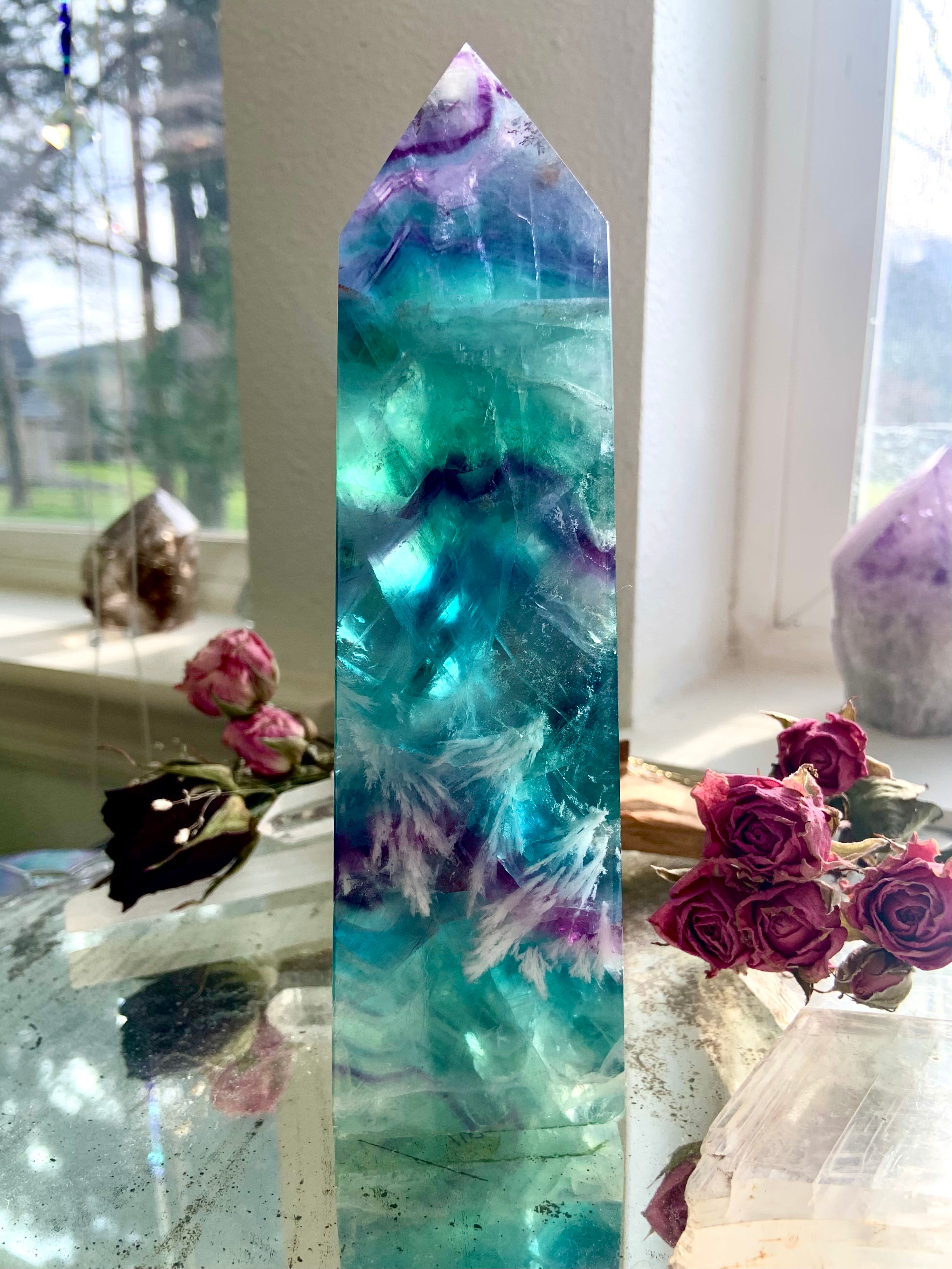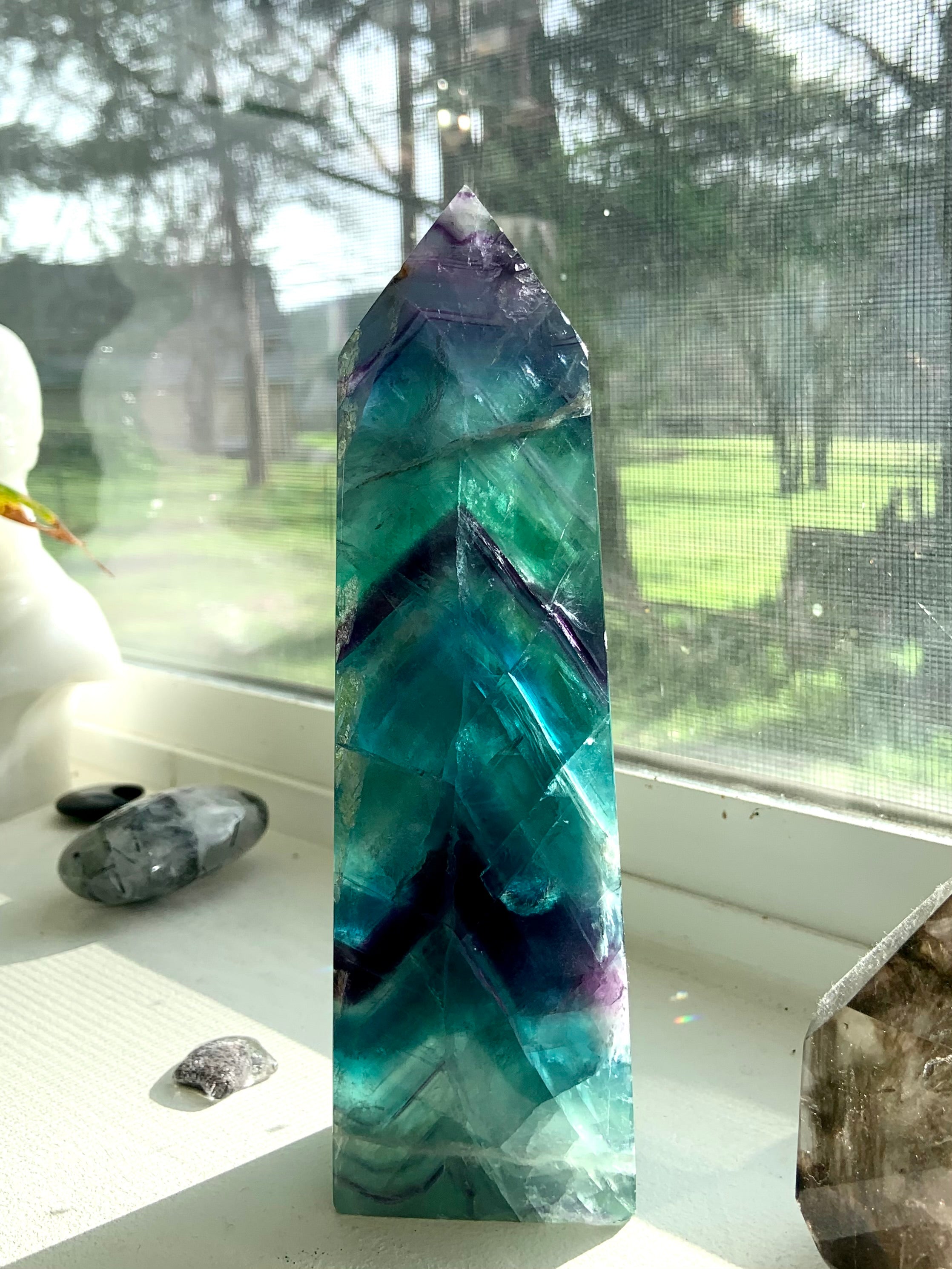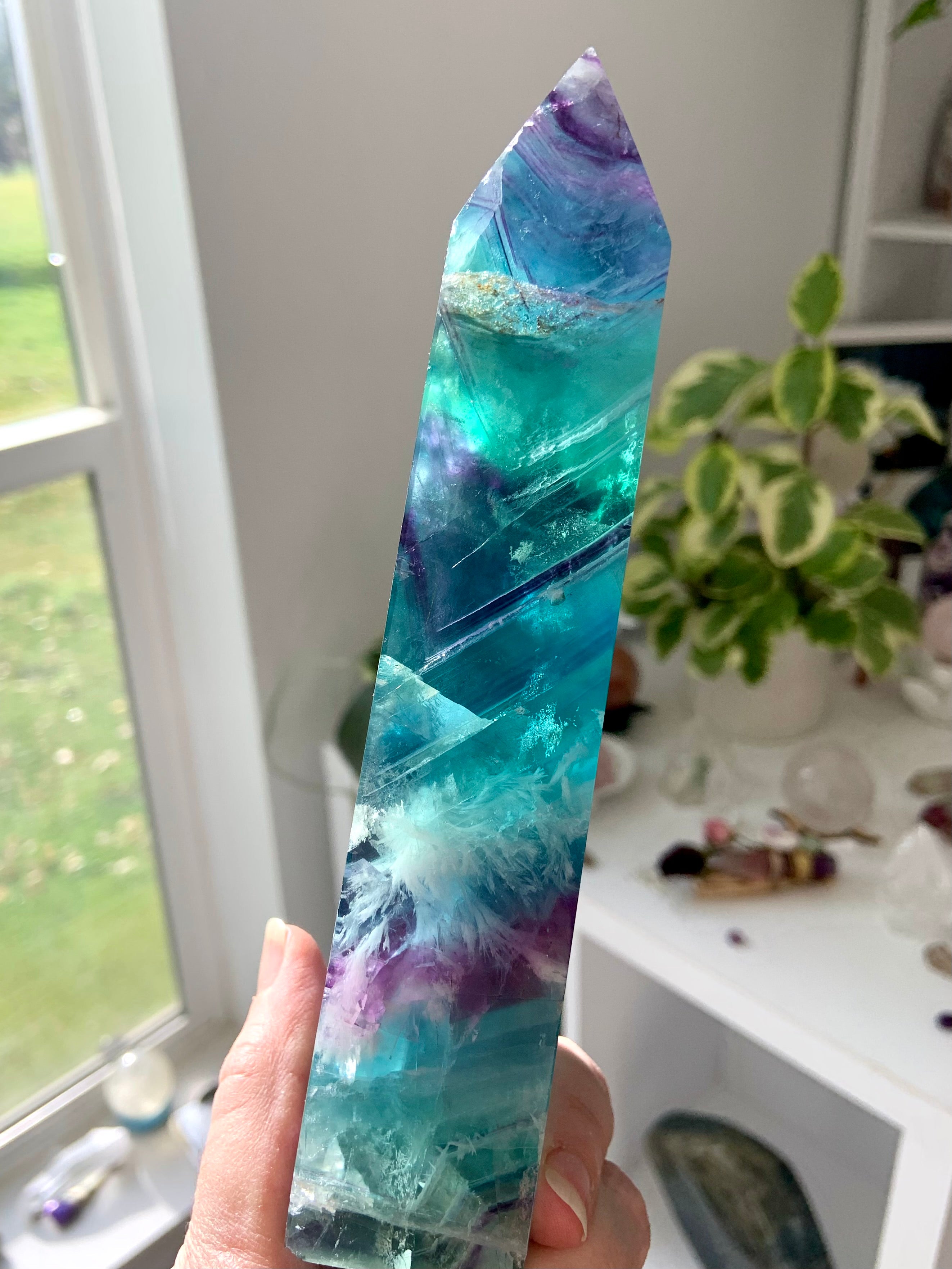 This stunning fluorite tower is cut + polished into a 4-sided obelisk shaped tower. There are a couple of unsmooth spots in the areas where natural cracks are visible. There is a small dendritic inclusion you can see in the first pic + a small natural cave on the tip that you can see in the last pic.