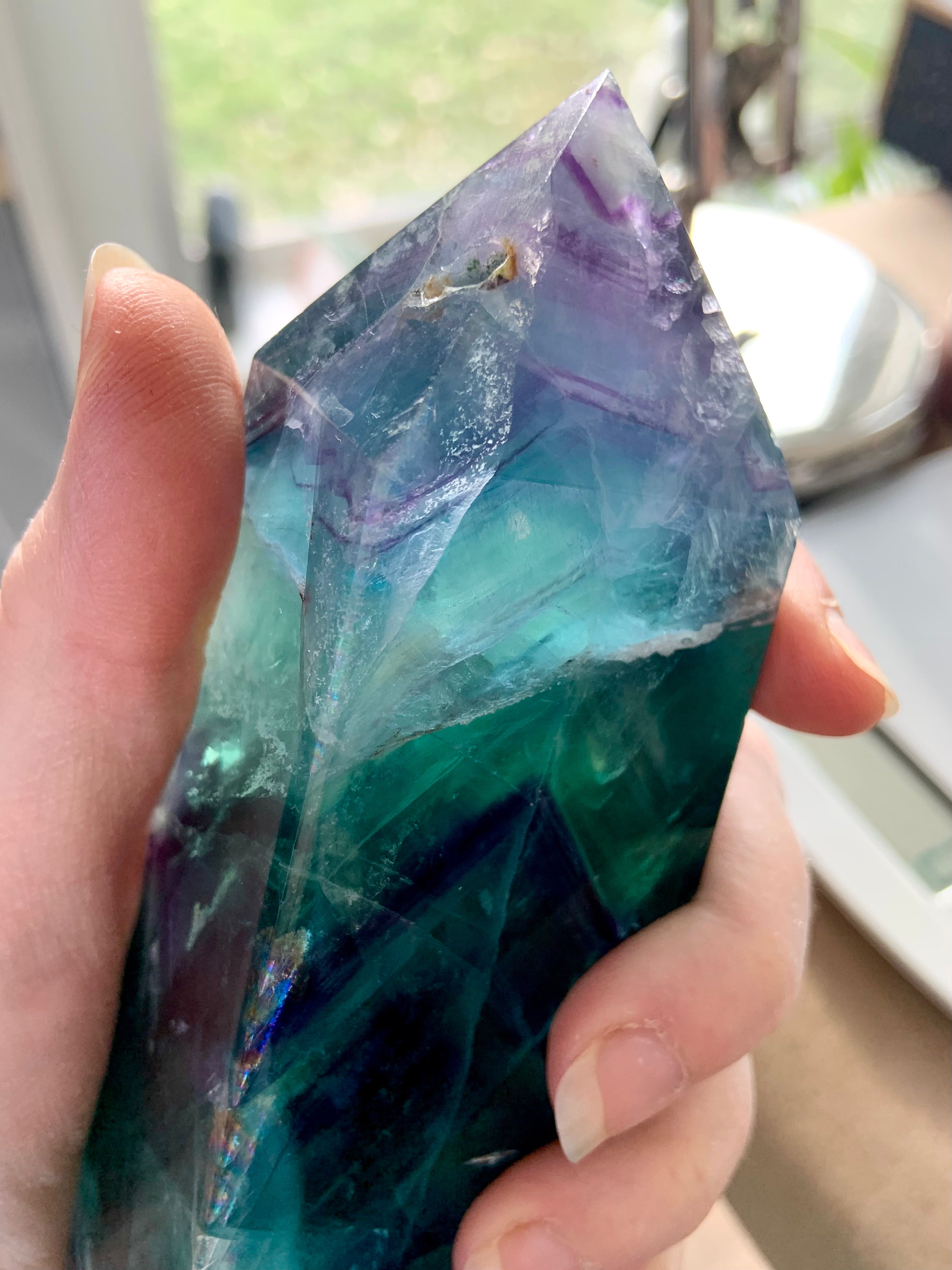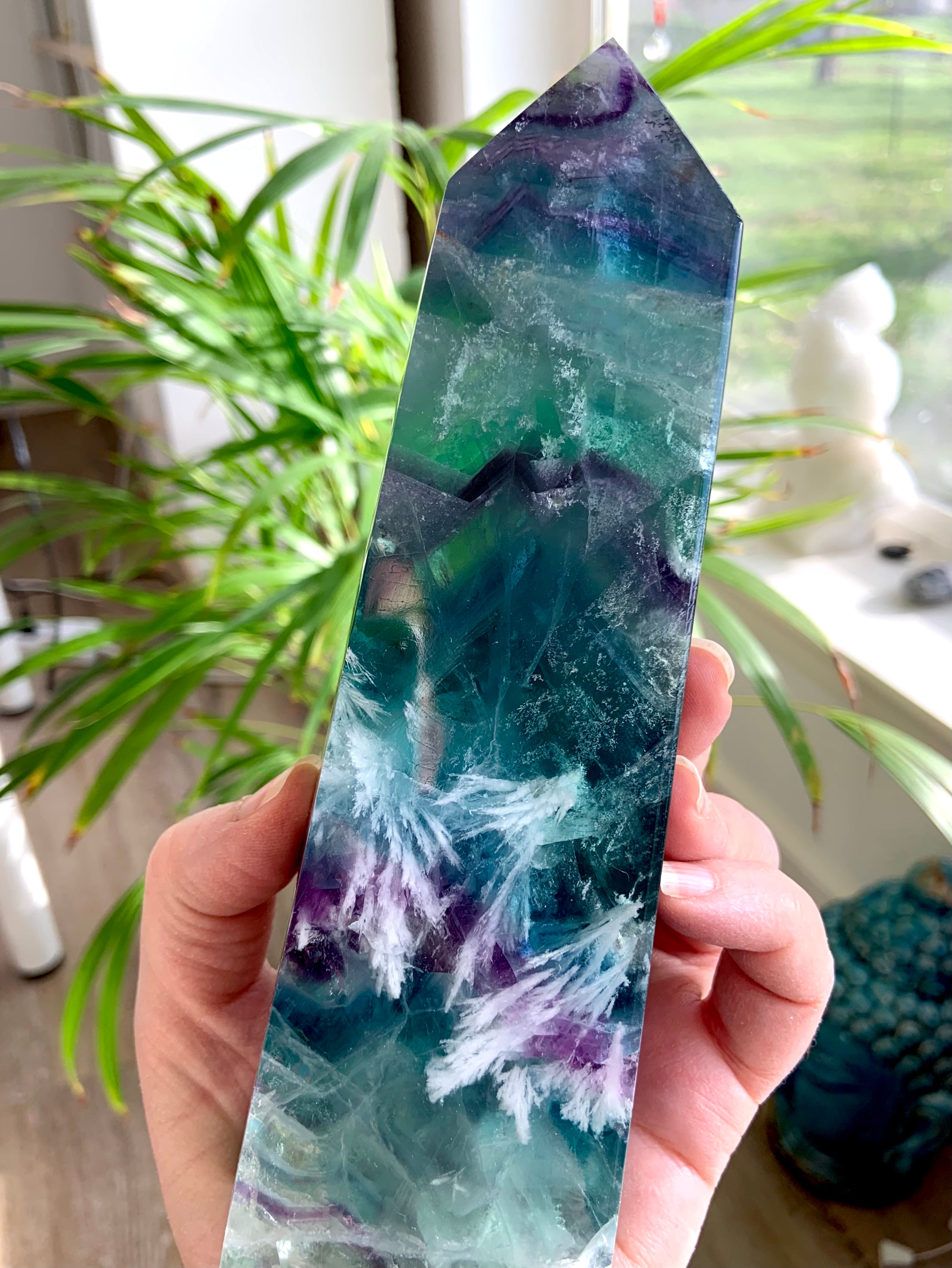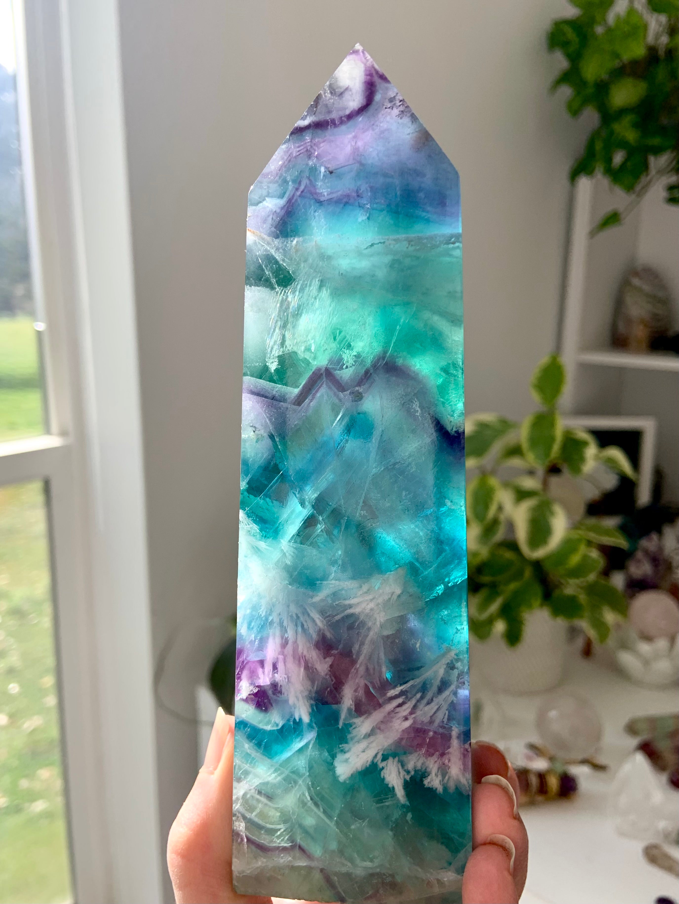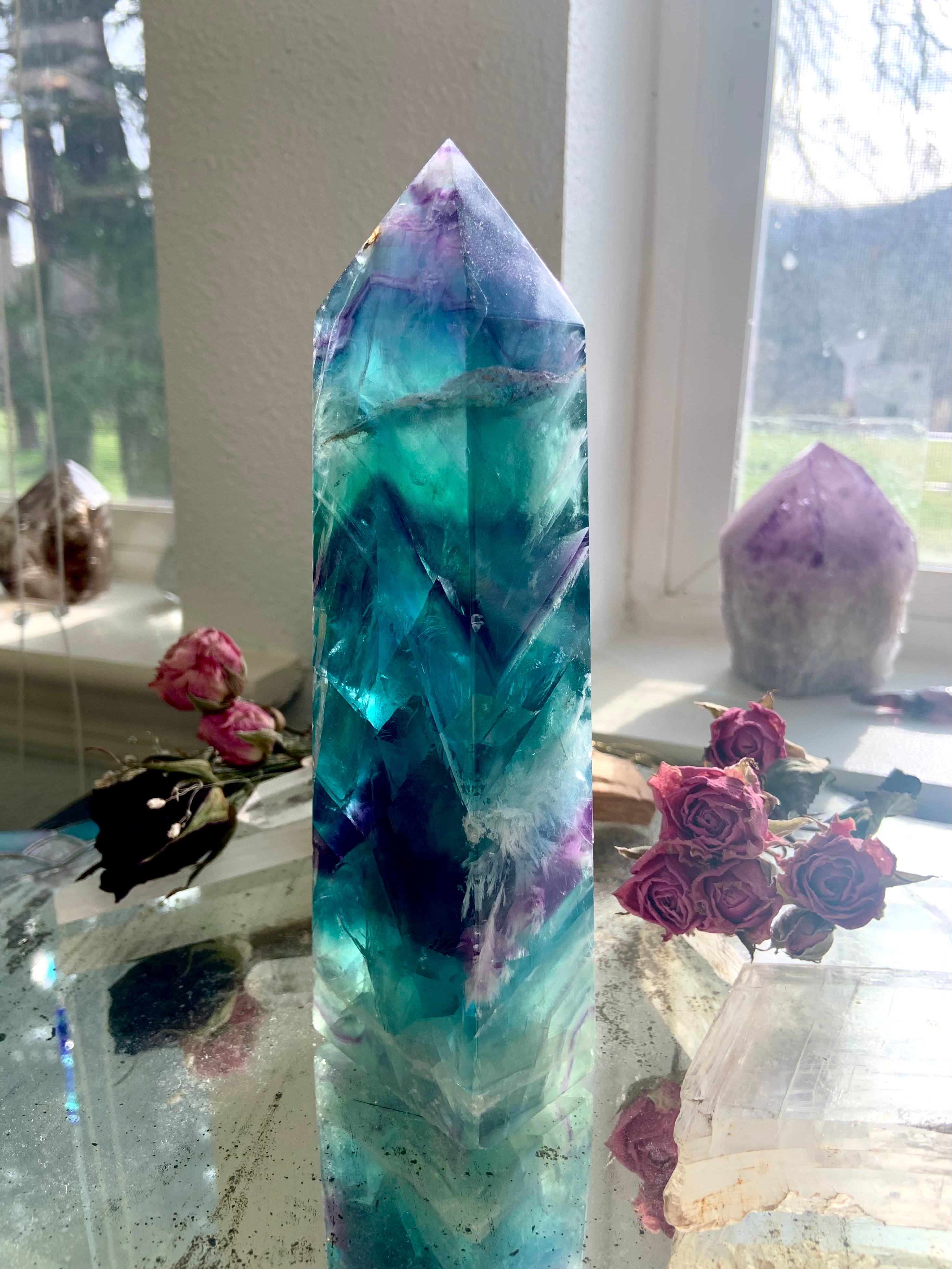 This stunning fluorite tower is cut + polished into a 4-sided obelisk shaped tower. There are a couple of unsmooth spots in the areas where natural cracks are visible. There is a small dendritic inclusion you can see in the first pic + a small natural cave on the tip that you can see in the last pic.