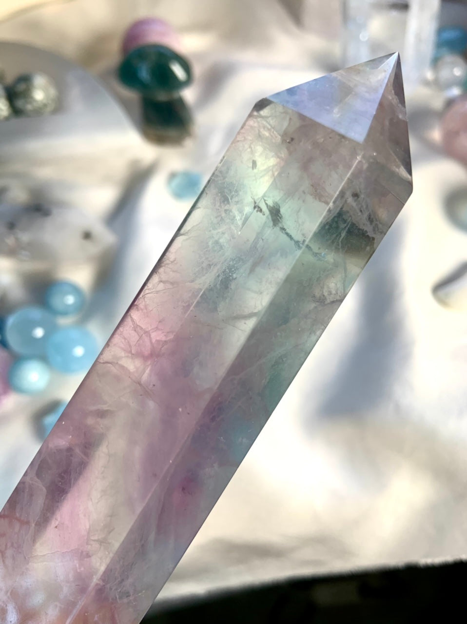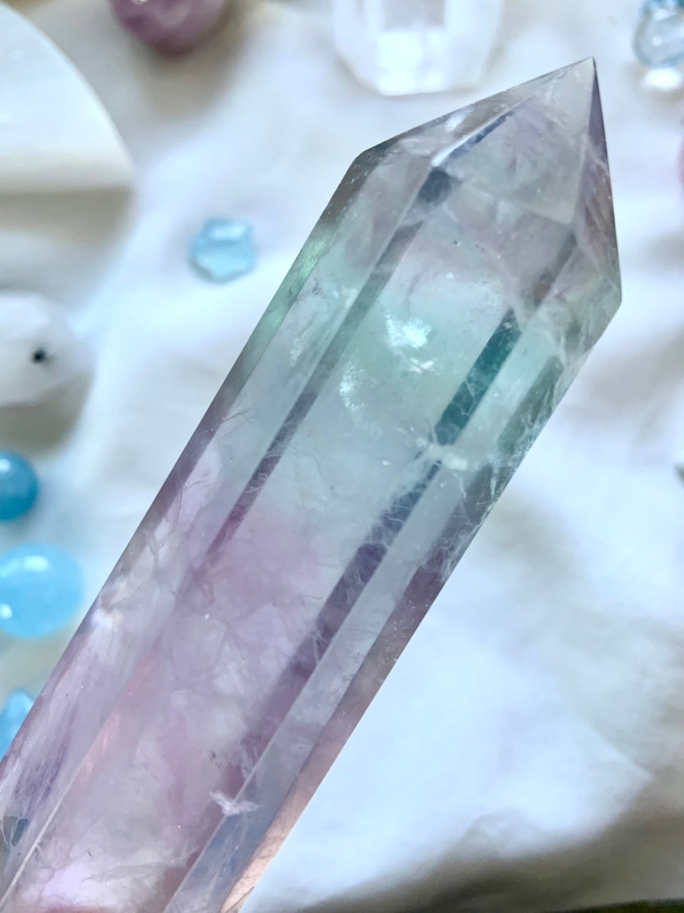 This polished fluorite tower is a true collector's item + will make a gorgeous statement piece in your crystal collection + elevate your sacred space with it's crystal energy + peaceful vibrations.