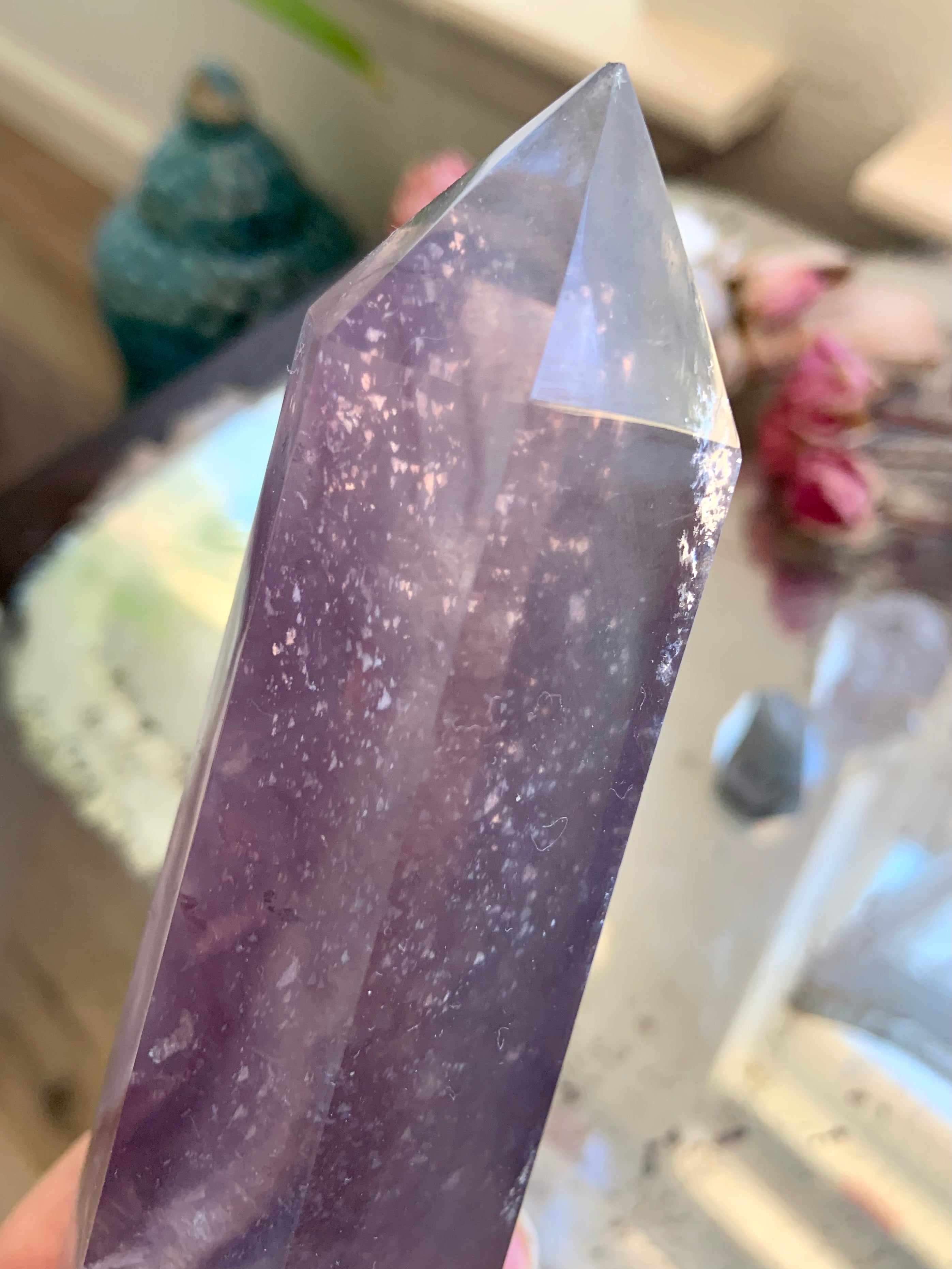 Purple Fluorite brings Peace, Bliss, Calm + Positive Vibes into your sacred space. Fluorite crystals have a grounding + harmonizing spiritual energy. Fluorite with mica inclusions bring an element of reflection into your personal + spiritual growth.