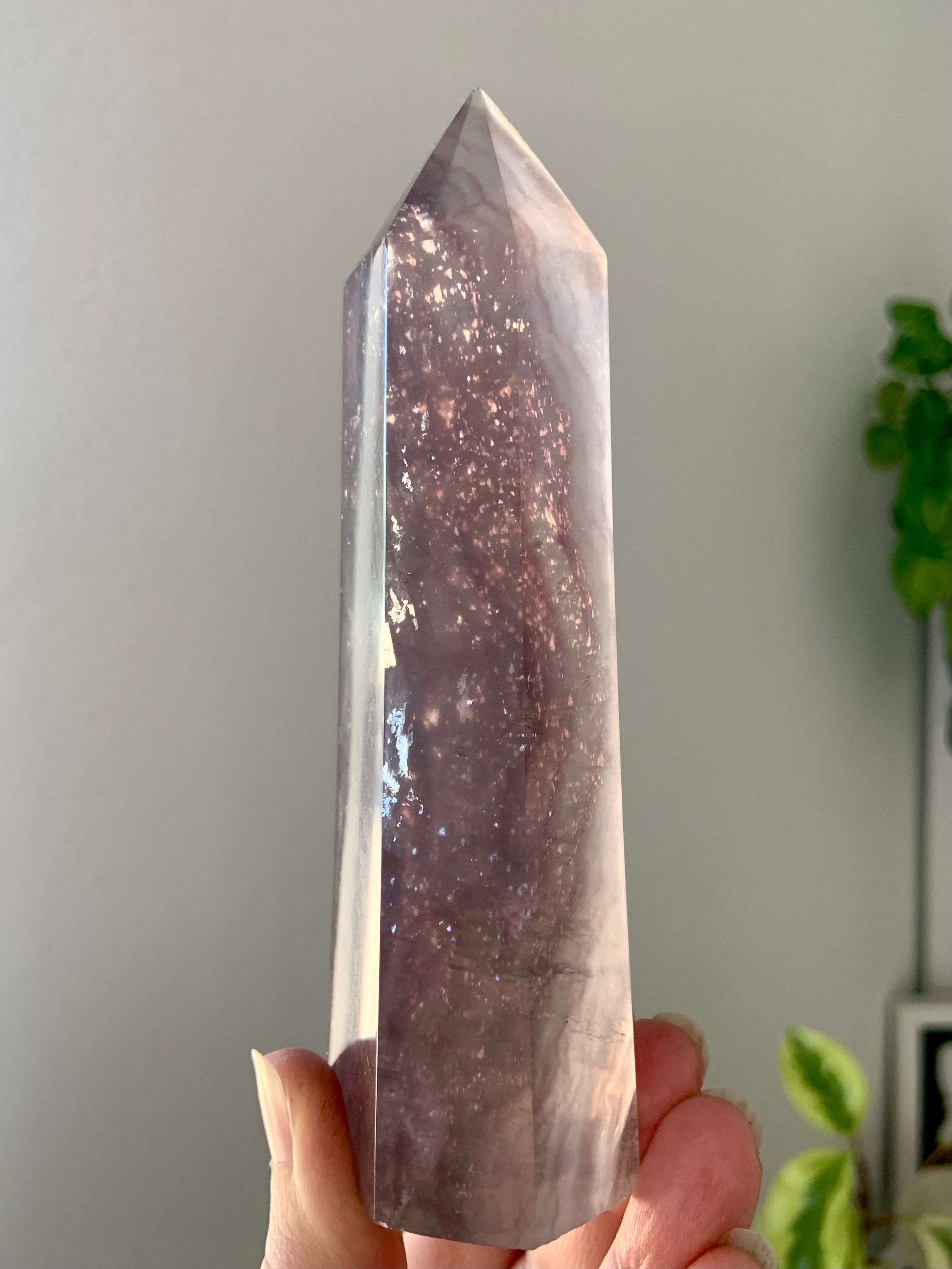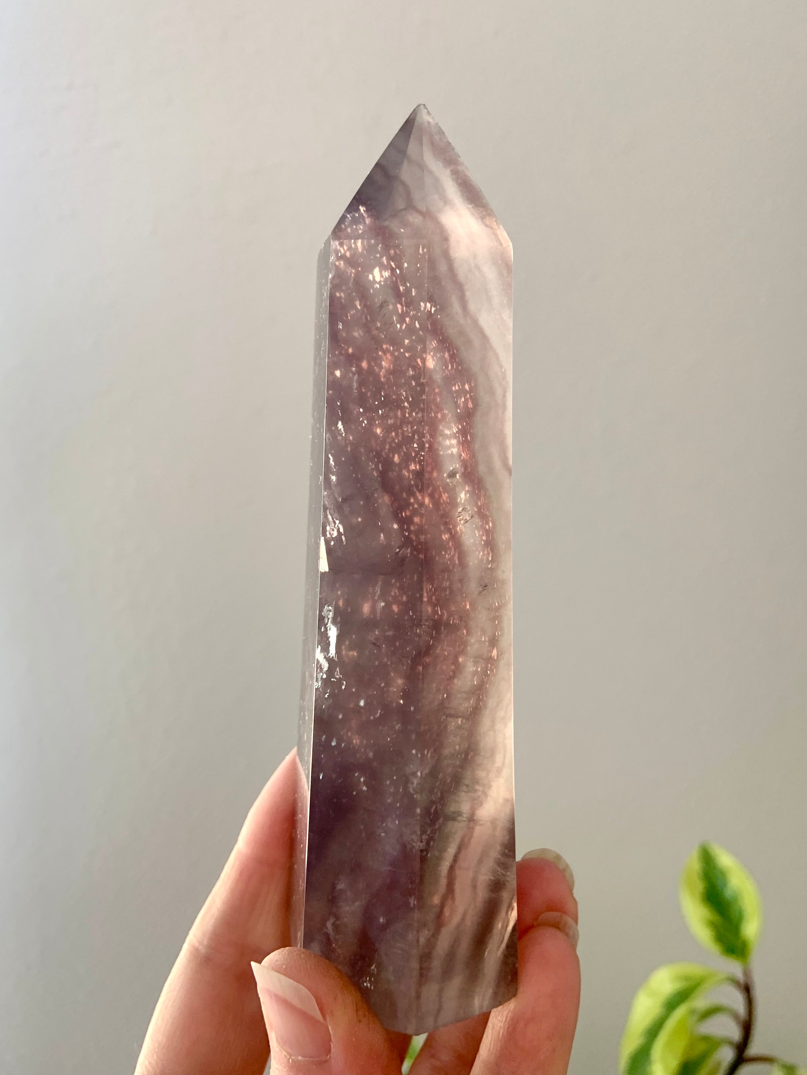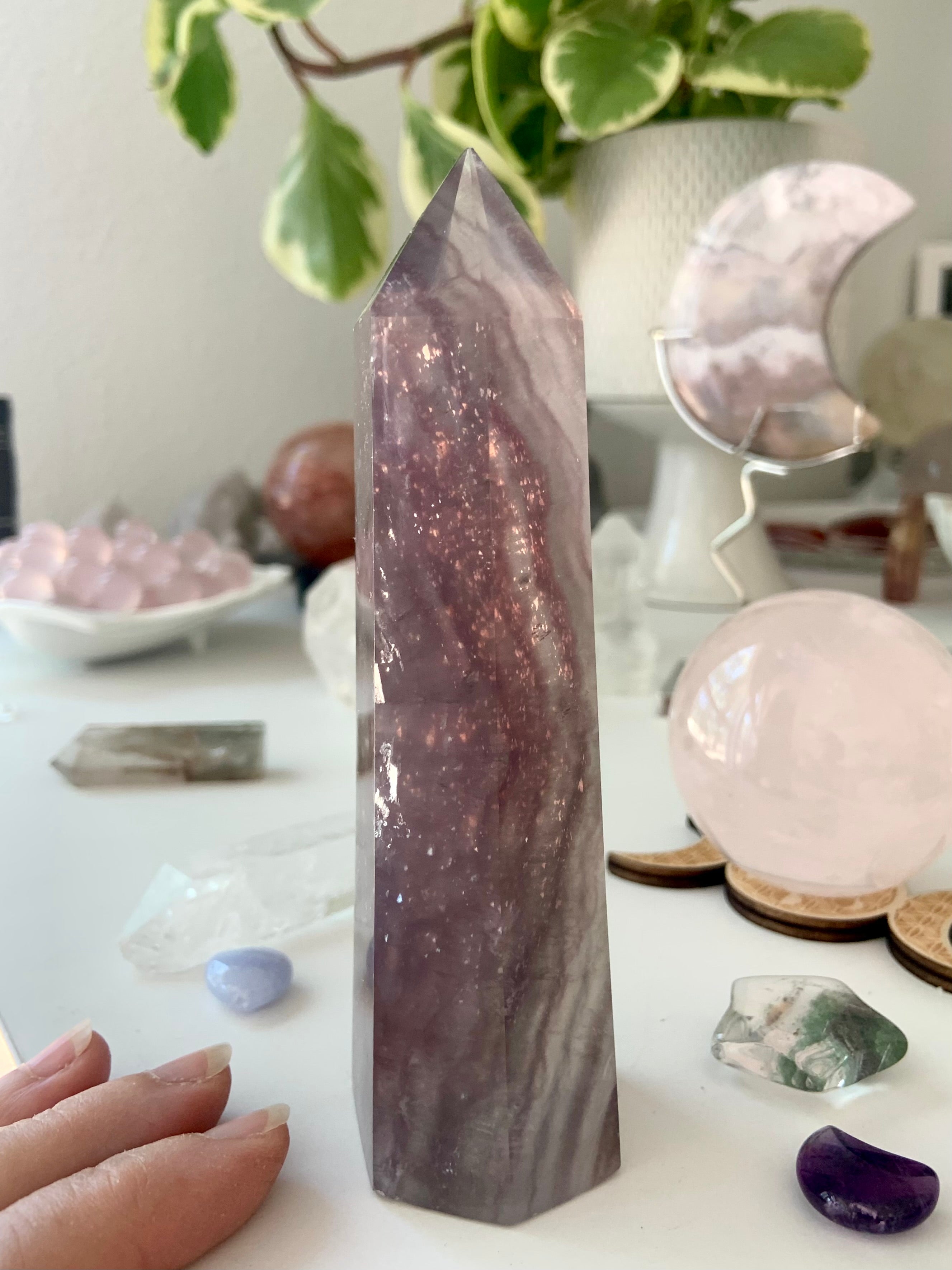 This gorgeous Lavender Fluorite with Mica Crystal Tower has a spectrum of undulating mauve + purple color banding, contrasting ribbons of light, shimmery flecks of mica inclusions highlighting the luminous, ethereal patterns within the stone.