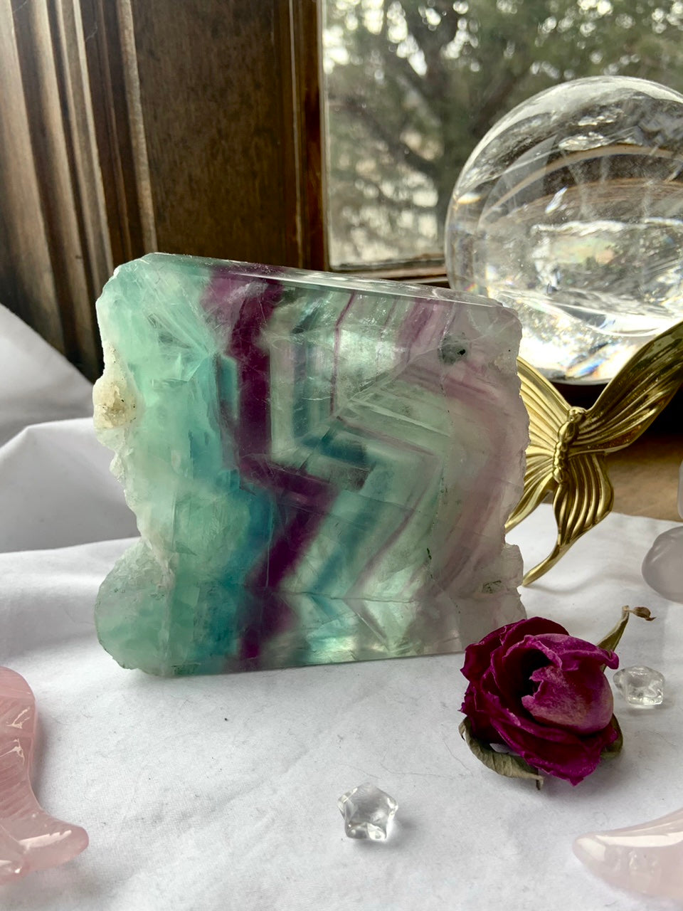 This fluorite crystal slab has a beautiful translucence that captures the light in such a magical way. The distinct banded color stripes follow the vertical form of the natural stone edge.