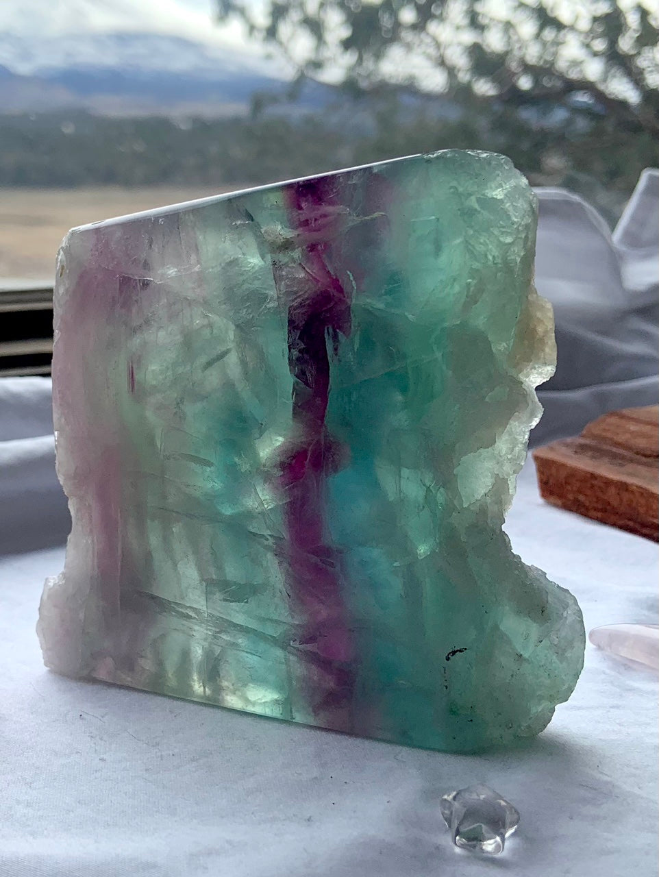 This gorgeous Lemurian Teal Fluorite Slab offers a peaceful, blissful + calming vibration. The dreamy combination of blue green, teal + purple with beautiful zigzag pattern following the vertical form of the bubbly natural edge, lots of flashy interior patterns + a few flashy little rainbows too.
